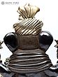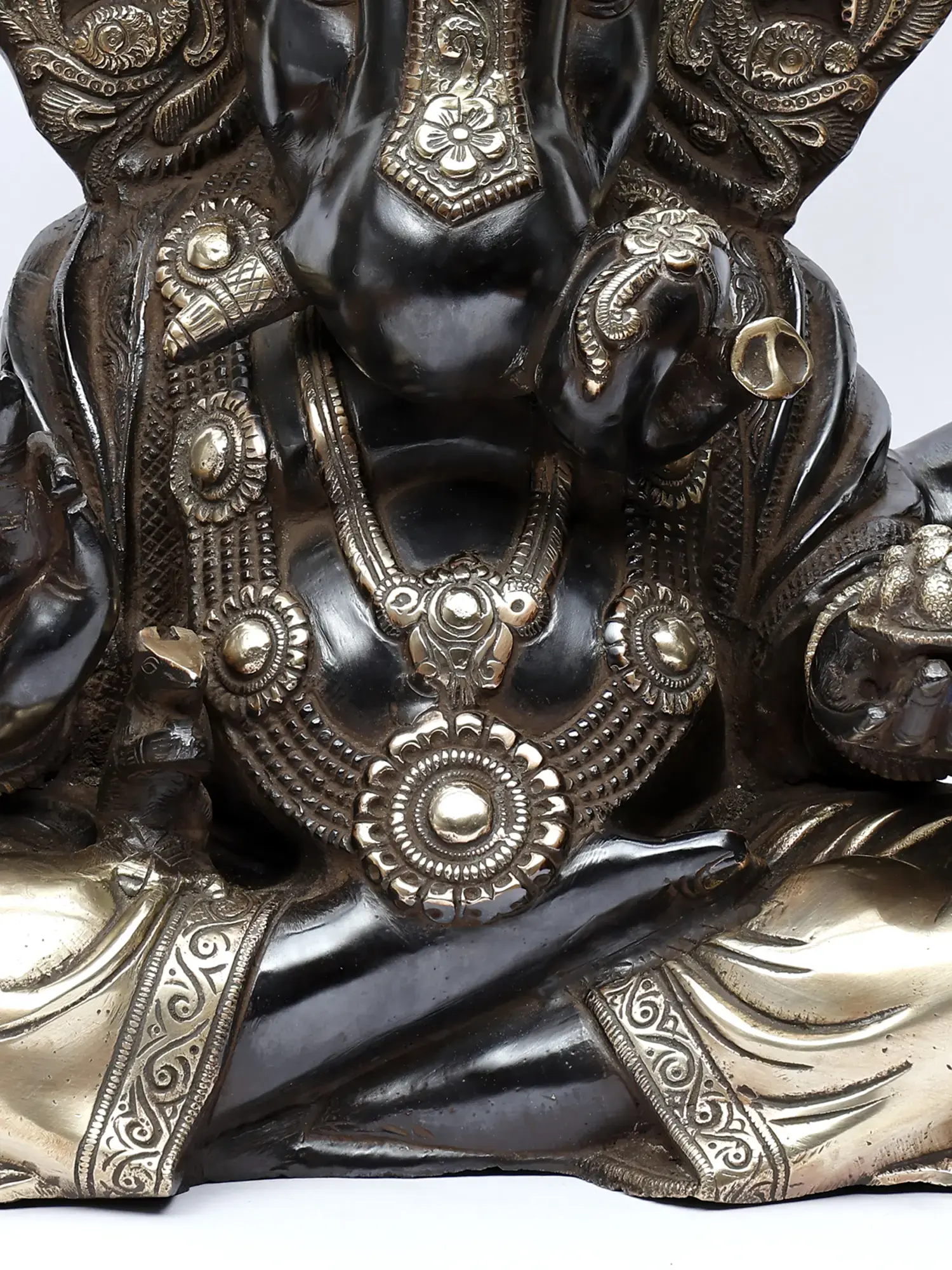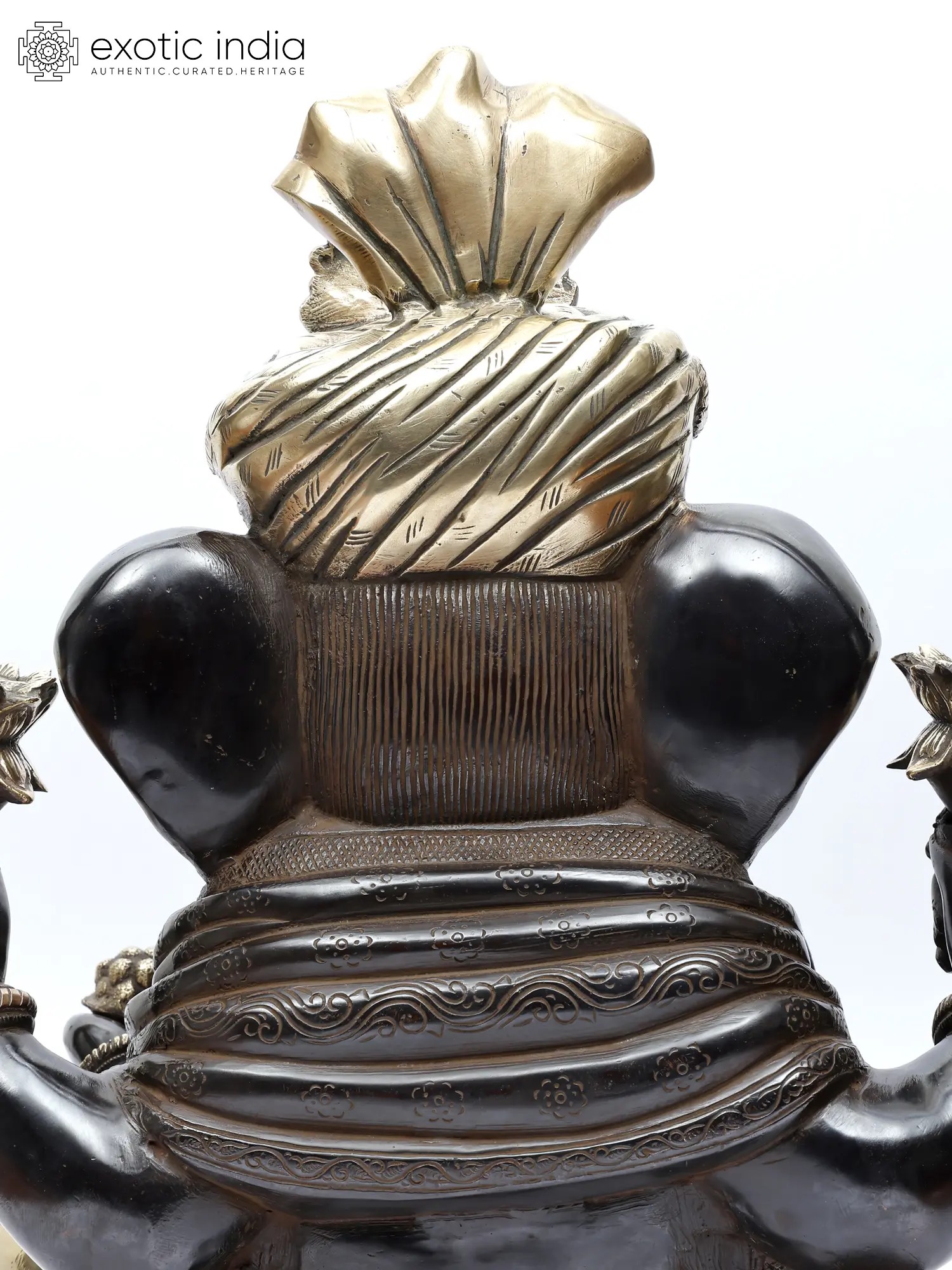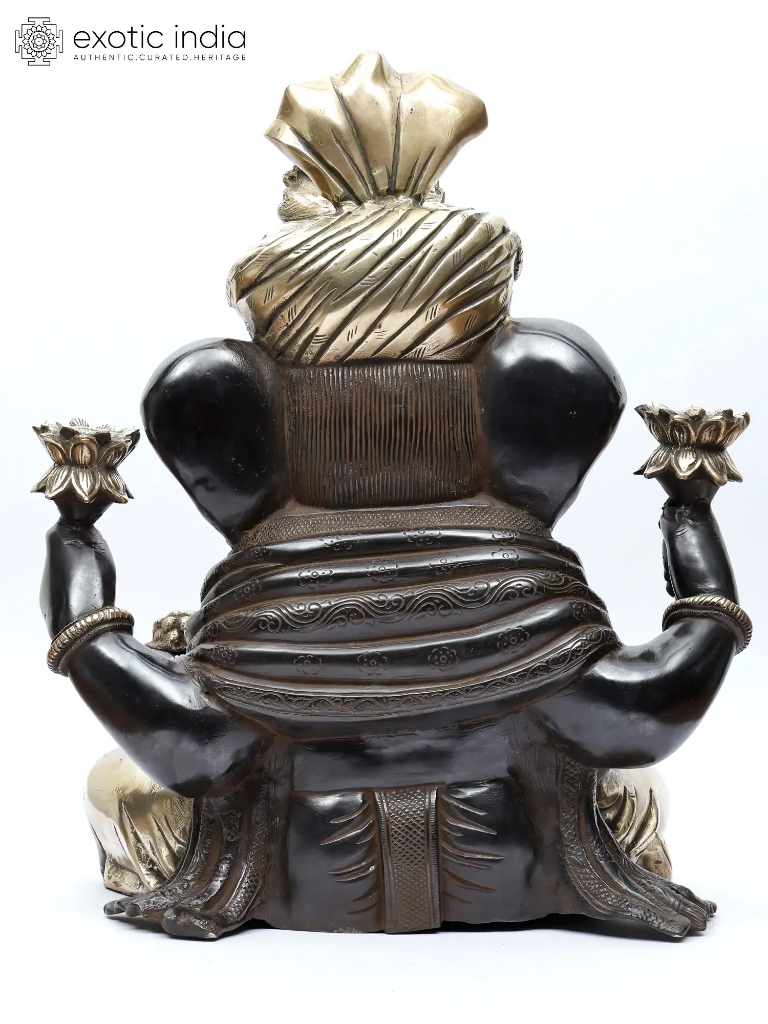 Lord Ganesha emerges as an embodiment of grace and wisdom, crowned with a majestic turban that seems to touch the heavens. Clad in opulent attire adorned with celestial jewels, Ganesha, the harbinger of Success, sits serenely in the eternal grace of “Padmasana”. His divine form is a tapestry of enchantment. In his upper hands, delicate lotus blooms bloom, symbolising purity and enlightenment. The right hand, poised in the “Vitarka Mudra”, imparts wisdom and guidance, while a bowl of sweet cakes rests gently in his divine palm, offering the sweet nectar of life’s blessings. His coiled trunk, a symbol of infinite potential, embodies the profound mystique of Turban Ganesha, an embodiment of prosperity and wisdom.