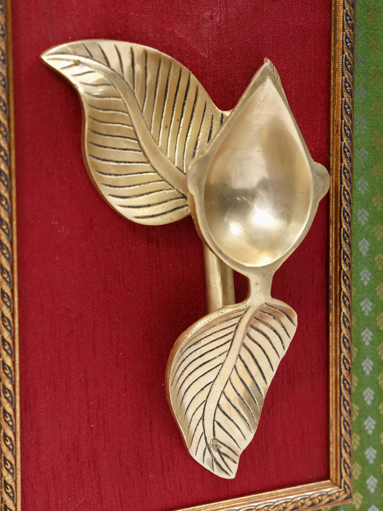 The meticulously crafted brass diya is nestled within an inner frame of rich teal fabric against a backdrop of vibrant red, creating a visually captivating contrast. This inner frame is then surrounded by a wider, light wood frame, creating visual depth and highlighting the craftsmanship involved. The subtle detailing on the frame and the intricate design of the brass diya highlight the attention to detail that makes this piece truly special. The elegant interplay of colors and textures is designed to resonate with a contemporary aesthetic while maintaining the time-honored essence of traditional Indian art. This wall-hanging diya is not merely a decorative item; it is a miniature masterpiece.