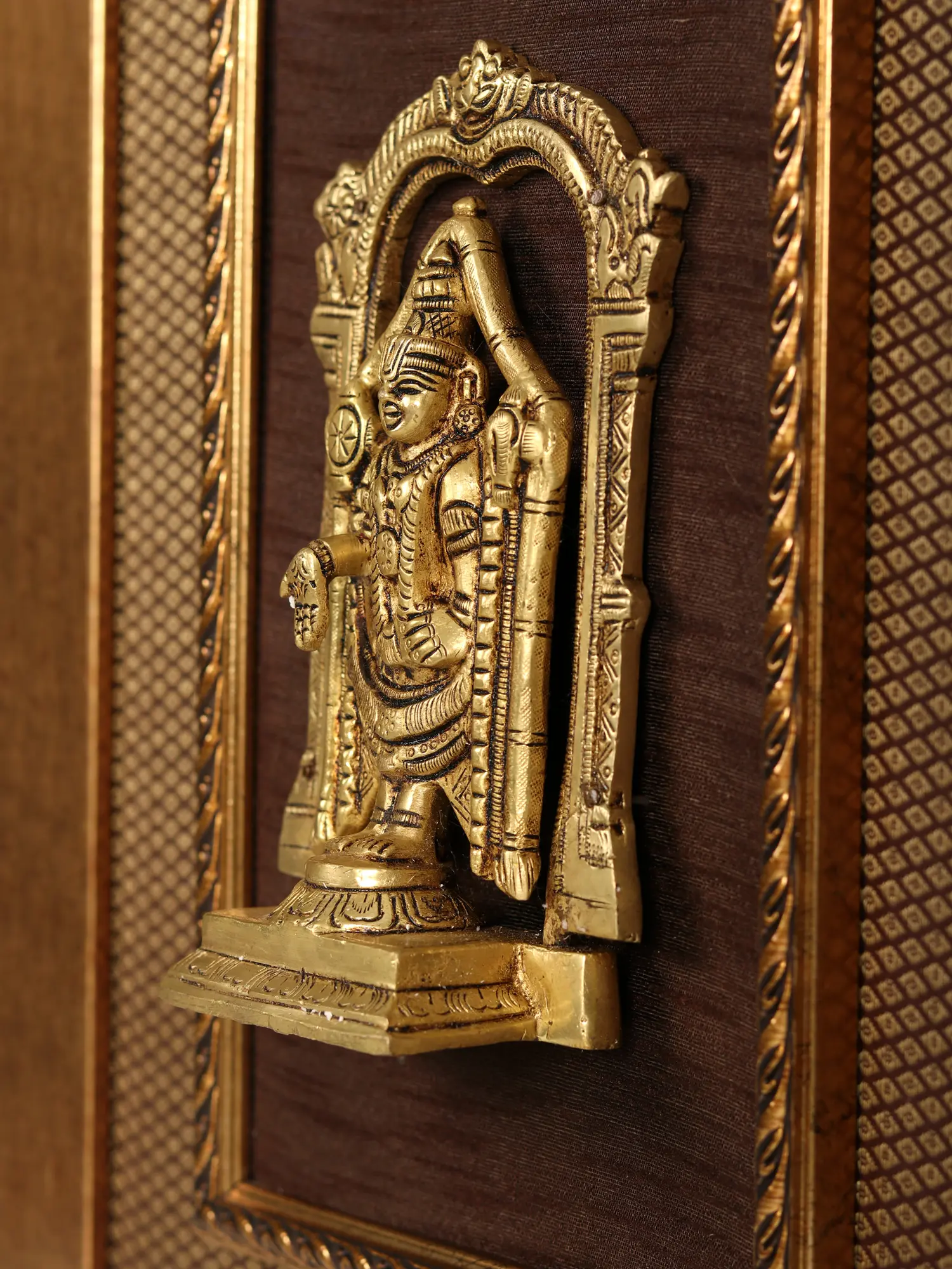 This wooden framed Tirupati Balaji wall hanging catches your eye and makes an impression on your thoughts. The center figure of Lord Balaji, which sits on the Kirtimukha throne, is pasted on a deep brown fabric backdrop that is complemented by a large amount of brown buta Banarsi cloth. The brown cloth combined with the buta fabric is the most gorgeous appearance ever. A wooden frame supports the entire item. The wall hanging's solidity and attractive appearance make it a must-have for persons with a spiritual bent.
