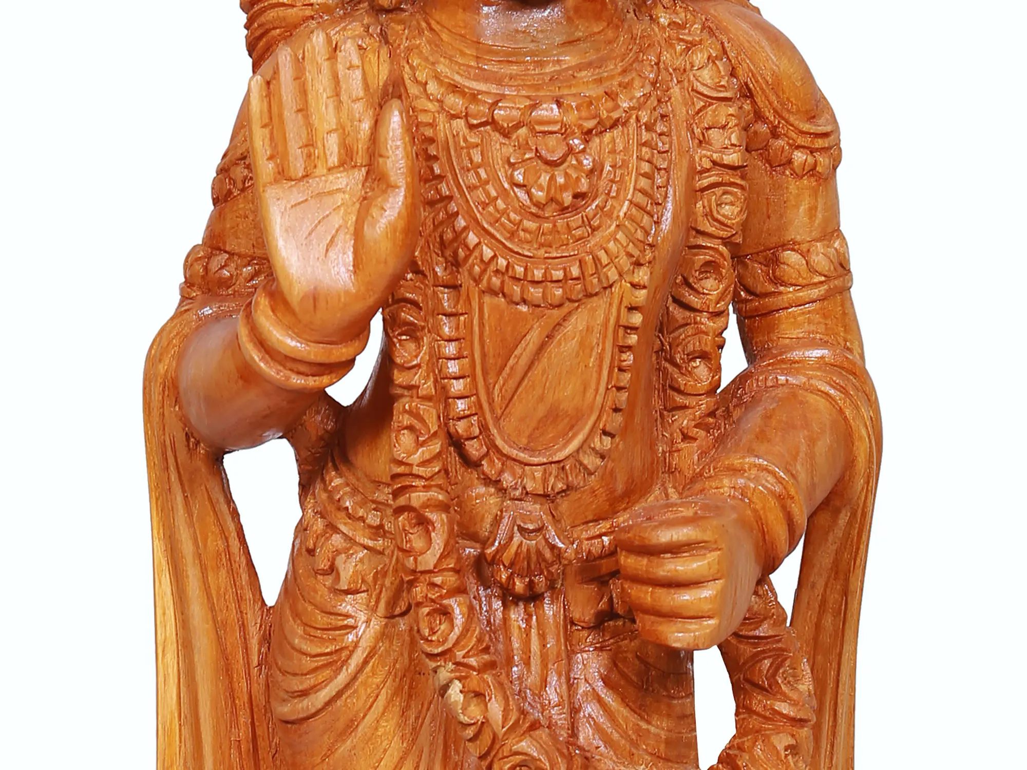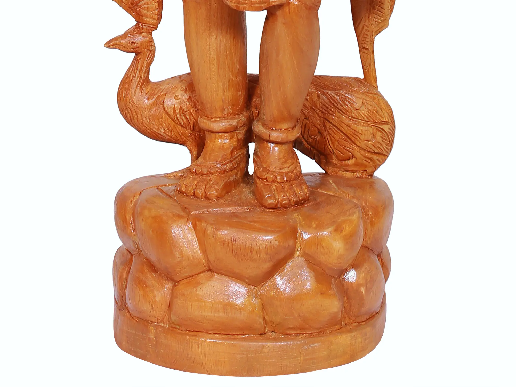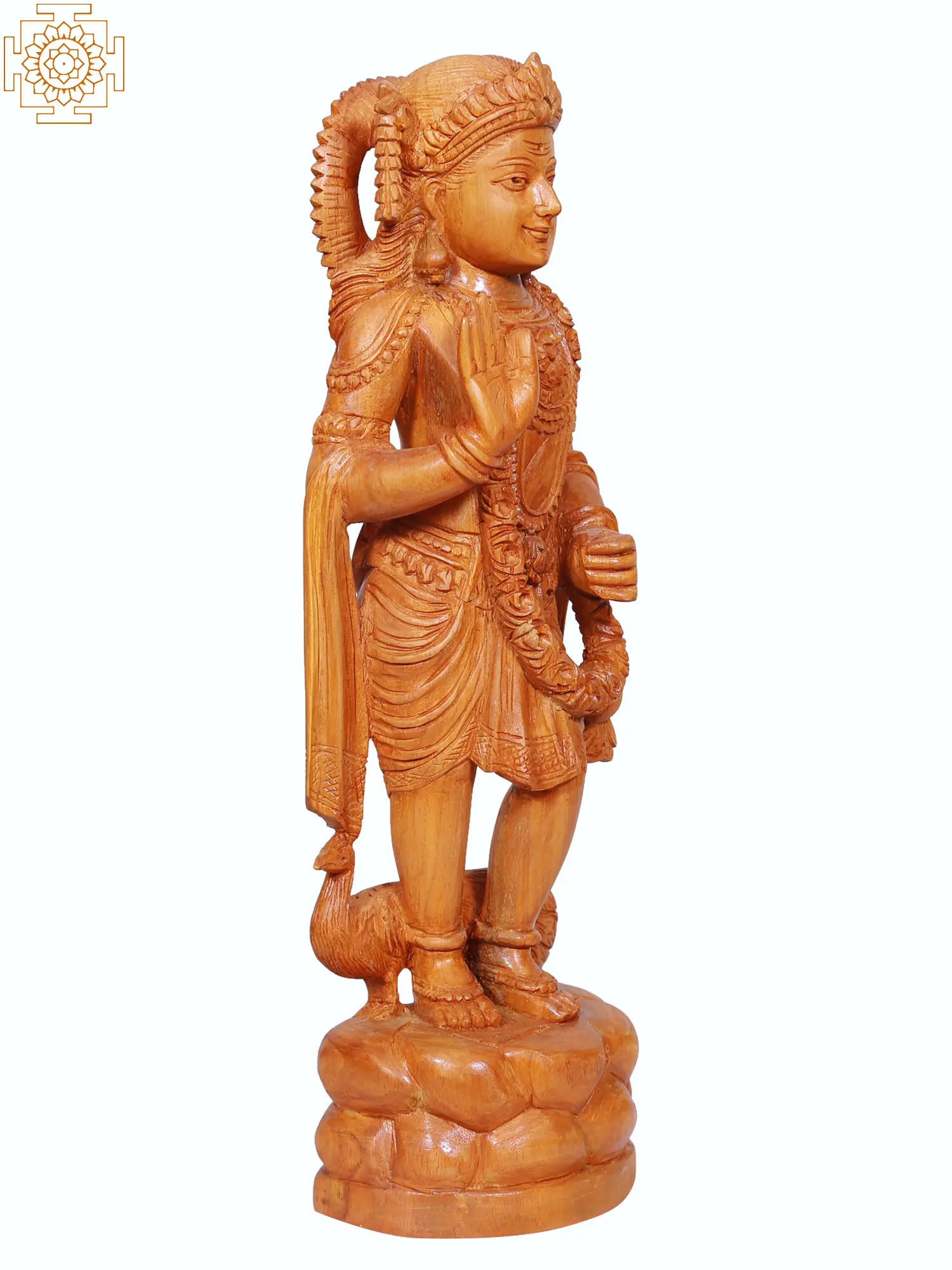 This exquisite wooden carving depicts Lord Kartikeya, the Hindu god of war, victory, and wisdom, in a commanding yet serene posture. Crafted from rich, durable teakwood, this 17-inch statue is a testament to the intricate artistry and spiritual devotion. Lord Kartikeya, also known as Skanda or Murugan, is revered for his courage, his role in defeating the demon Taraka, and his wisdom. He is the son of Lord Shiva and Goddess Parvati, embodying both immense power and divine grace. His youthful appearance in this carving reflects his eternal vigor and his role as the commander of the celestial armies. The god is adorned with ornate jewelry, including elaborate necklaces and armbands, each detail meticulously carved to showcase the craftsmanship. His divine garment flows gracefully, adding a sense of movement and elegance to the static form. In his right hand, he raises his palm in a gesture of blessing and protection, while his left hand gently holds a garland, perhaps symbolizing the floral offerings he receives or the victory he bestows. His serene expression and gentle gaze invite peace and contemplation. ––––––––––