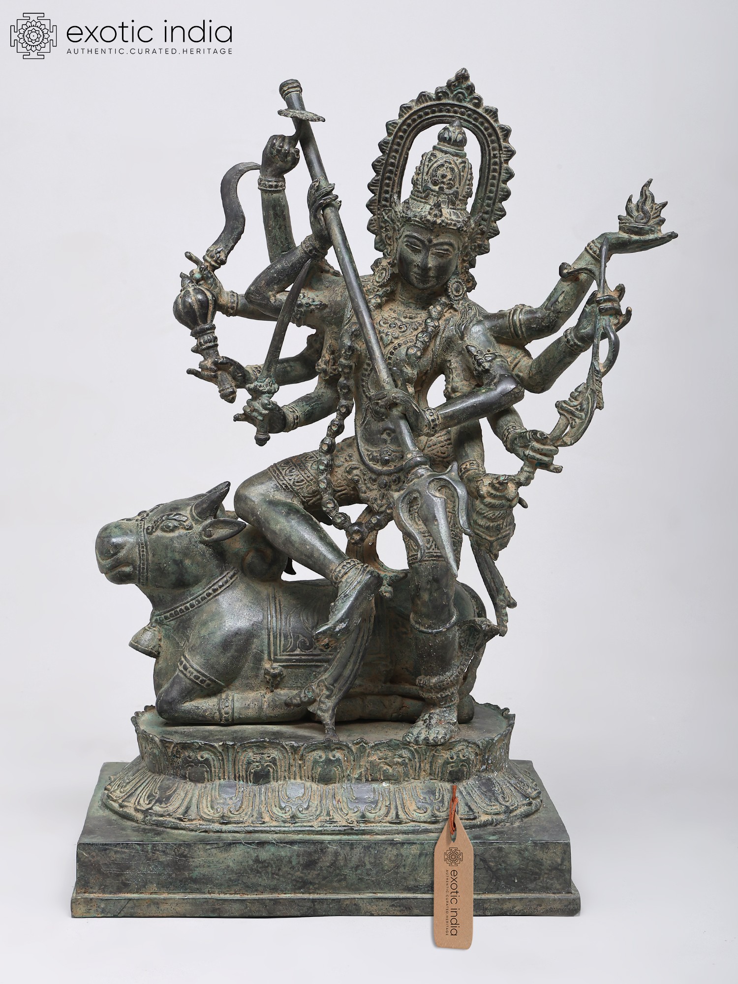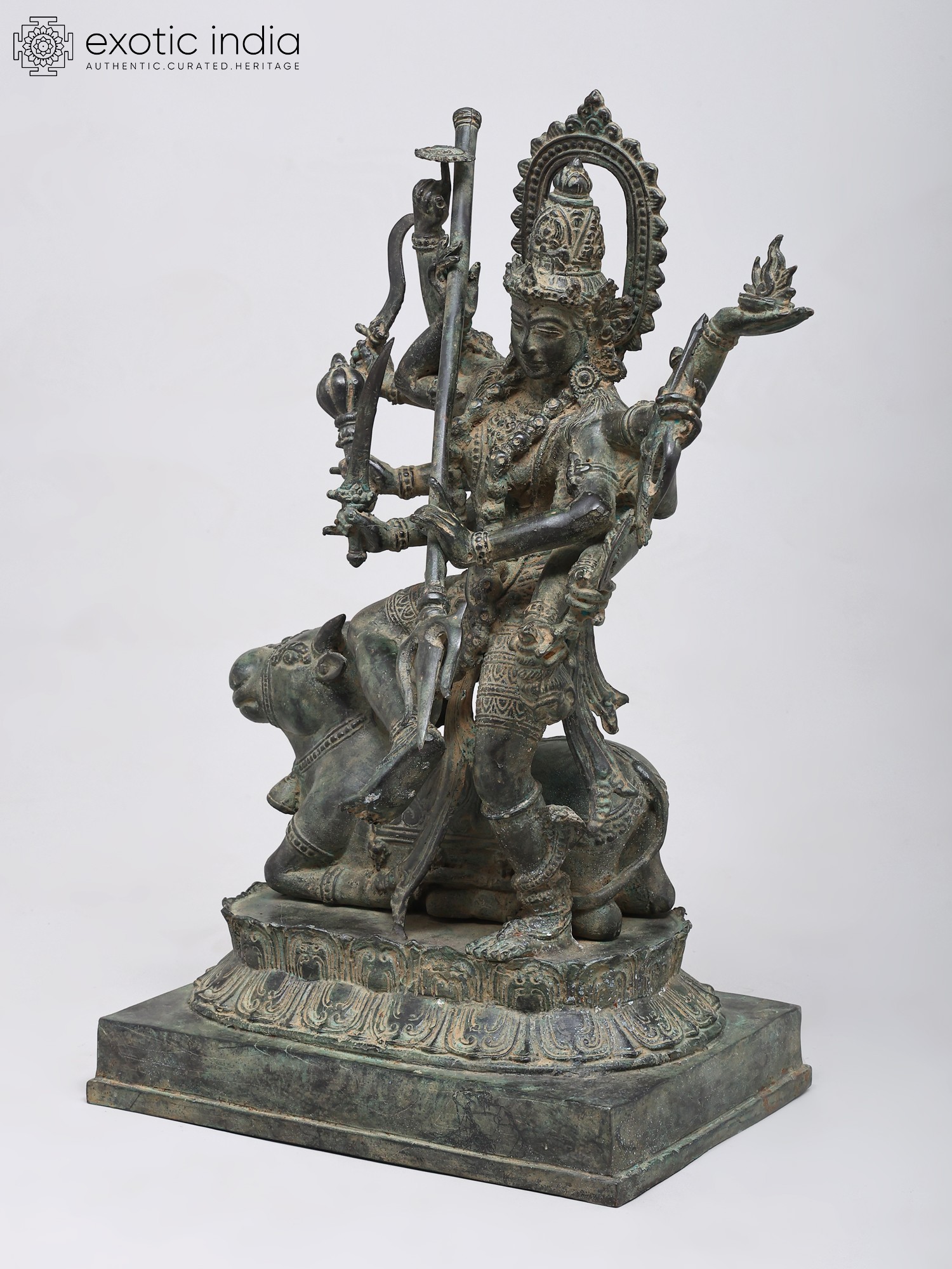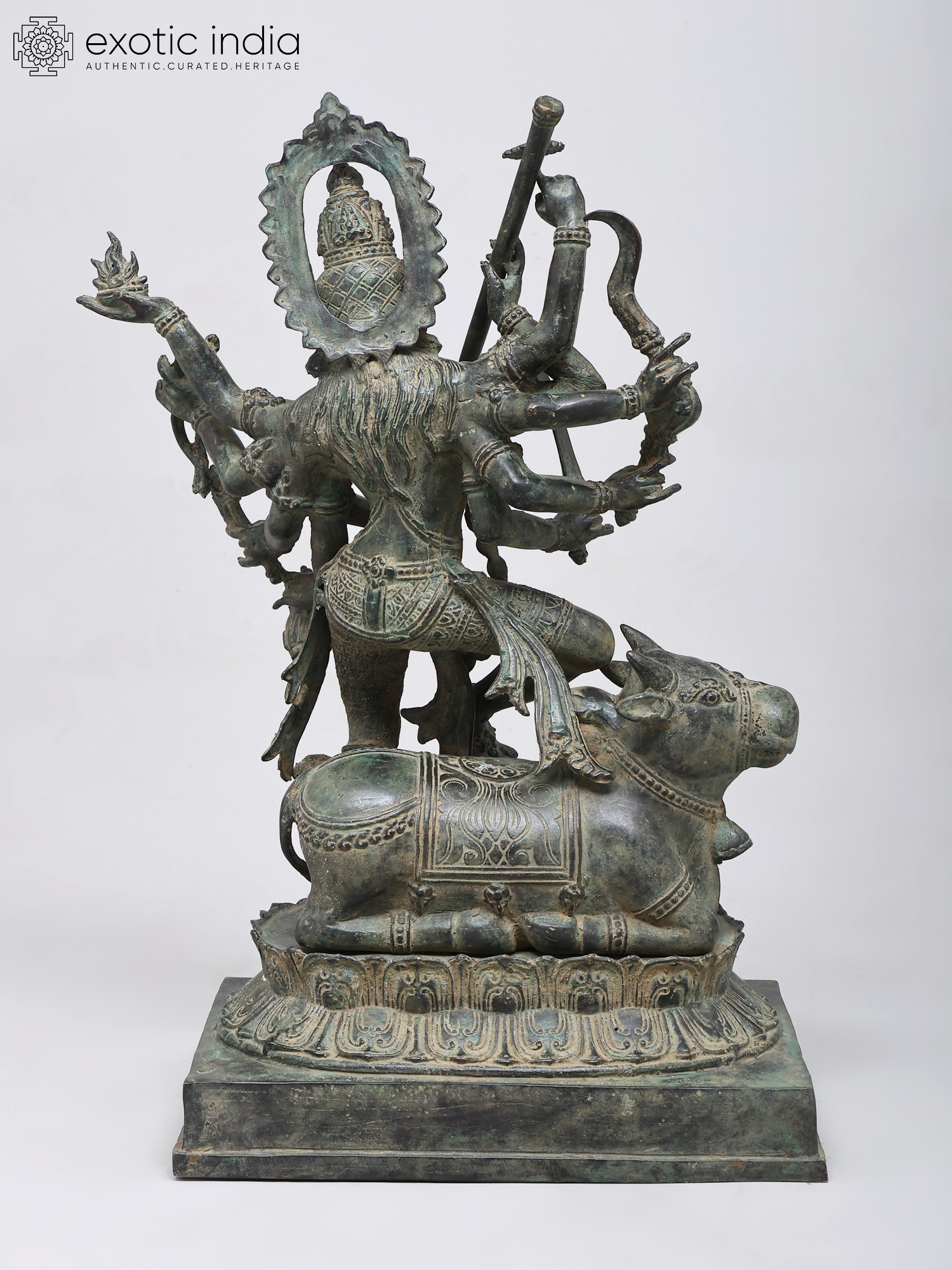 13" Goddess Bathari Durga with Bhairava Standing on Nandi In Brass | Handmade | Balinese Brass Statue