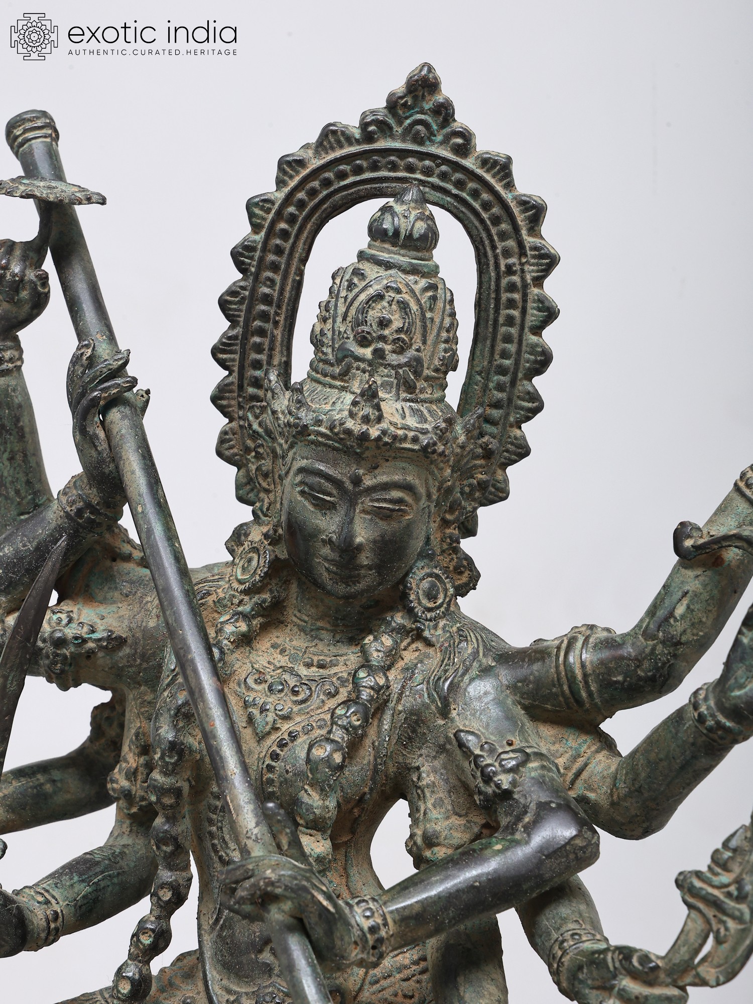 This magnificent brass statue captures the divine essence of Adishakti Durga, the primordial feminine energy and the supreme mother goddess in Hindu mythology. Depicted in her formidable form, she is the ultimate power that vanquishes evil and restores cosmic balance. Her presence commands reverence, embodying strength, courage, and unwavering protection for her devotees. The artistry of the lost wax method, a time-honored technique, brings this powerful deity to life with exceptional detail and a timeless patina. ––––––––––