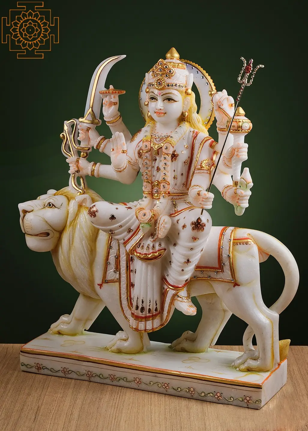 This statue is more than just an idol; it is a work of art. The pure white marble has been meticulously carved and polished to a luminous finish, enhancing the divine aura of the Goddess. Delicate gold accents adorn her garments and embellishments, catching the light and adding a touch of celestial splendor. The intricate details of her facial features, the flowing drapery of her attire, and the powerful musculature of the lion all speak to the exceptional talent of the artisans who brought this divine form to life. The serene expression on Durga's face, radiating compassion and strength, is particularly captivating, drawing the devotee into a moment of profound connection. The inclusion of the decorative base, adorned with floral motifs, further elevates the aesthetic appeal of this magnificent creation. This Ambe Maa murti is destined to become a focal point of devotion and a cherished heirloom for generations.