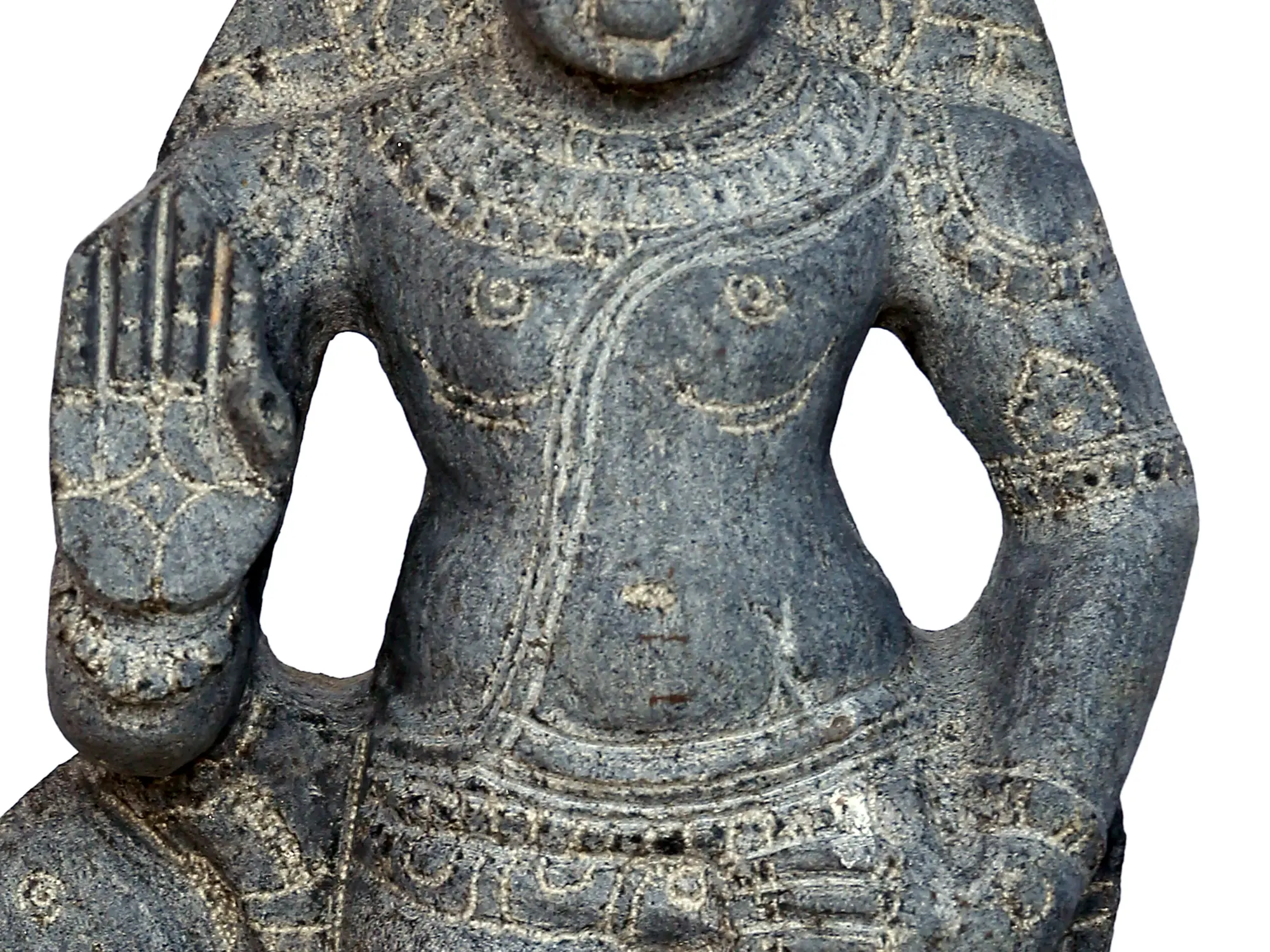 The statue, made of granite stone, has incredible details, from his glowing expression and rich jewelry to the complex decorations on his clothing.