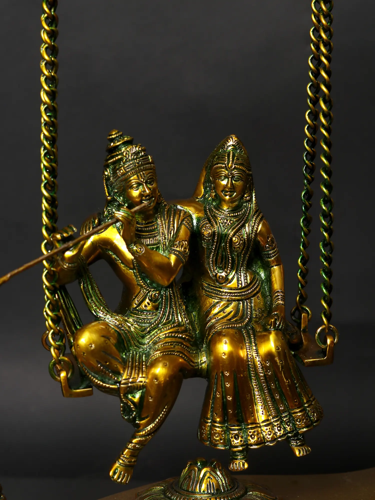 This enchanting piece radiates the eternal love of Radha and Krishna, who sit gracefully on a captivating peacock swing. Their tender embrace and captivating expressions capture the essence of their love story. Radha's devotion and Krishna's divine charm come to life in this intricately crafted brass statue.