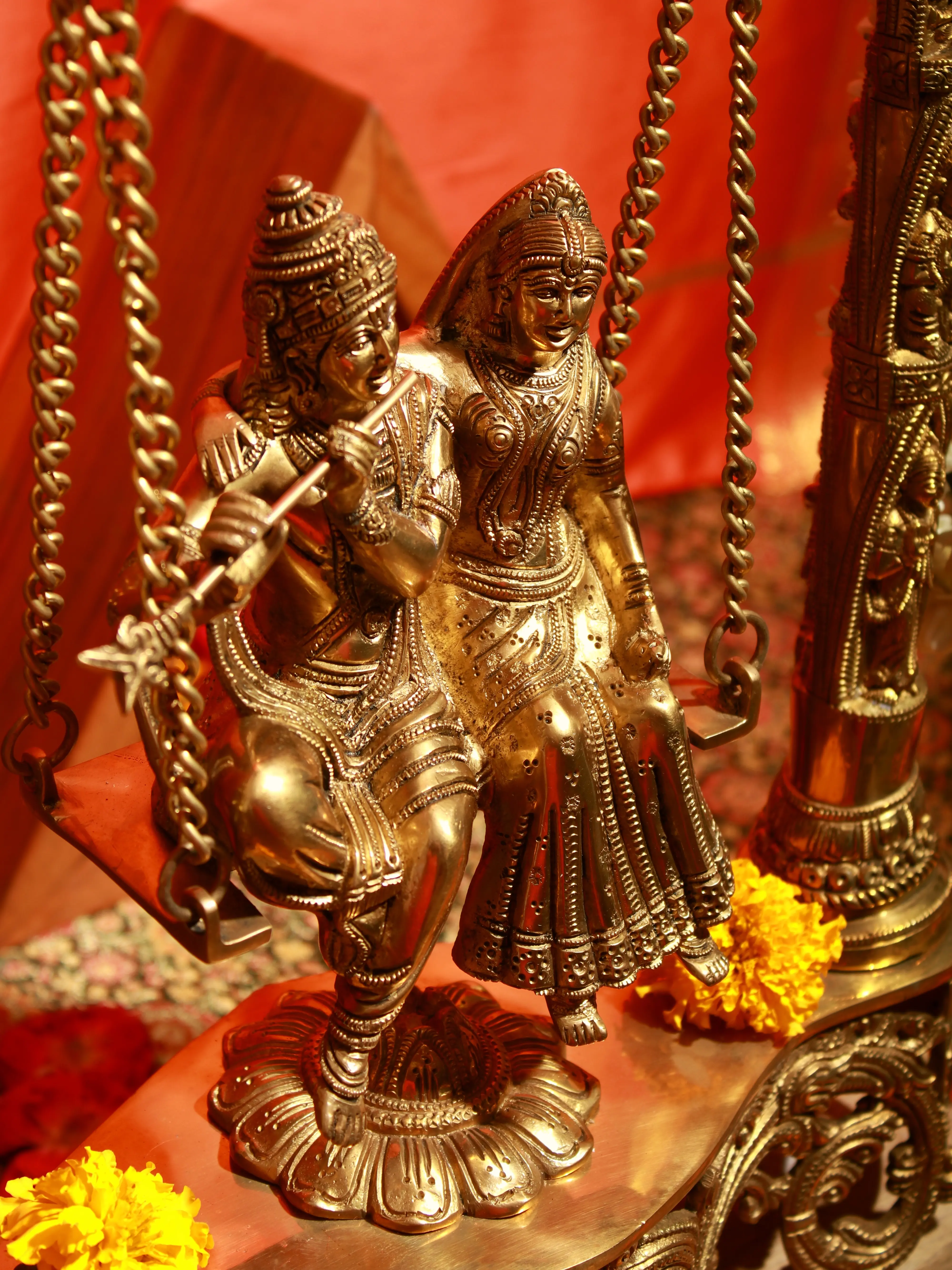 The peacock swing adds a touch of whimsy to the piece, symbolizing Lord Krishna's playful nature. Bring home this masterpiece to infuse your space with love, devotion, and the timeless allure of Radha and Krishna's divine romance. Let their love story inspire and captivate your heart.