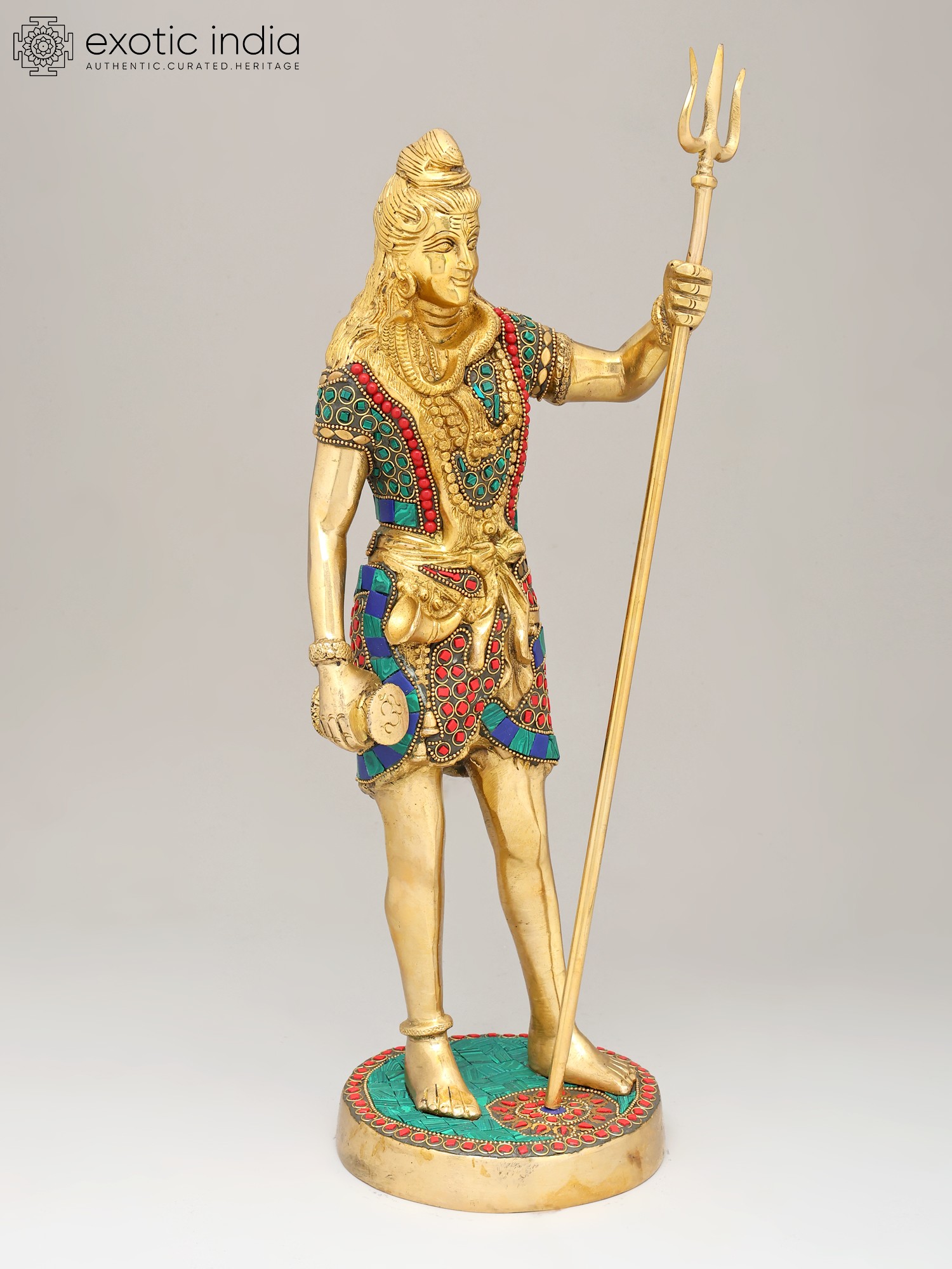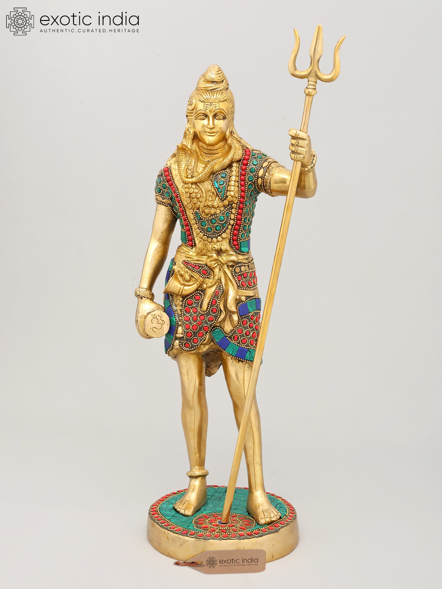 What truly elevates this depiction of Shiva is the intricate inlay work that adorns his vestments and the circular pedestal upon which he stands. Vibrant hues of turquoise and coral red, artfully arranged, create a stunning contrast against the warm gleam of the brass. This gemstone inlay is not merely decorative; it symbolizes the cosmic energies and the jewels that adorn the celestial realms. The meticulous placement of each stone speaks to the dedication and precision of the craftsman, transforming the sculpture into a vibrant tapestry of divine artistry. Shiva is shown holding his iconic trident, the Trishul, in his right hand, representing the three gunas (Sattva, Rajas, Tamas) and his mastery over them. In his left hand, he holds a Kapala, a skull cup, symbolizing his detachment from the material world and his association with cremation grounds, a reminder of the transient nature of existence. The deity's countenance is one of profound peace and gentle power, with a third eye subtly etched on his forehead, signifying wisdom and spiritual insight.