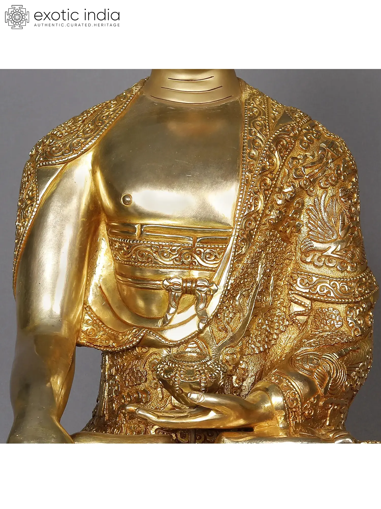 Unblemished physique radiating the stunning quality of gilded copper and intricate details contrasting with it, the representation of Buddha in this statue from Nepal is enchanting. The robes of Buddha are remarkably inscribed with the episodes from his life, which are delineated with striking dexterity. Mediating in front of his iconic Buddha statue, the scenes on his robes will transport the mind to the life of the Enlightened One, whose light will guide one on the path to wisdom.