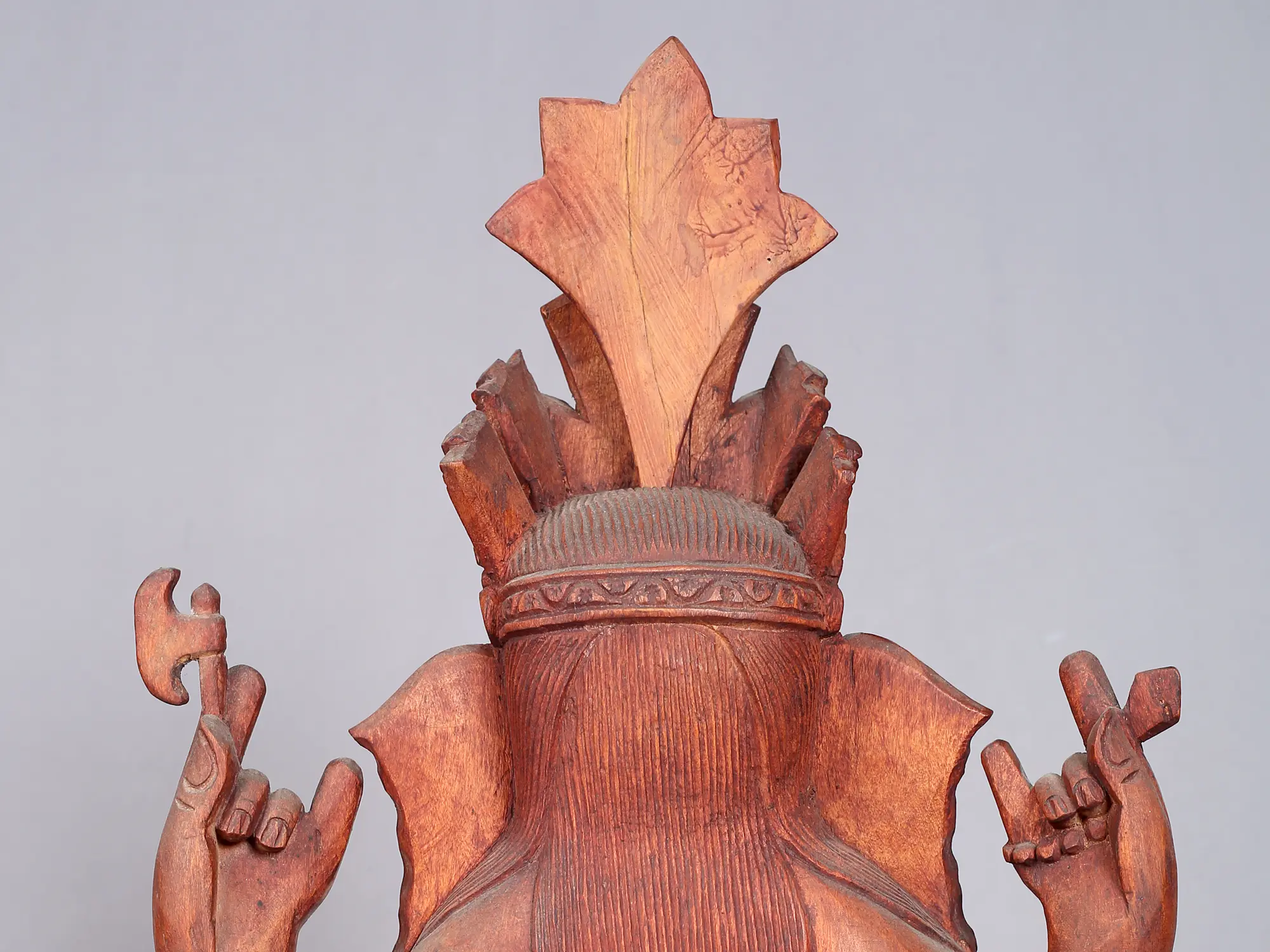 In the culture of Nepal, the beloved of Shiva and Parvati- Sri Ganesha is revered as a harbinger of auspiciousness, who removes negativity and bestows boons of abundance on the people. This wooden statue delineates Ganesha in his most popular form, as a four-armed divinity, seated in a royal posture, adorned with an imposing crown and kingly ornaments. On his throne, two Mushaka are engraved in a unique manner. The balanced etchings, carving, and polishing of the wood lend this icon an exquisite aesthetic quality, which is best experienced in the animated eyes of Ganesha, who steadily looks at the onlooker, removing all worries from the heart, filling it with reverence for the Prathama Pujya.