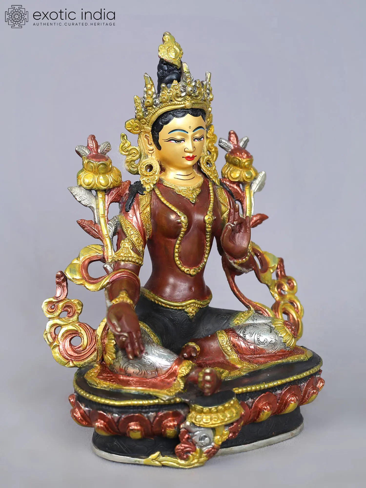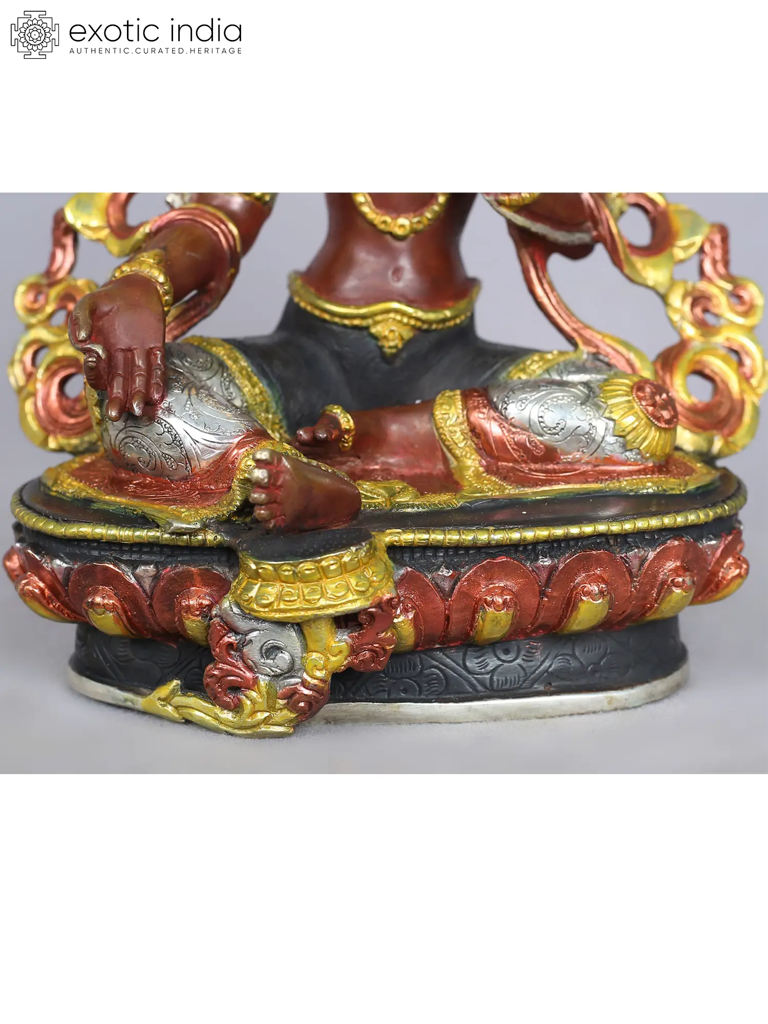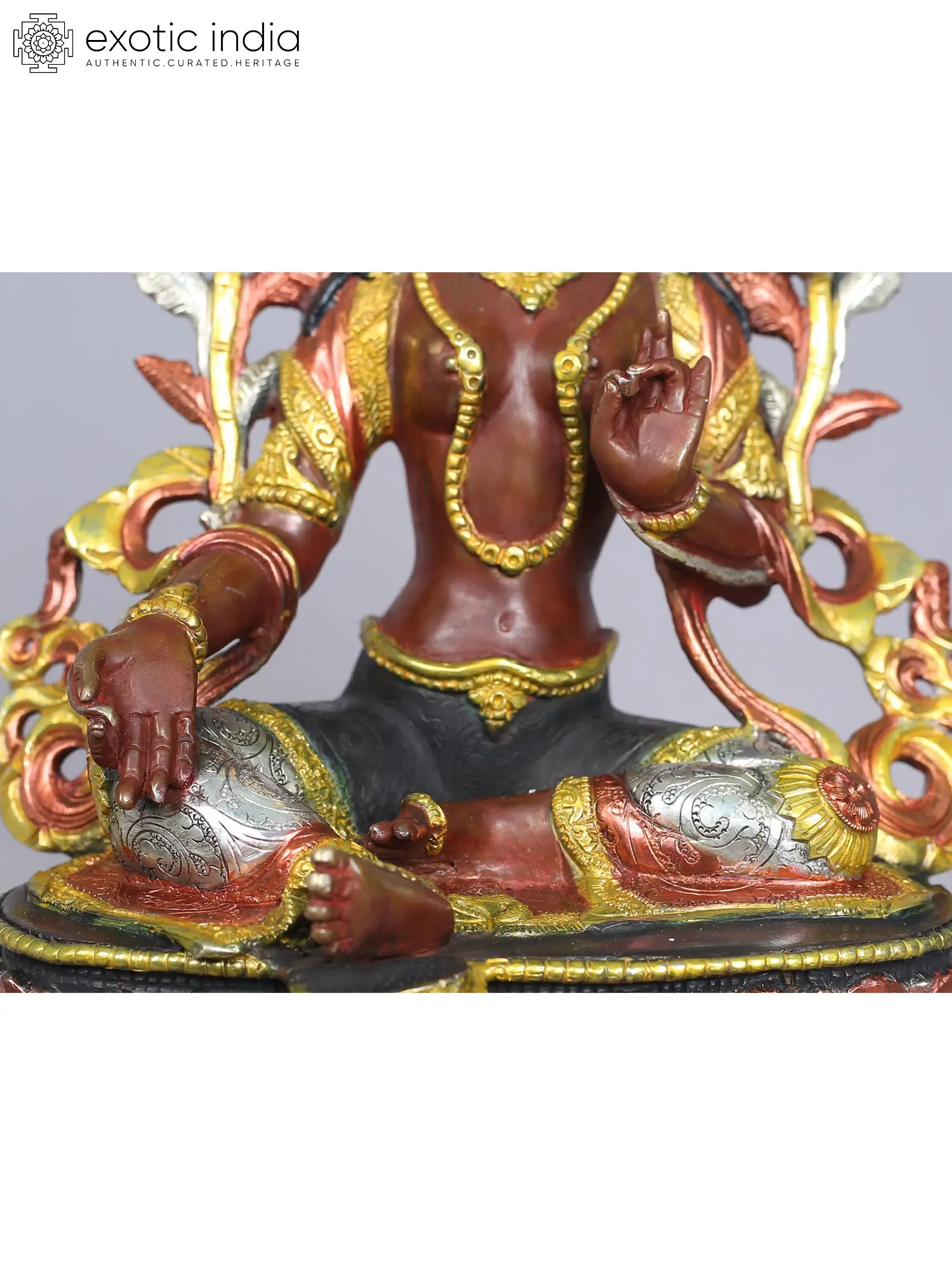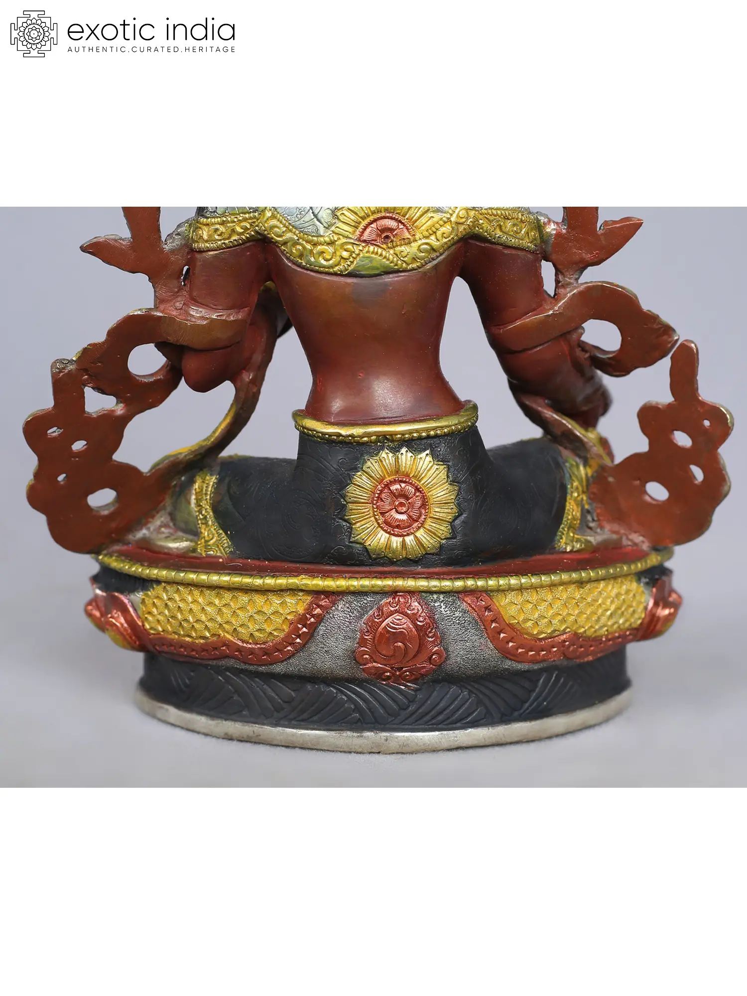 Chenrezig adorns himself in the silks and ornaments befitting a Bodhisattva, representing his exceptional qualities. Draped over his shoulder is the soft skin of an antelope, symbolizing his complete aversion to violence and his commitment to non-harmful ways.