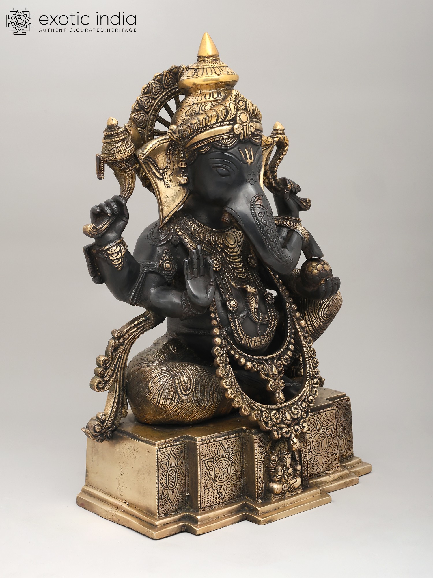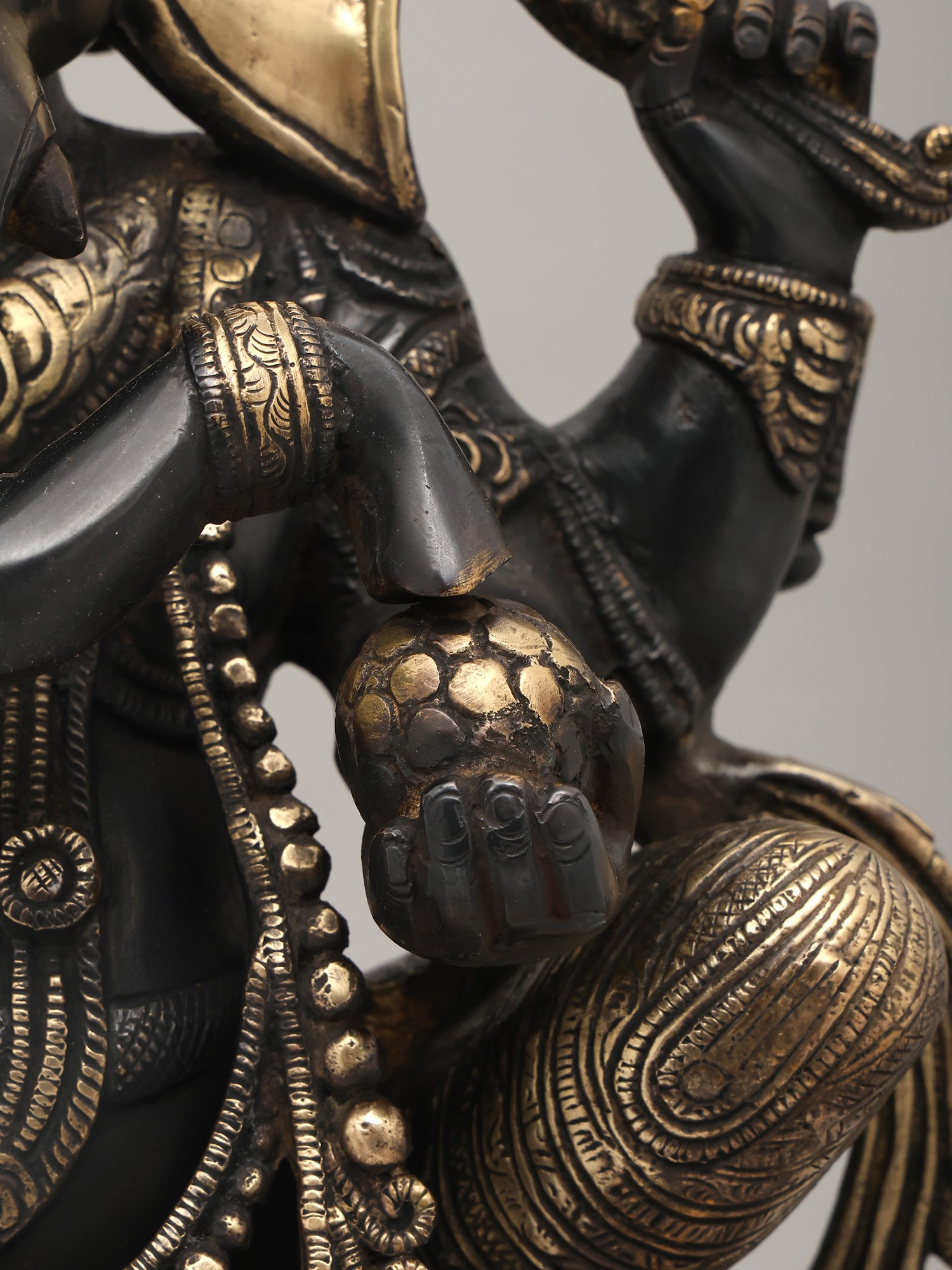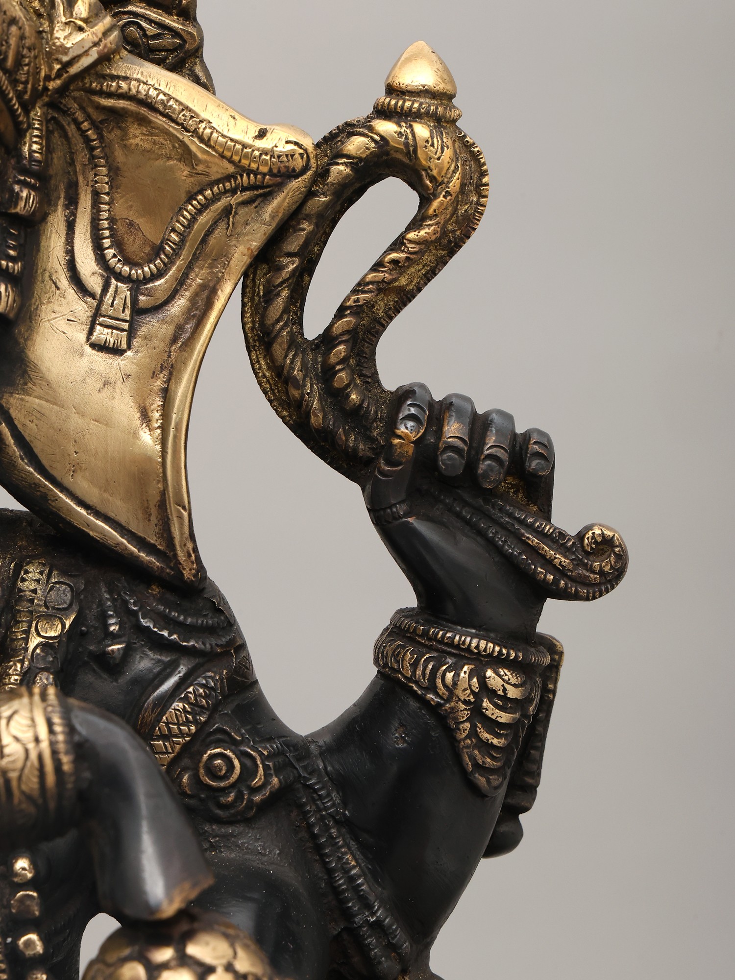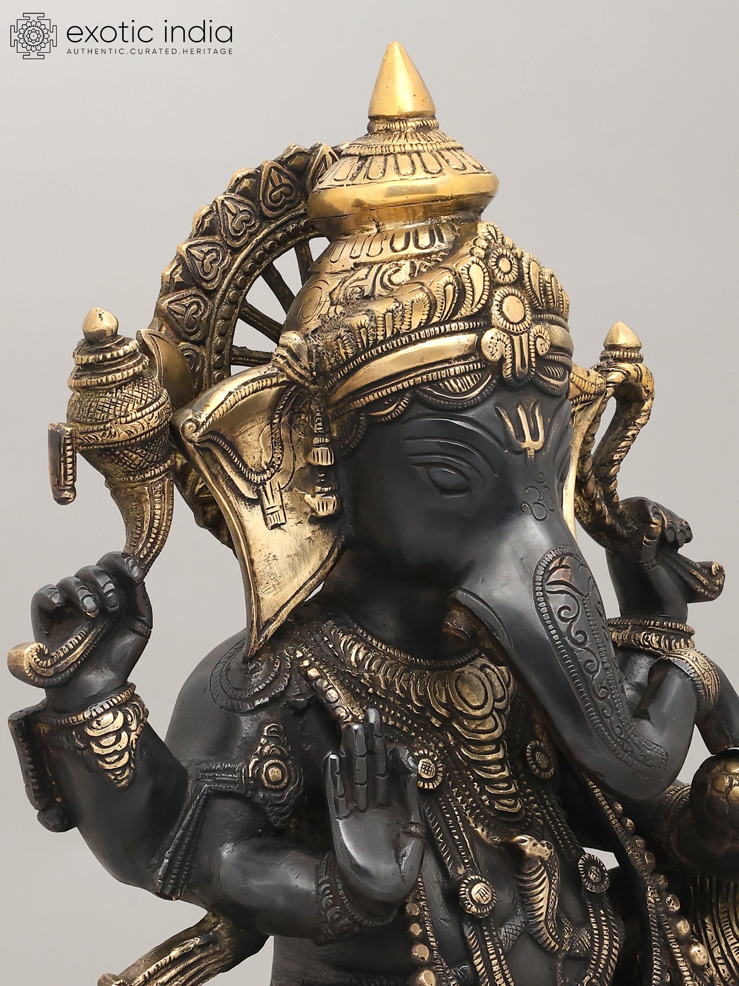 This vibrant Chaturbhuja Lord Ganesha brass statue is a captivating blend of traditional artistry and symbolic depth.