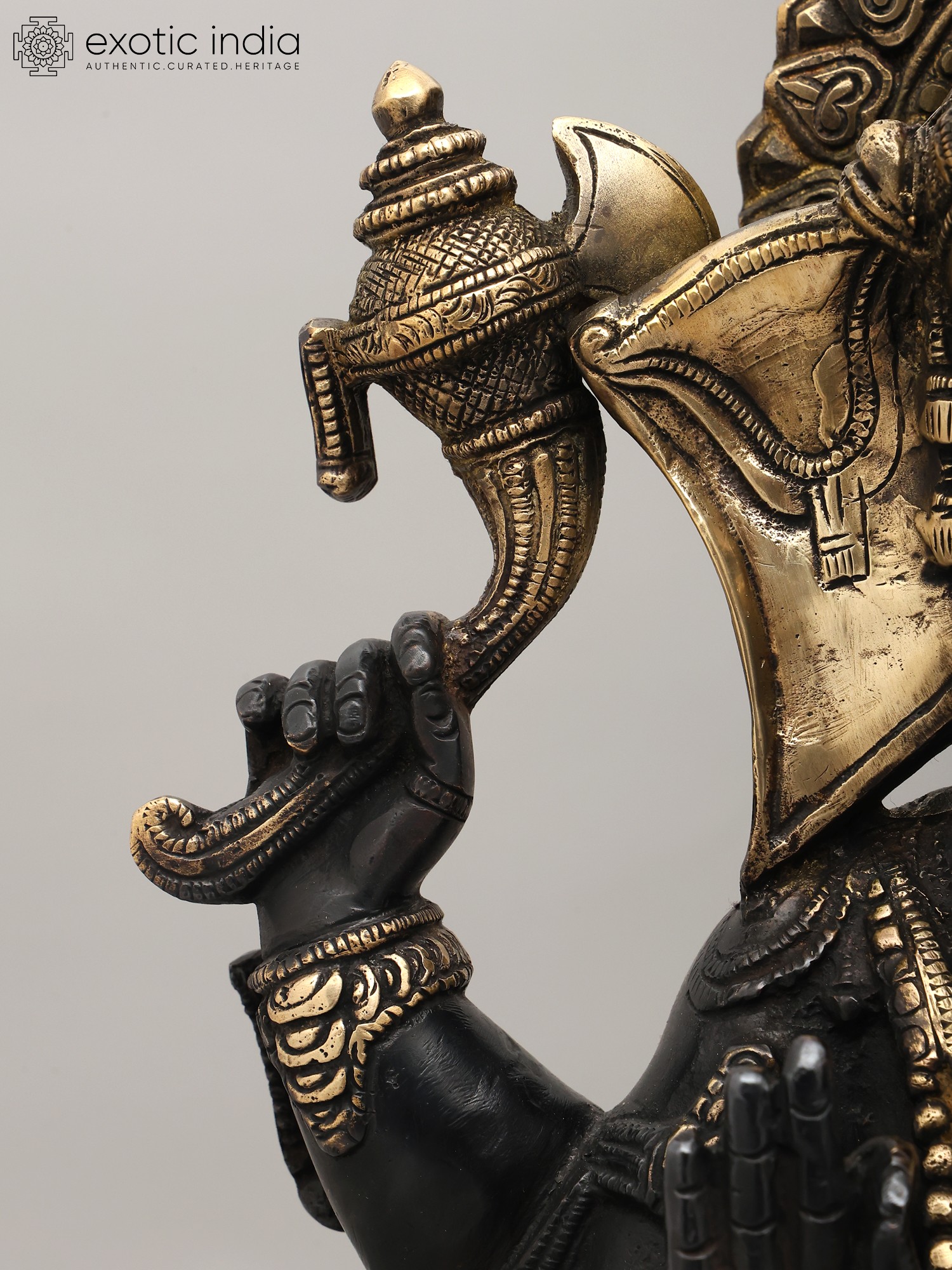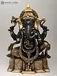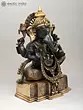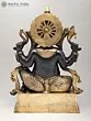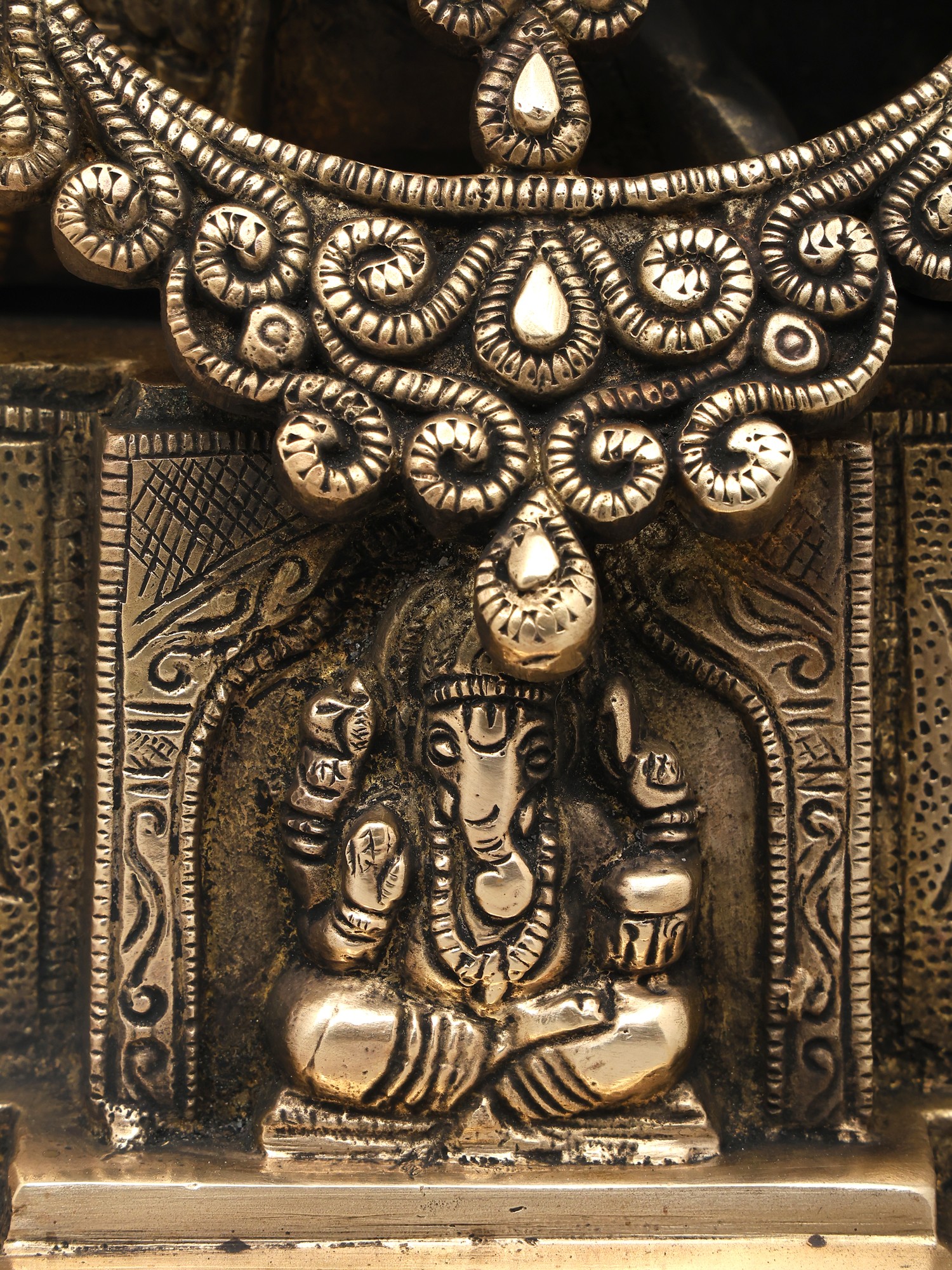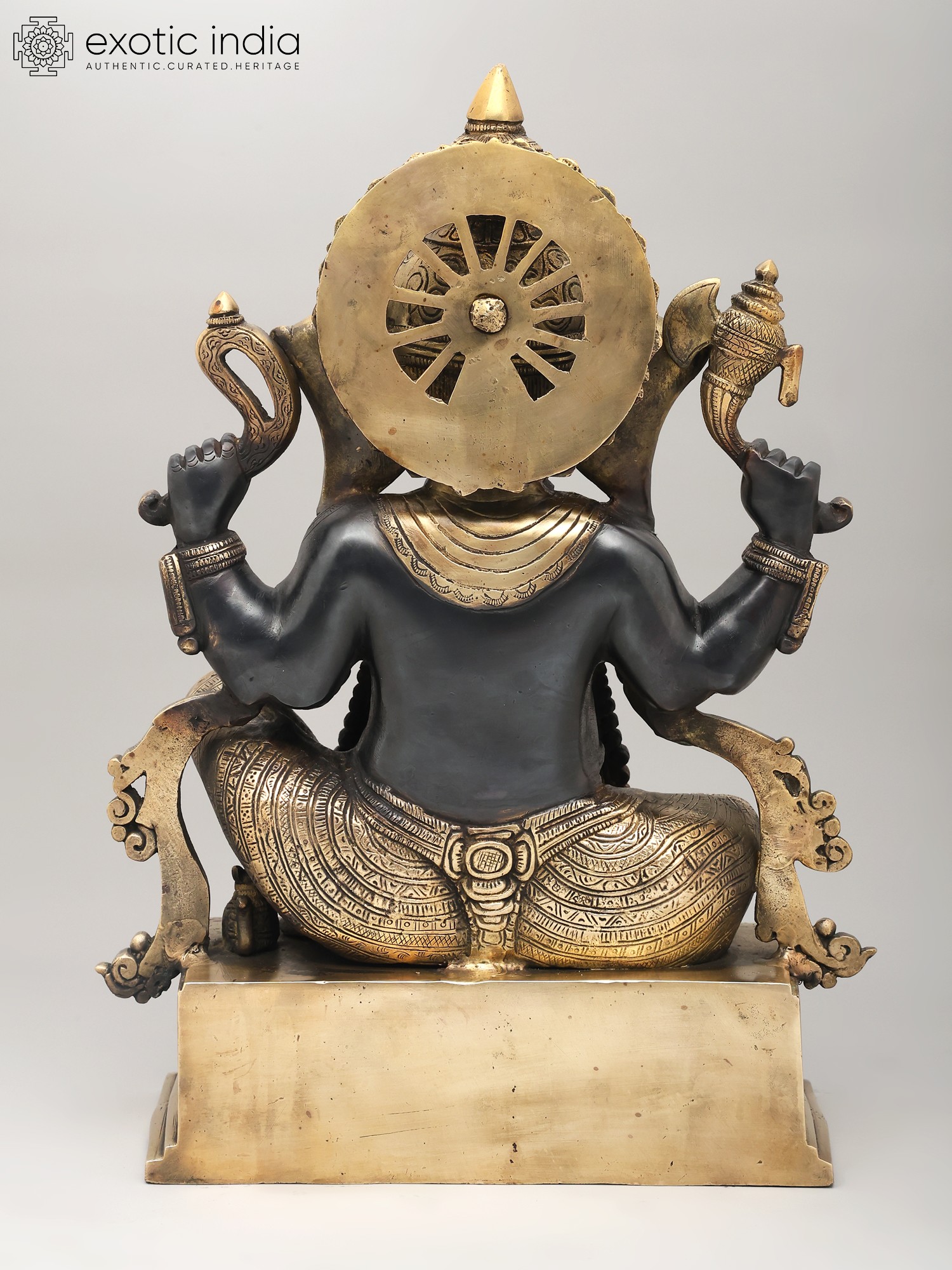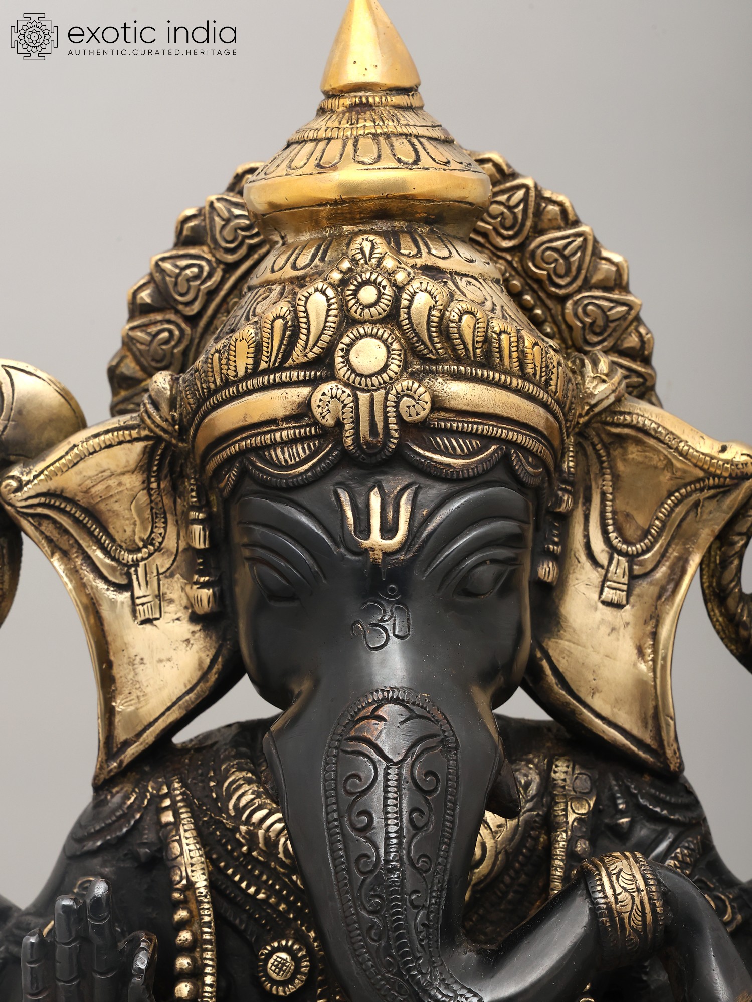 This vibrant Chaturbhuja Lord Ganesha brass statue is a captivating blend of traditional artistry and symbolic depth.