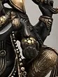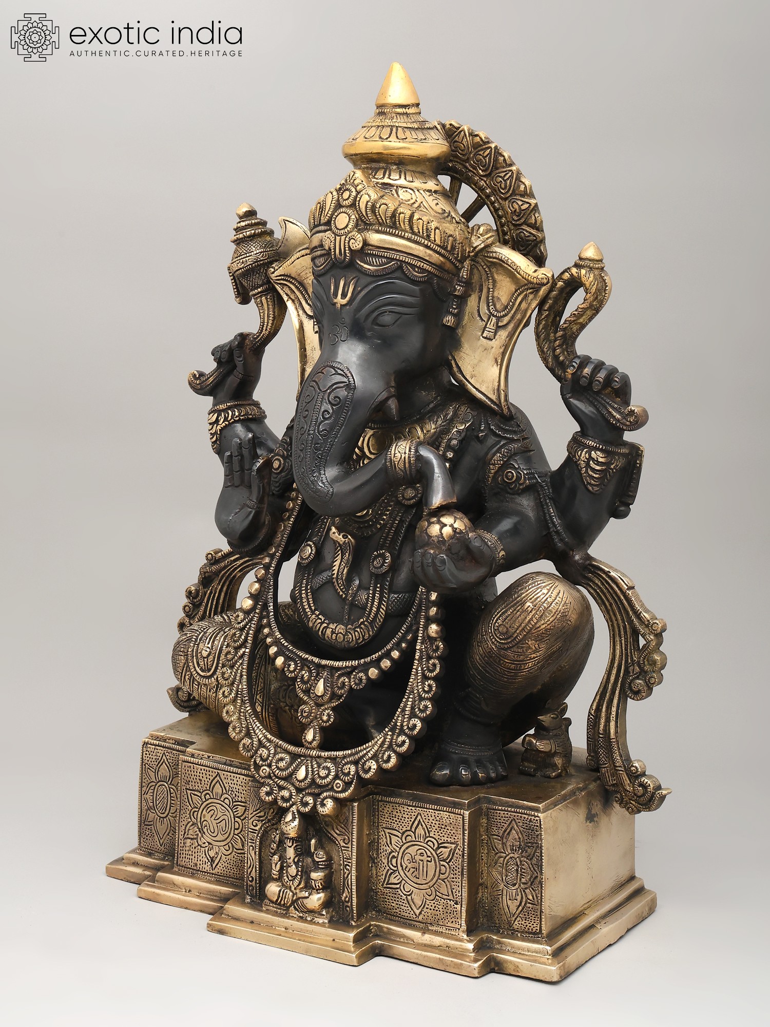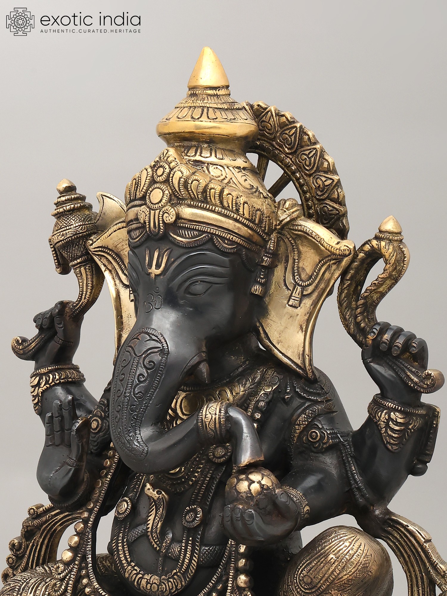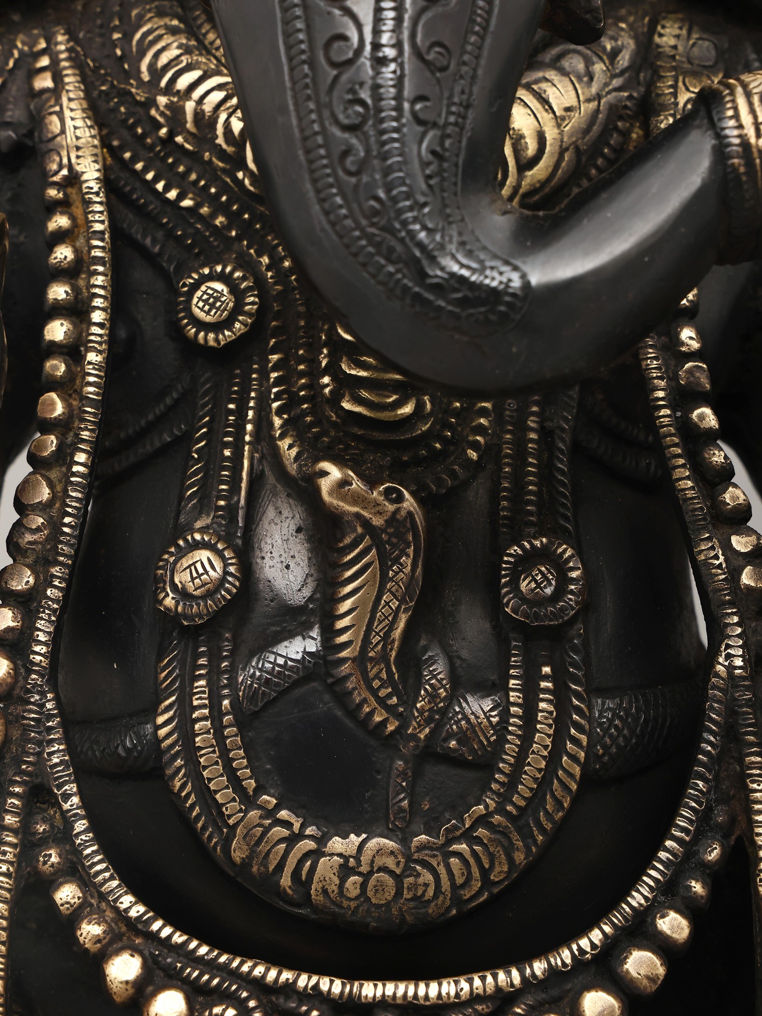 In this statue, Lord Ganesha is depicted with a moon-like complexion, with a serpent tied around his belly, symbolizing the universe.