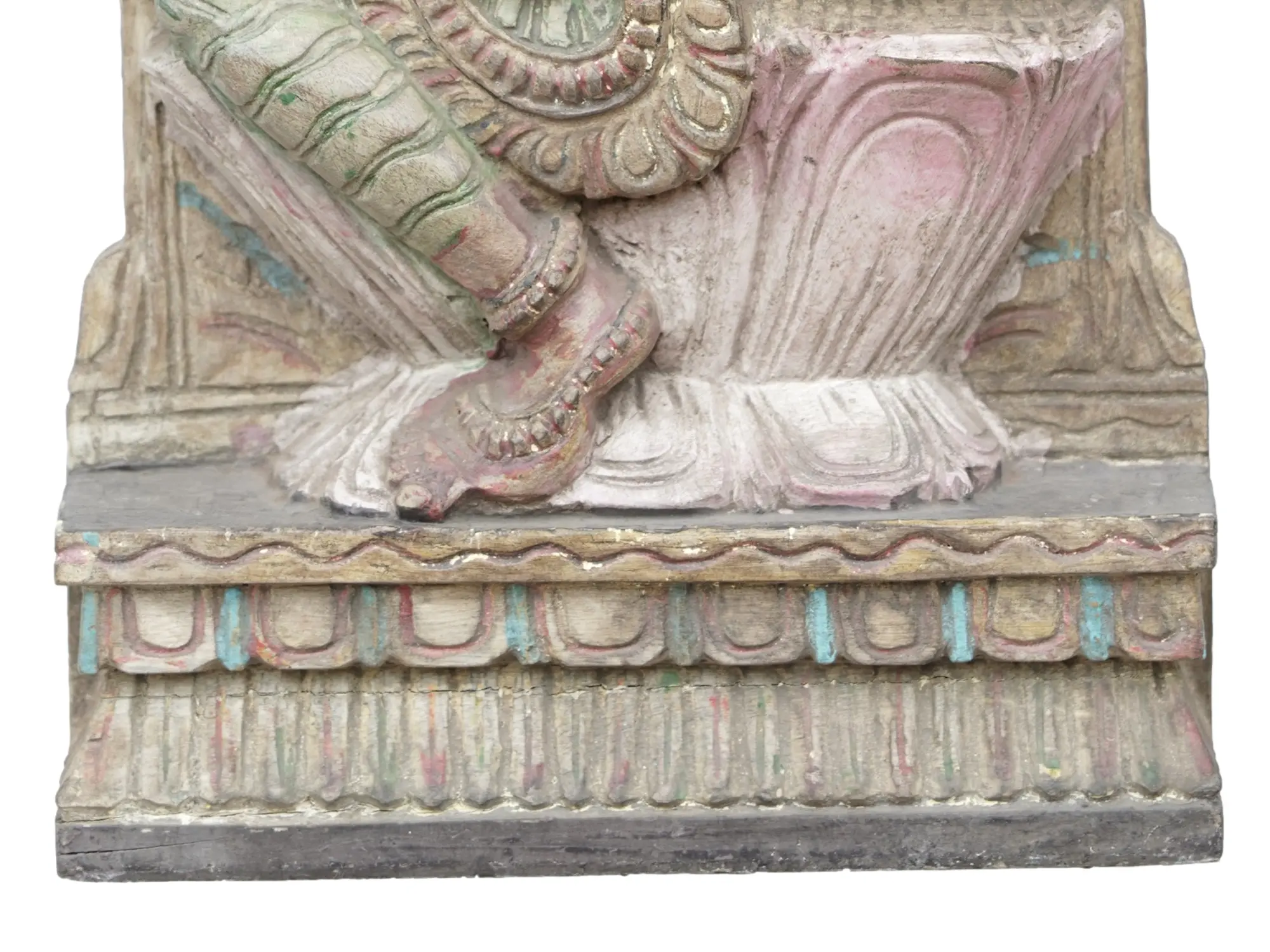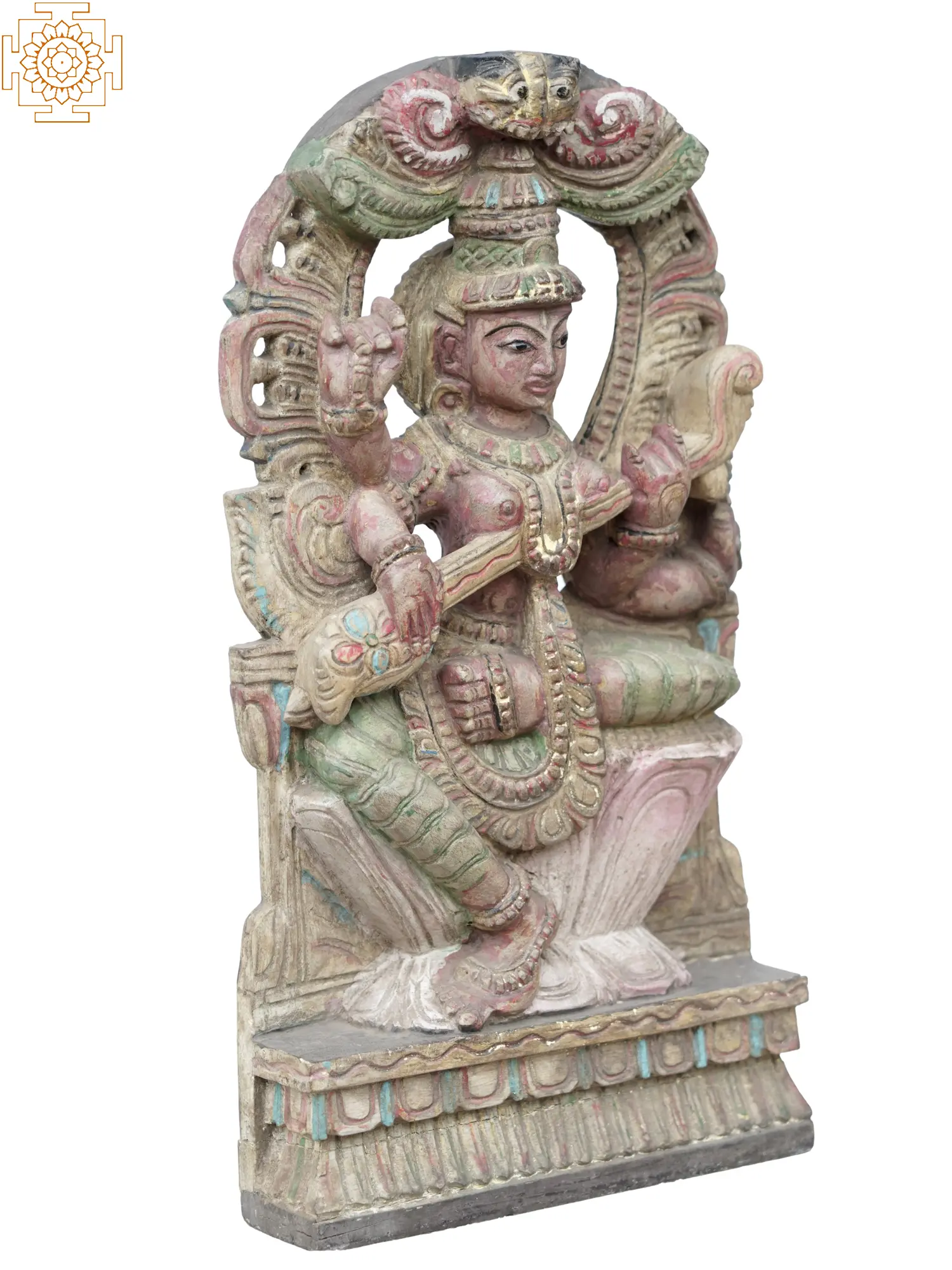 Discover the enchanting sounds of Goddess Saraswati as she plays the sitar with grace in this alluring wooden statue. Saraswati, adorned with ageless grace and knowledge, exudes creativity and tranquility while captivating the universe with her heavenly melodies. This statue, which is crafted with great care and regard, perfectly embodies Saraswati's heavenly presence and inspires learning, ingenuity, and artistic expression. Allow her elegance to beautify your home, bringing peace, inspiration, and the benefits of heavenly knowledge to it.