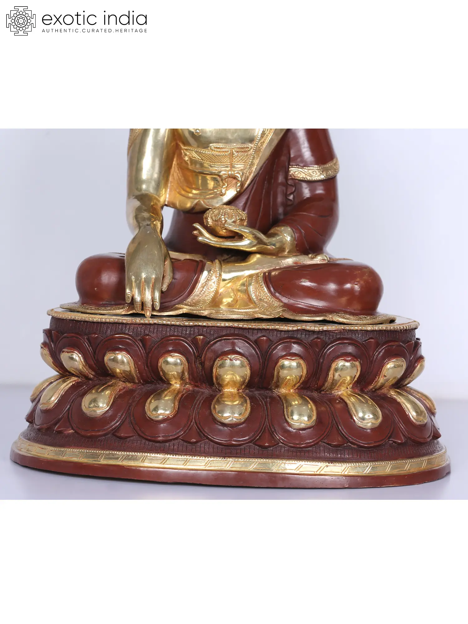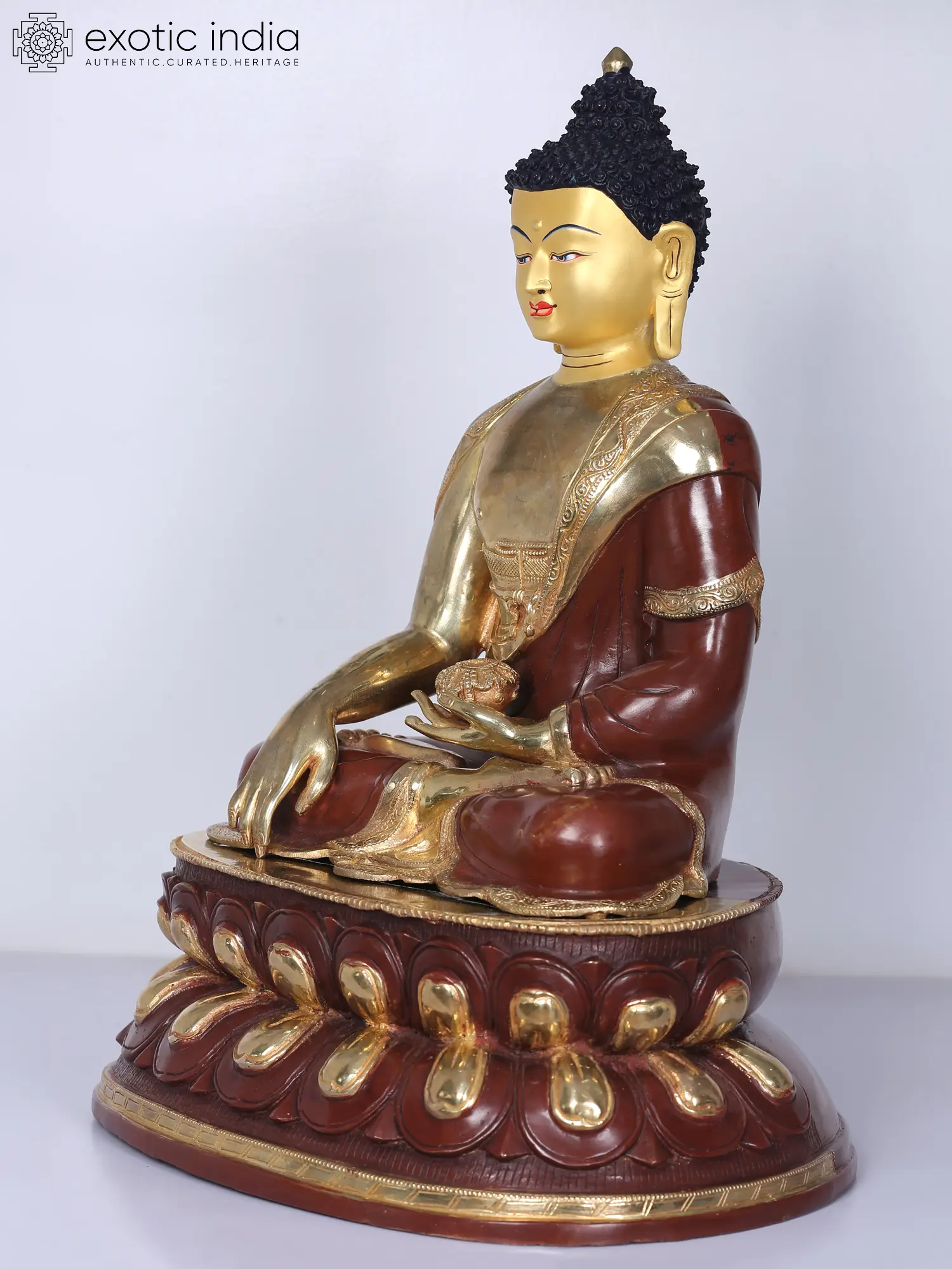 This gilded copper statue of the Buddha from Nepal, draped in a magnificent robe is a potent tool for Tathagata's disciples to imagine and realize his enlightenment. Buddha is seated on a lotus seat that has blossomed, signifying an enlightened mind. He is holding a monk's bowl in the Dhyana mudra and extends his hand in the earth-touching gesture or Bhumisparsha mudra. With the use of gilding to highlight the elements of the icon and the divine countenance of Buddha, while leaving the earthy tone of copper bare in other areas, the statue of Buddha has flawlessly realistic facial features that give the artwork an unfathomable aura.