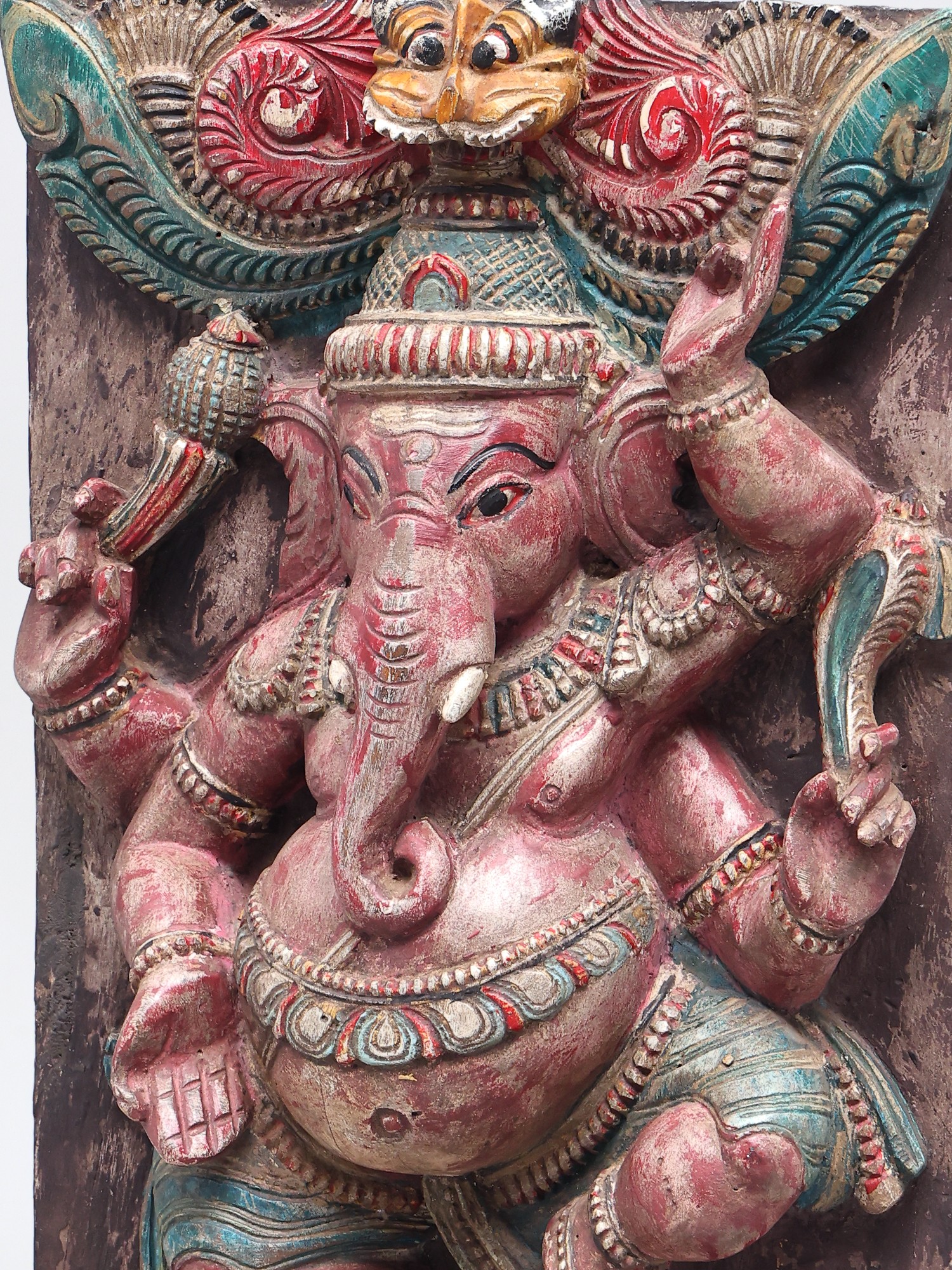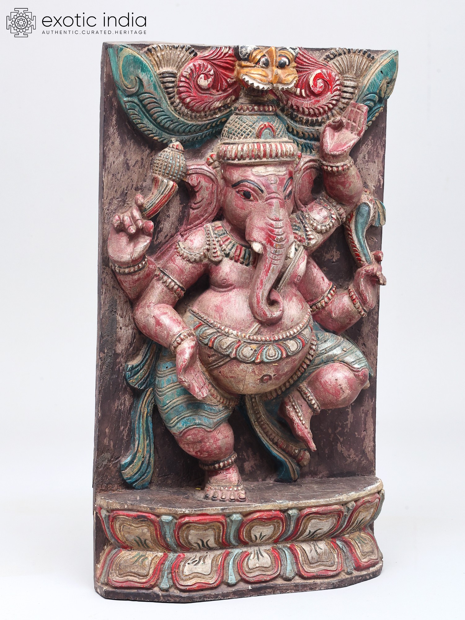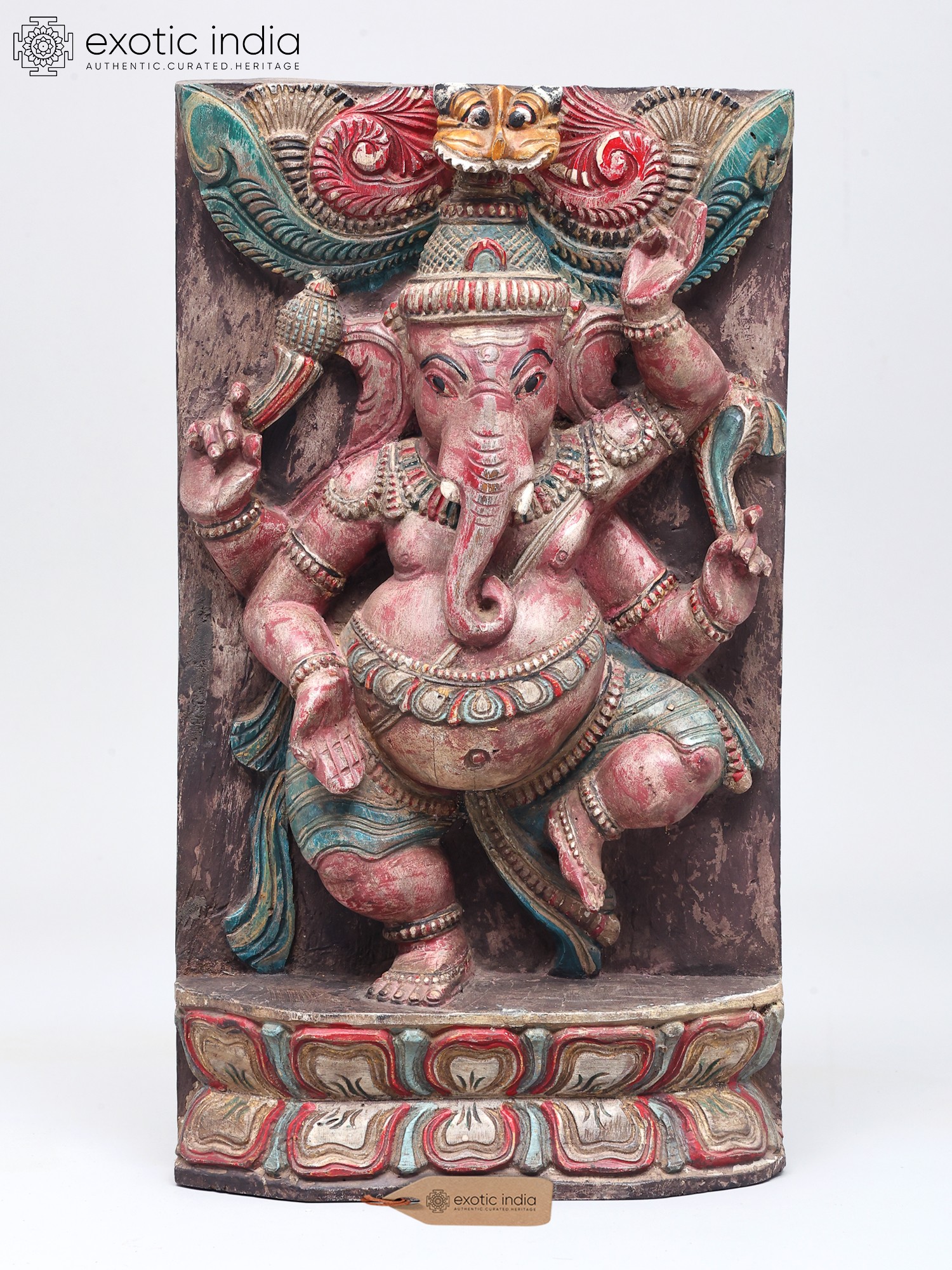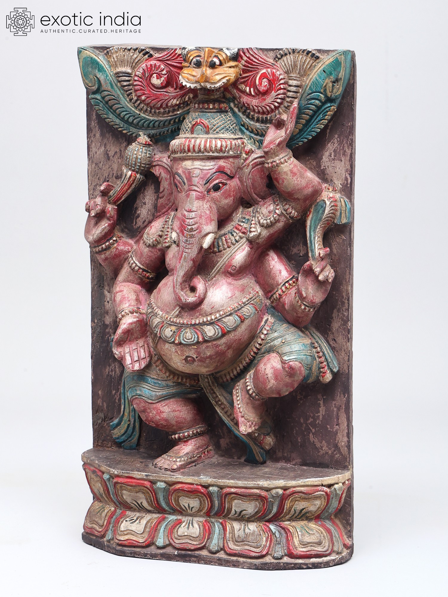 In the realm of divine artistry, the Dancing Lord Ganesha, also known as “Nritya Ganpati”, graces us with his rhythmic enchantment. This wooden sculpture portrays the Elephant-Headed God atop a Kirtimukha throne, exuding an aura of celestial exuberance. With his left leg gracefully raised, he beckons us to join in the cosmic dance. His generous belly represents abundance and prosperity, while his right hand, poised in the “Varada Mudra”, bestows blessings upon all who behold him. Adorned in resplendent regal attire, this manifestation of Ganesha embodies the harmony between earthly desires and spiritual aspirations, inviting us to embrace life’s abundant joys with grace and reverence.