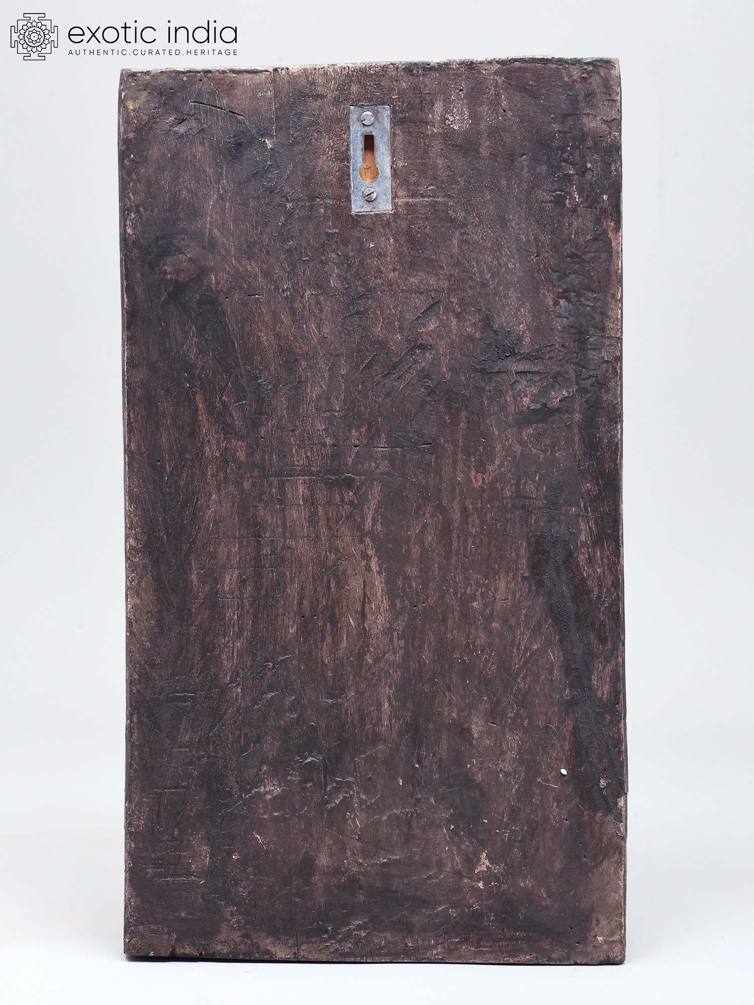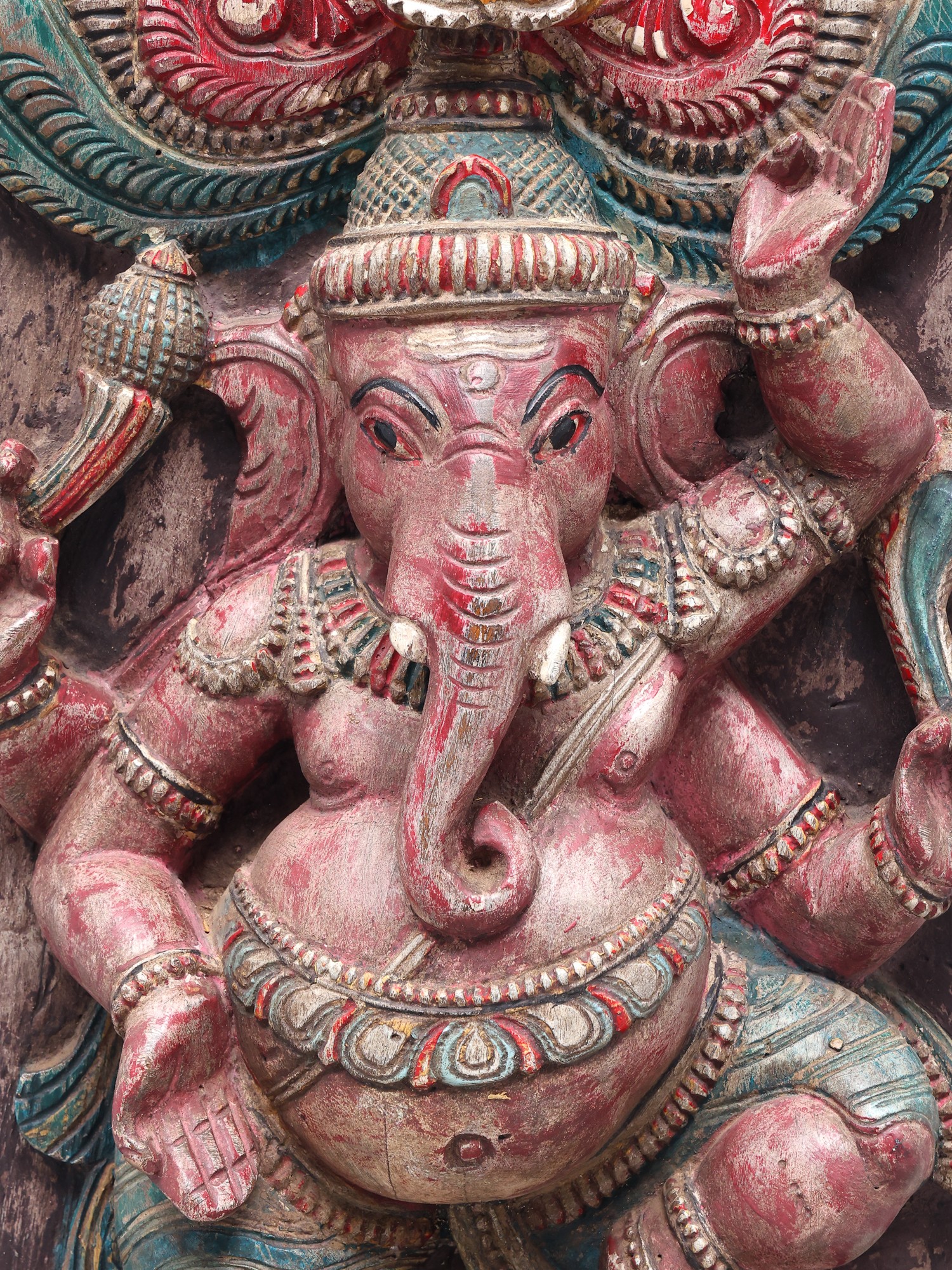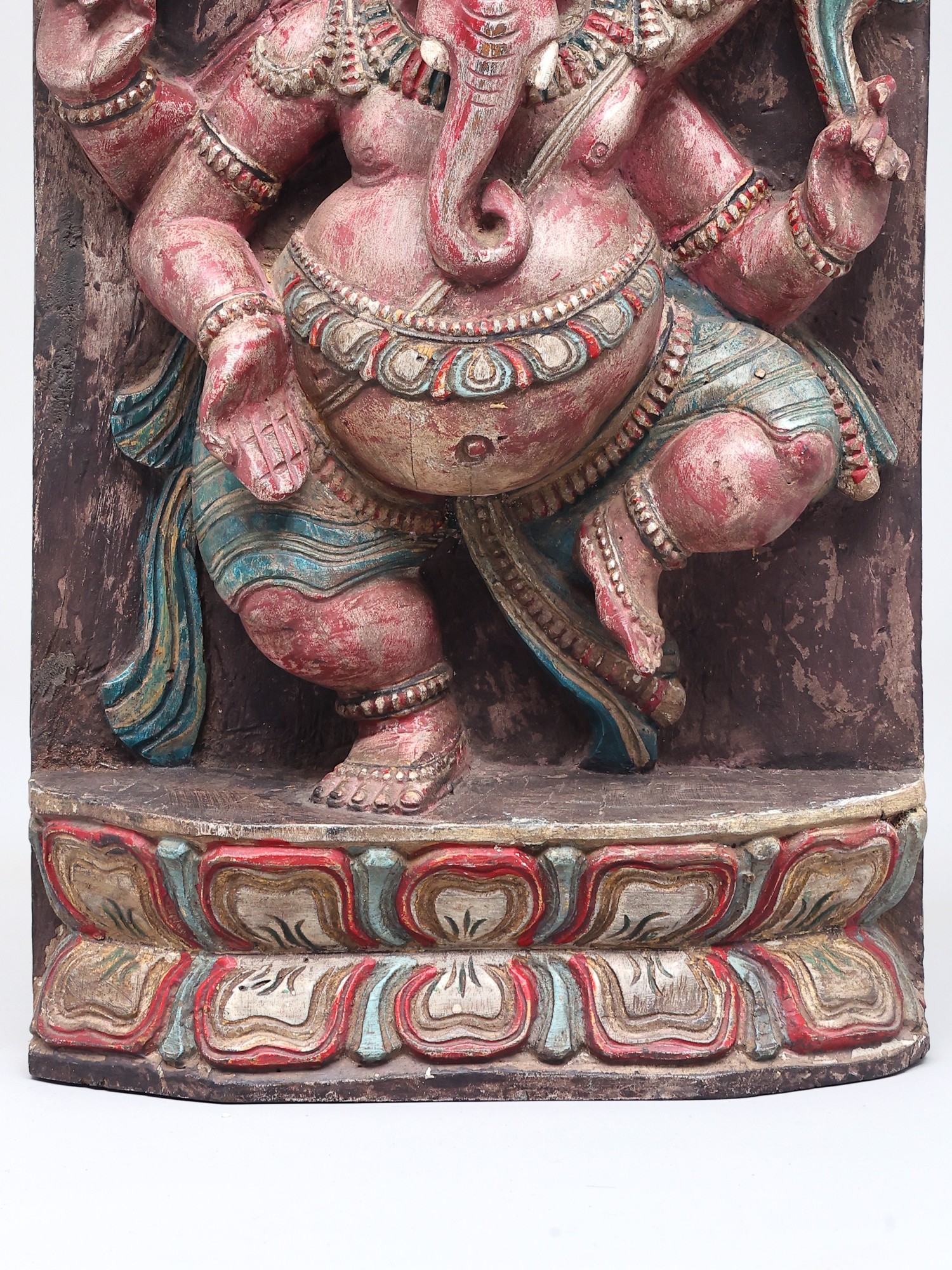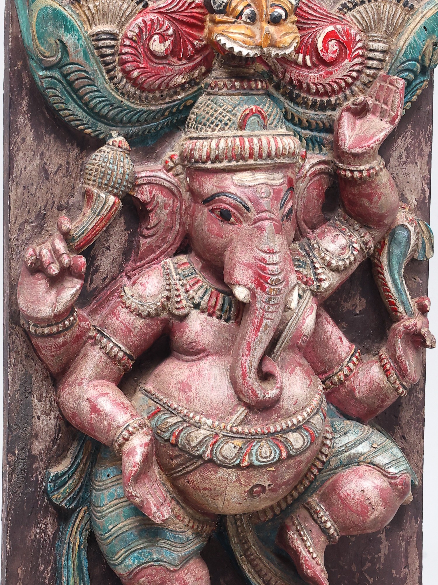 In the realm of divine artistry, the Dancing Lord Ganesha, also known as “Nritya Ganpati”, graces us with his rhythmic enchantment. This wooden sculpture portrays the Elephant-Headed God atop a Kirtimukha throne, exuding an aura of celestial exuberance. With his left leg gracefully raised, he beckons us to join in the cosmic dance. His generous belly represents abundance and prosperity, while his right hand, poised in the “Varada Mudra”, bestows blessings upon all who behold him. Adorned in resplendent regal attire, this manifestation of Ganesha embodies the harmony between earthly desires and spiritual aspirations, inviting us to embrace life’s abundant joys with grace and reverence.