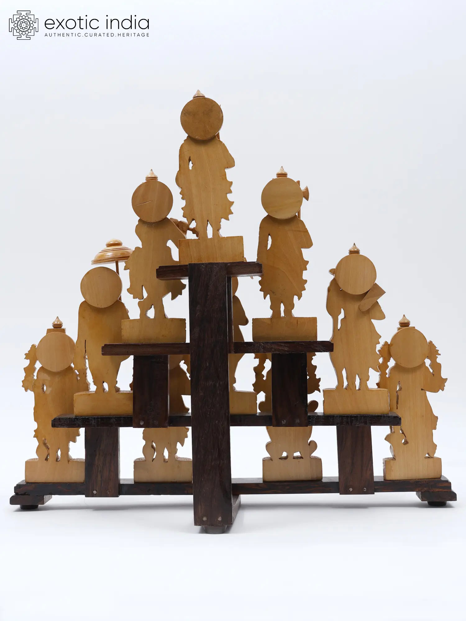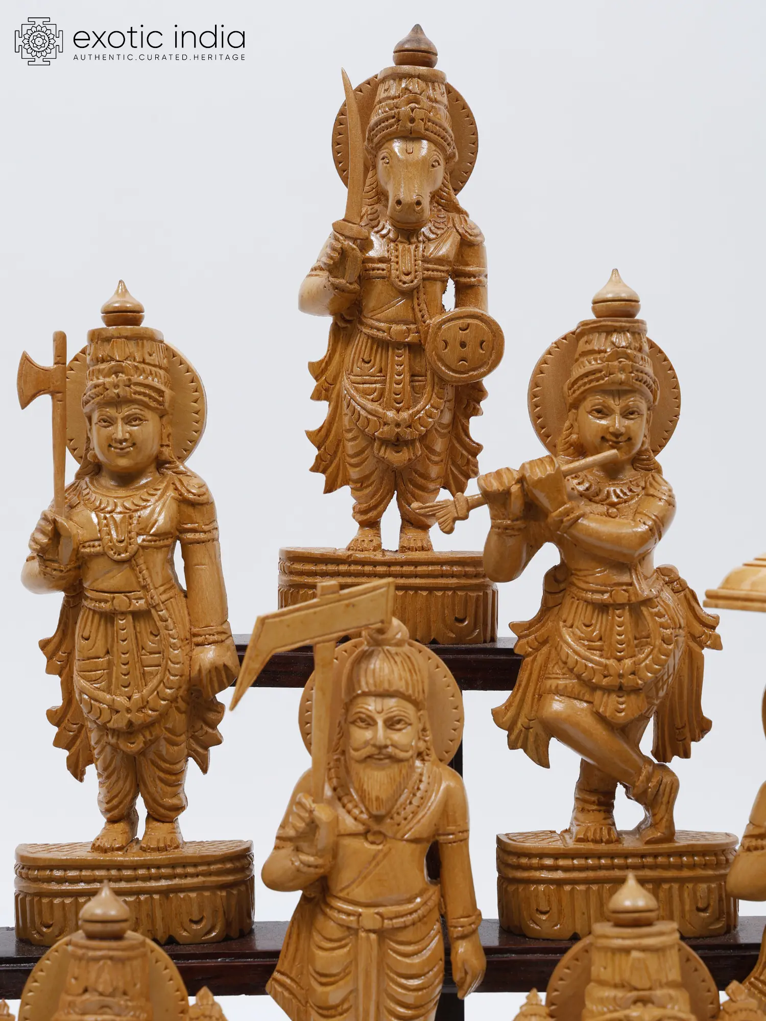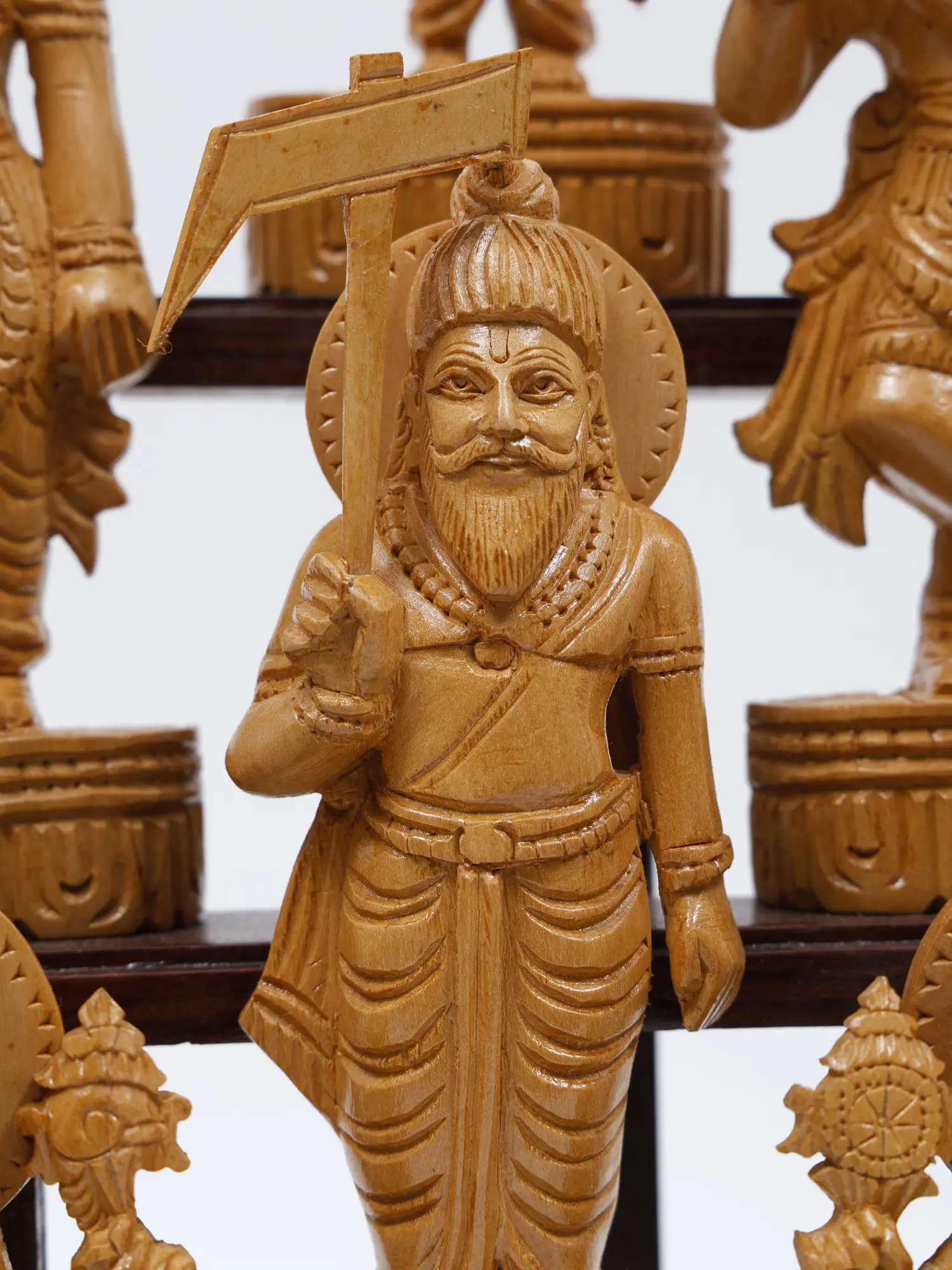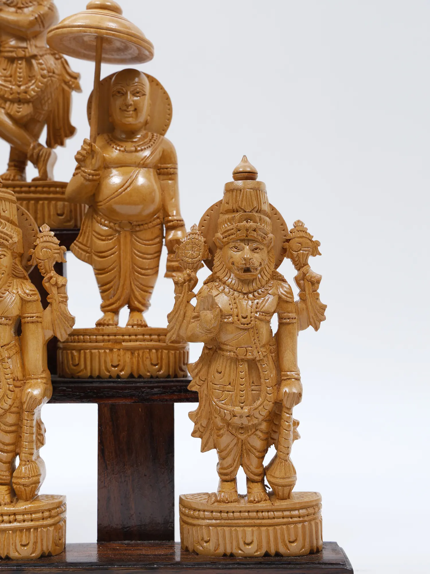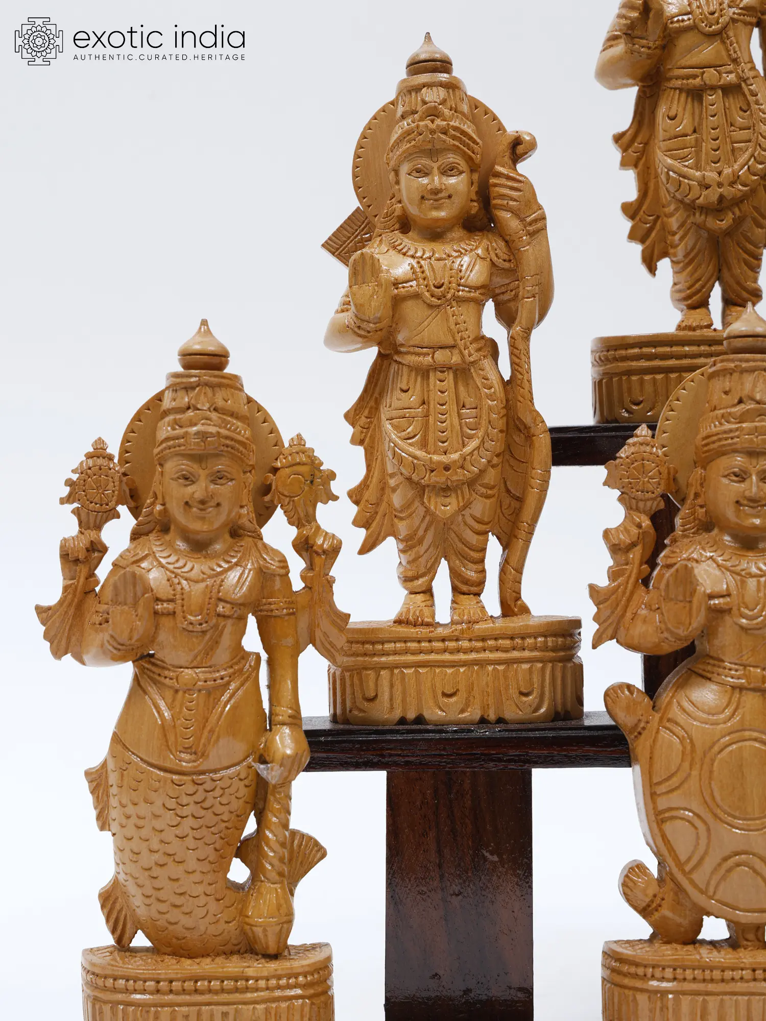 Expertly crafted from high-quality wood, this statue depicts the ten incarnations of Lord Vishnu, each beautifully detailed to capture the essence of these divine forms.
