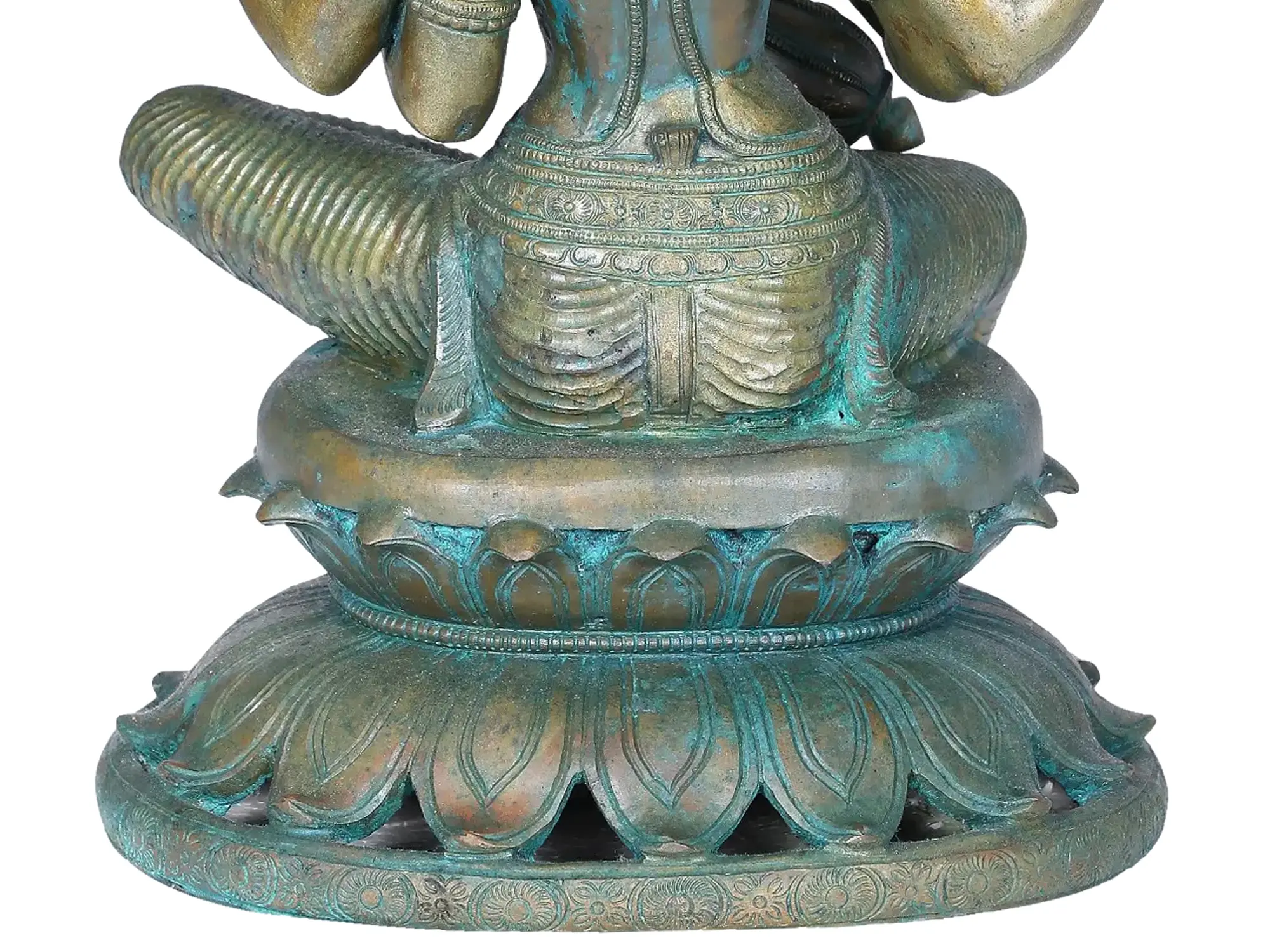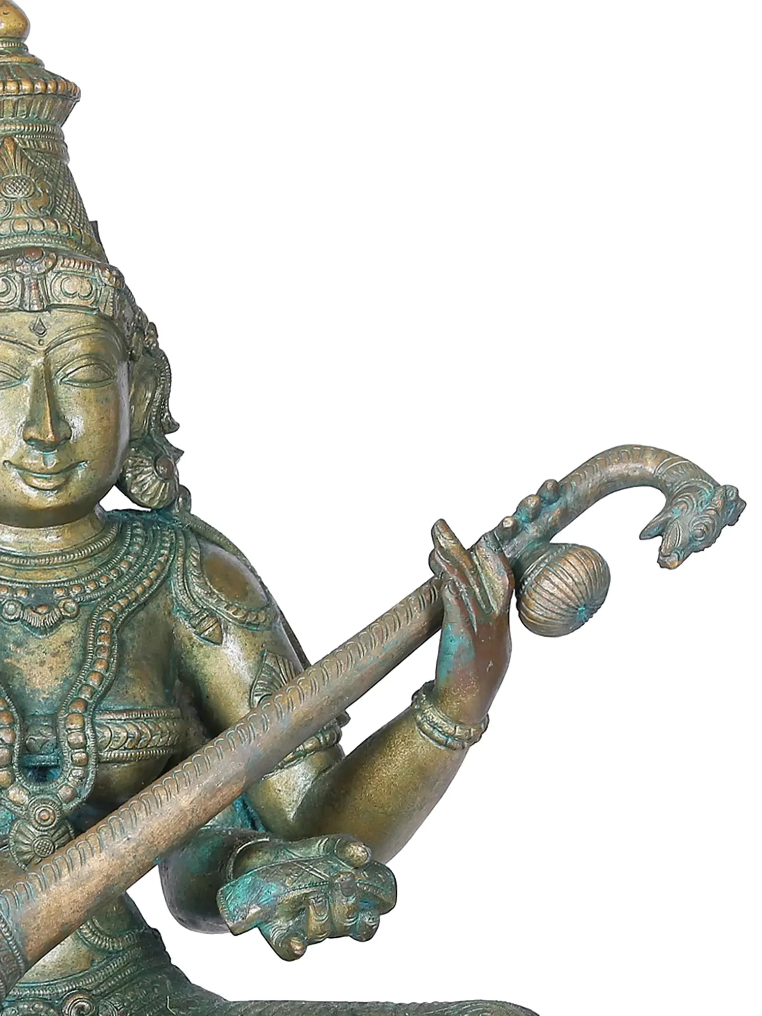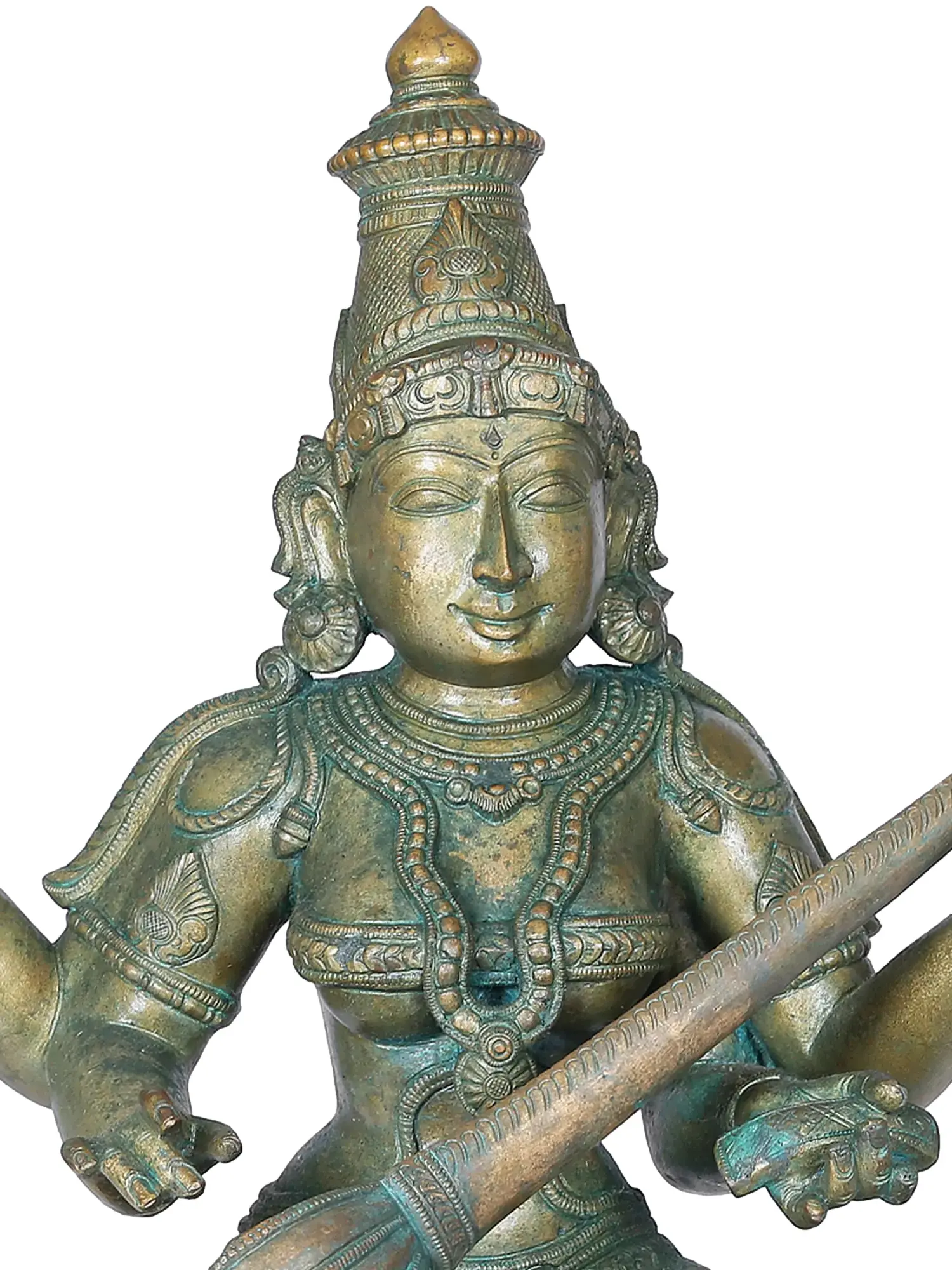 Devi Saraswati Panchaloha Bronze is an exquisite embodiment of the Hindu goddess of knowledge and music, with symbolic emblems of her divine attributes – a scripture representing knowledge and wisdom, a rosary signifying spiritual devotion and a veena symbolizing the harmony of music. Her serene countenance exudes tranquillity, while her detailed ornamentation and meticulously sculpted form speak to the mastery of Swamimalai's artisans.