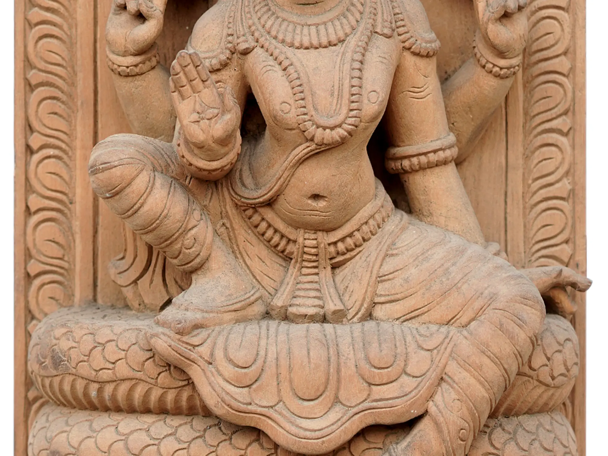 This statue is a testament to masterful artistry, with each curve and detail meticulously carved from wood to bring the divine figures to life. The texture of the wood adds a natural warmth and depth, enhancing the spiritual and aesthetic appeal of the piece. The decorative border framing the scene further accentuates the sacredness of the composition, reminiscent of ancient temple carvings. Such representations of Vishnu reclining on Sheshnag are central to devotional practices and are often found in homes and temples, serving as focal points for meditation and prayer. They evoke the principles of Dharma (righteousness) and Karma, reminding devotees of the cosmic forces at play. Owning such a piece is not just acquiring an artifact, but inviting a sense of divine presence and ancient wisdom into your environment.