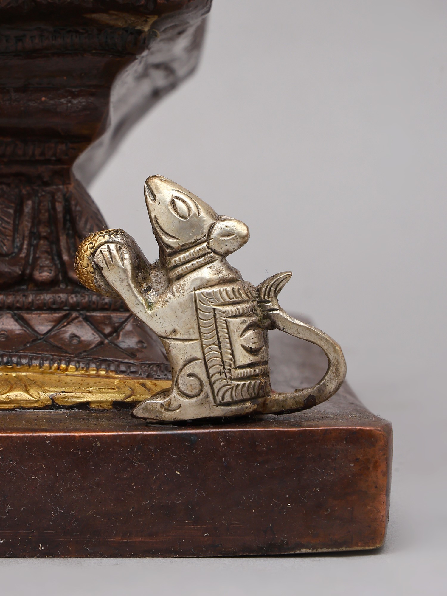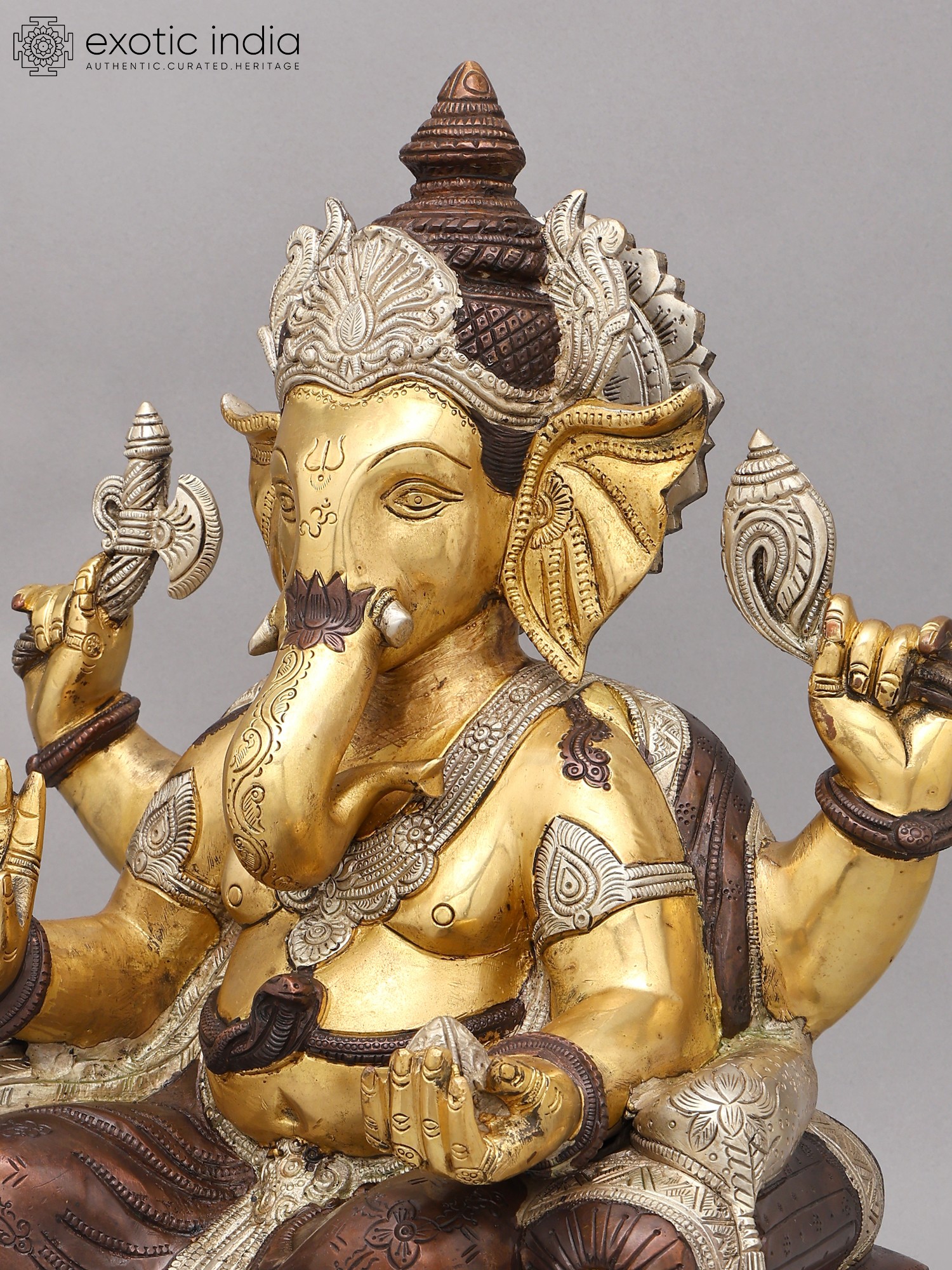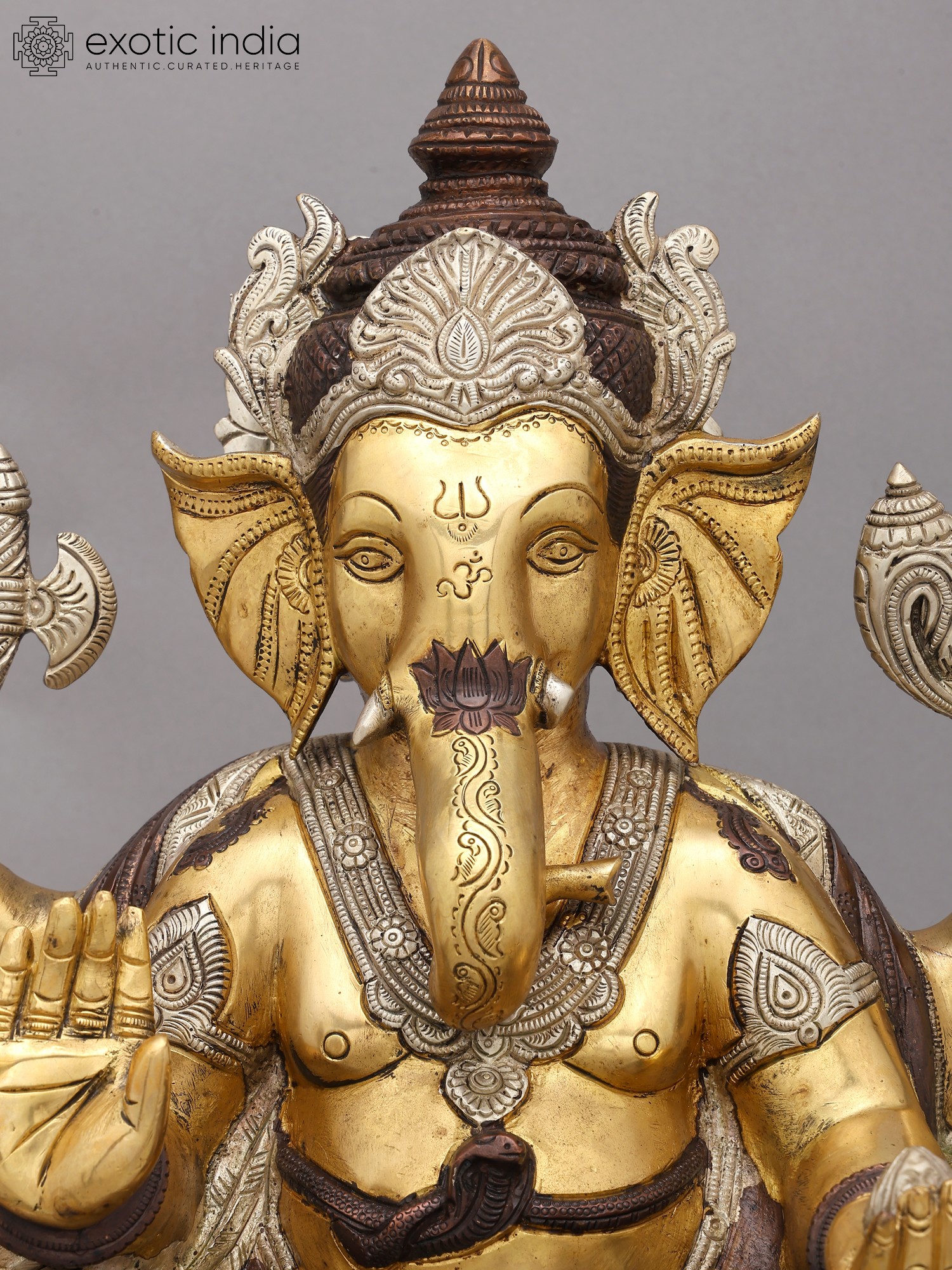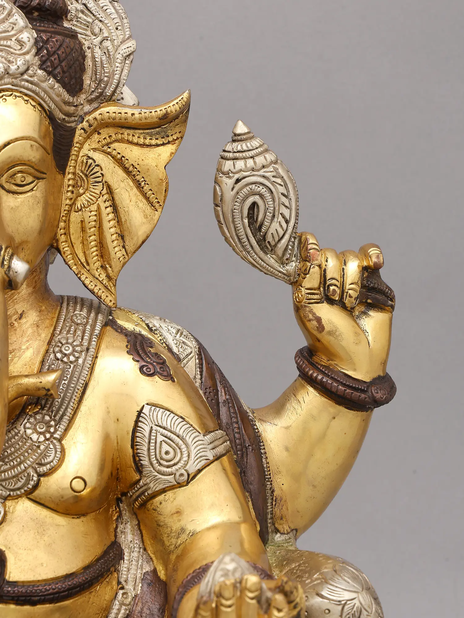 This majestic figure, standing at an impressive 18 inches, is depicted with four arms, each holding significant symbolic objects. In one hand, an axe represents the cutting away of ego and delusion, while another cradles a conch shell, a sound that signifies the cosmic vibration. The remaining two hands are raised in the 'abhaya mudra,' offering protection and dispelling fear, and in the 'varada mudra,' bestowing boons and blessings. You'll appreciate the subtle yet powerful presence conveyed through the lord's serene gaze and the gentle curve of his trunk.