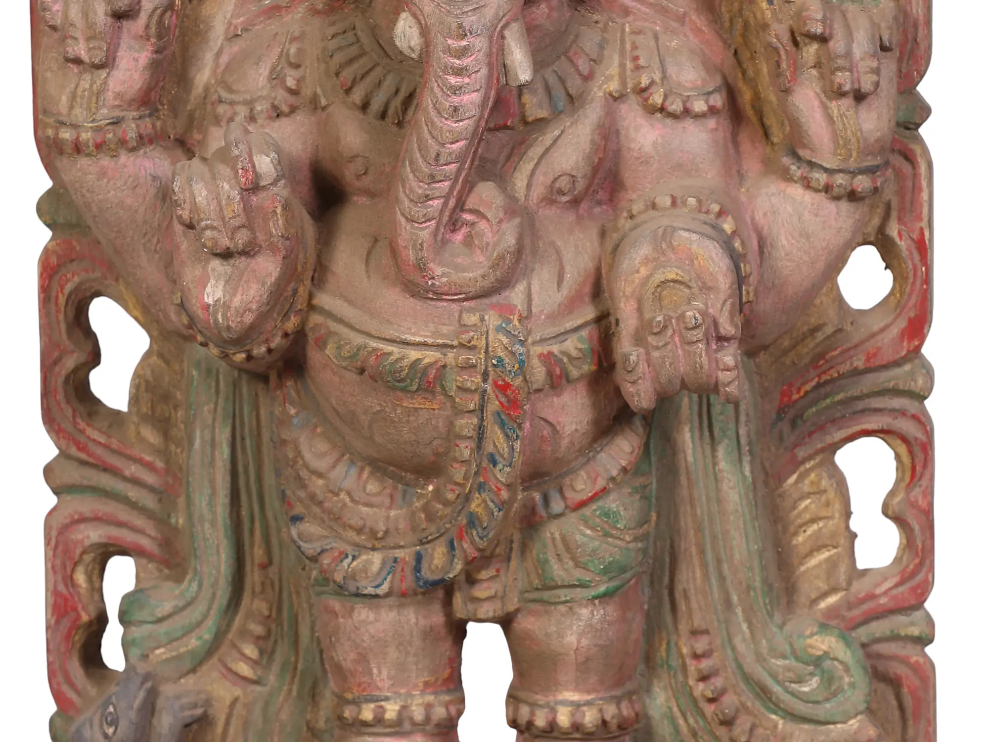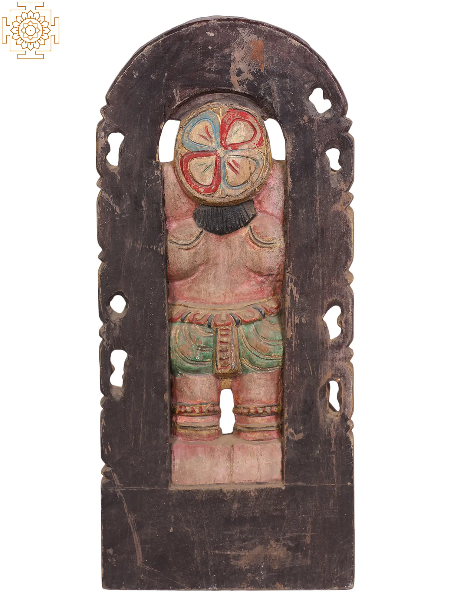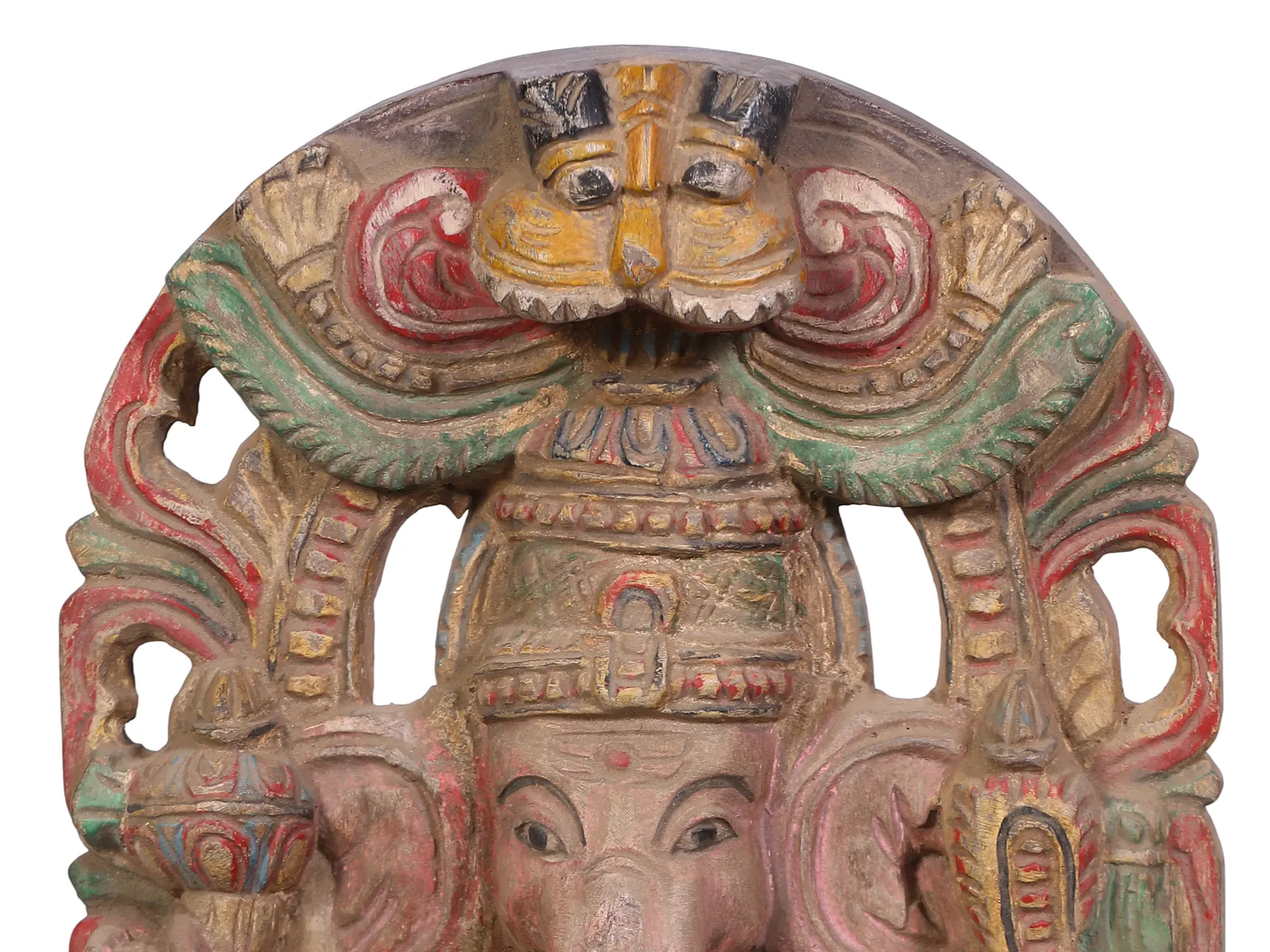 In this wood sculpture, Lord Ganesha, an embodiment of divine grace and wisdom, stands resplendent upon a lotus pedestal, entwined with the sacred Kirtimukha throne. His form, a captivating blend of strength and compassion, exudes a mesmerising aura. In his right hand, he cradles his broken tusk, a symbol of humility and sacrifice, while the left hand extends a sweet Modak, offering solace to his devotees. The goad and noose he carries symbolise the power to guide and restrain. Adorned in regal attire, he signifies the supreme lordship over obstacles, granting seekers the fortitude to overcome life’s challenges and find the sweet nectar of inner peace.