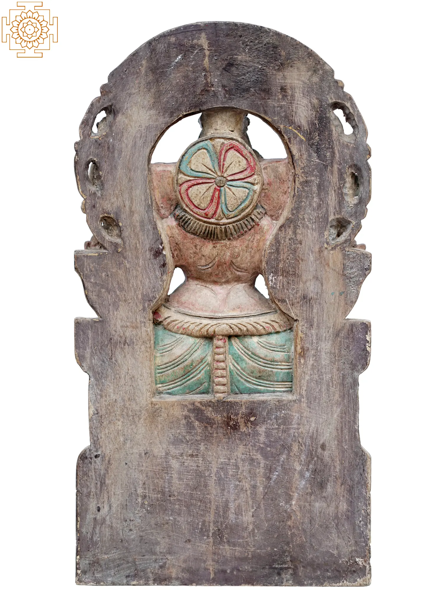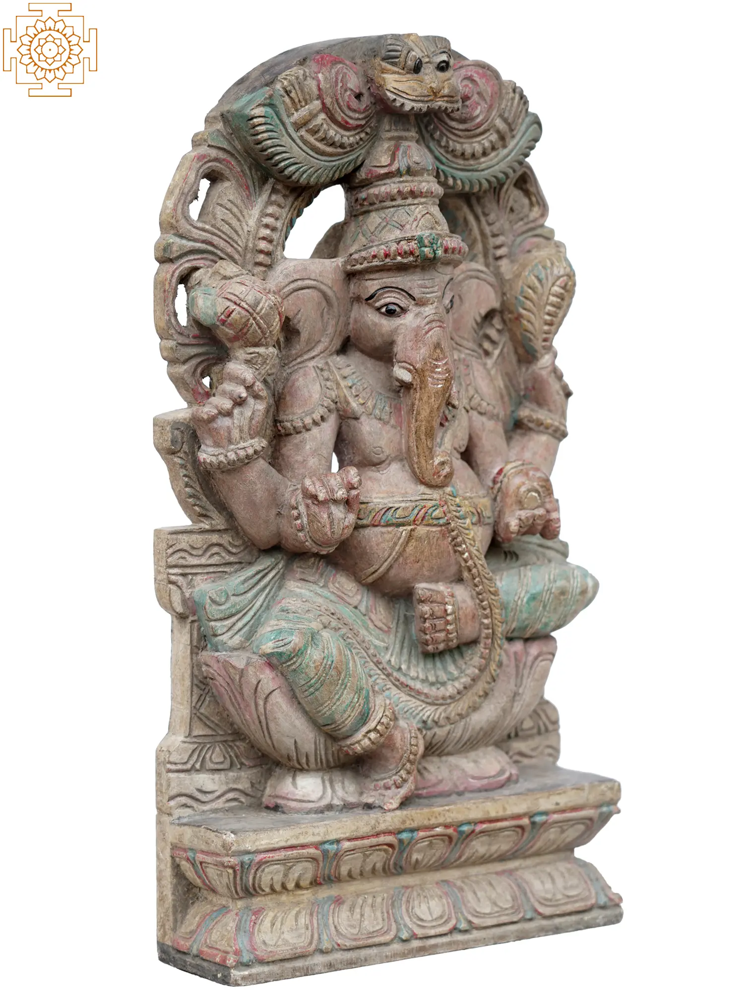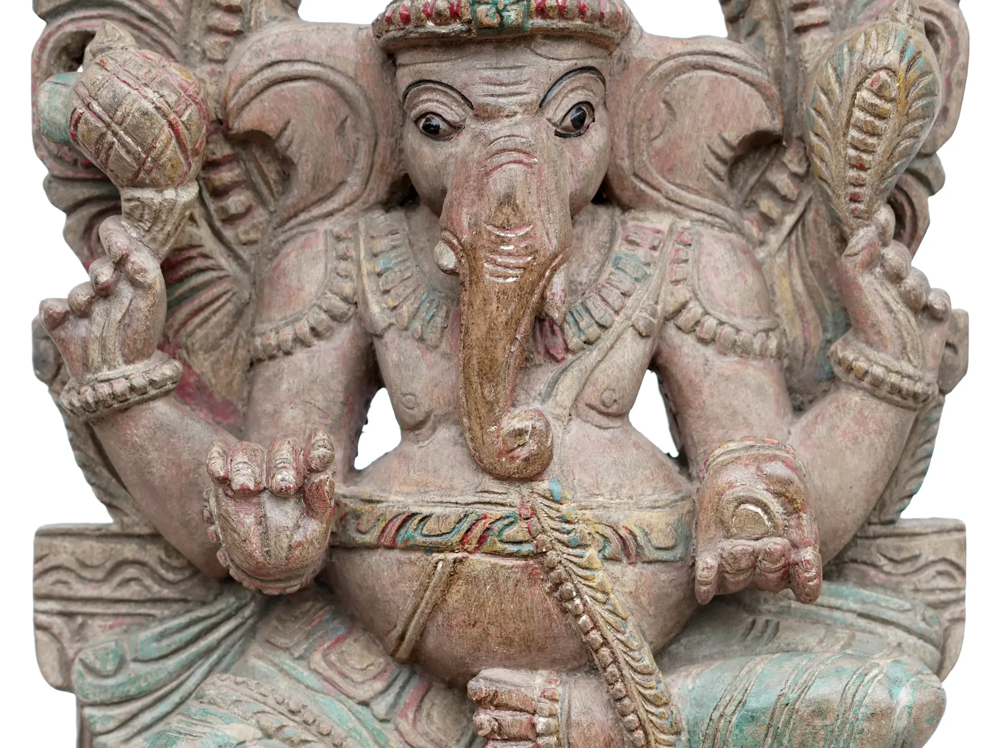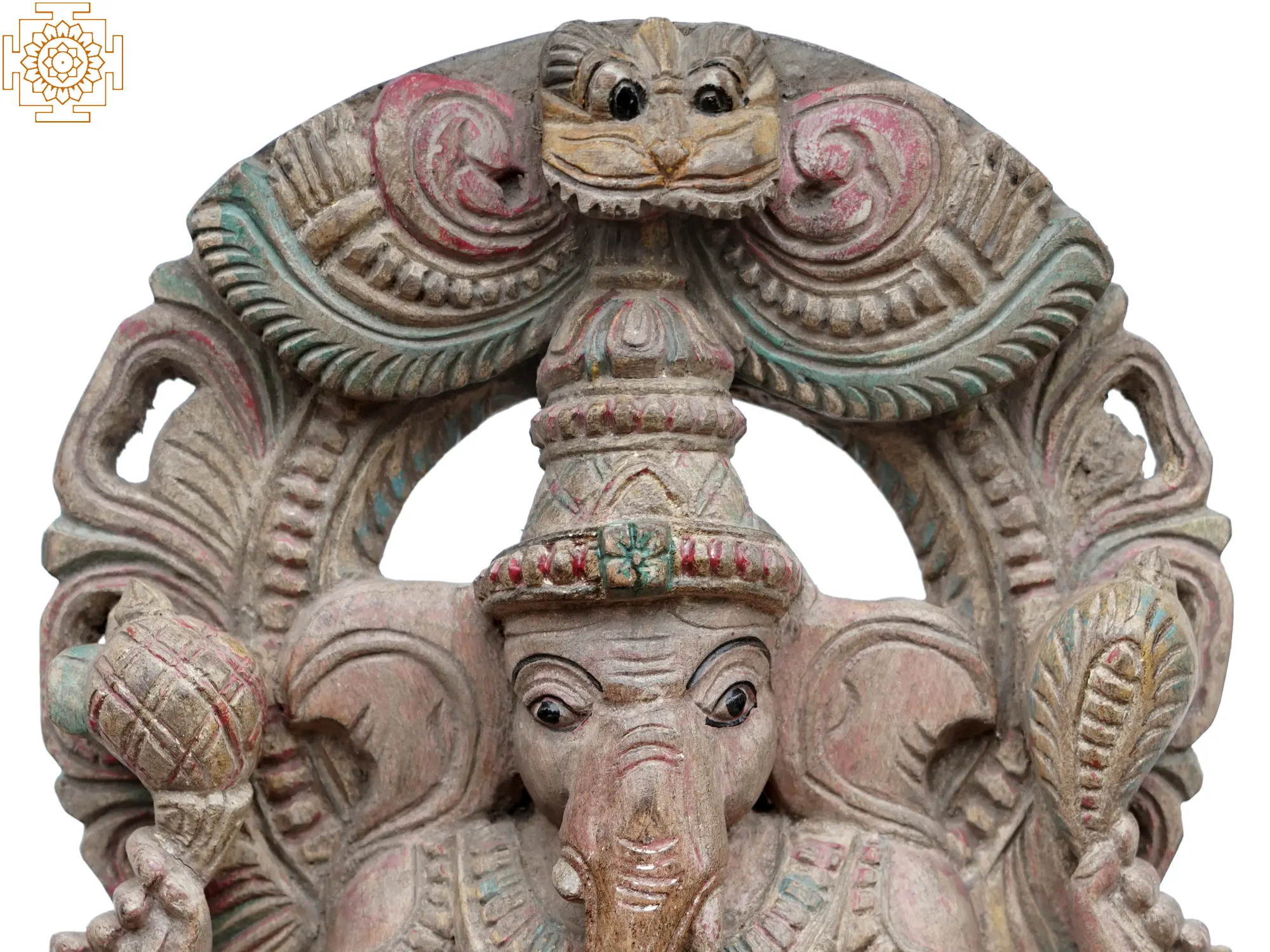 In this wooden statue, “Lord Ganesha” reigns in eternal grace, seated upon a lotus that gracefully emerges from a magnificent Kirtimukha throne. His presence, a mesmerising blend of divinity and artistry, captures the essence of his benevolent persona. With a belly that symbolises abundance and wisdom, his large trunk represents adaptability and strength, while his beautiful eyes reflect the omniscience of the divine. In his upper hands, Ganesha wields a goad and a noose, guiding souls with compassion. With a broken tusk, he symbolises sacrifice, and a Modak in his hand, the sweetness of life. Adorned with regal jewellery and a crown, this colourful masterpiece embodies Ganesha’s role as the remover of obstacles and the bestower of blessings, resonating with a message of wisdom, abundance, and boundless grace.