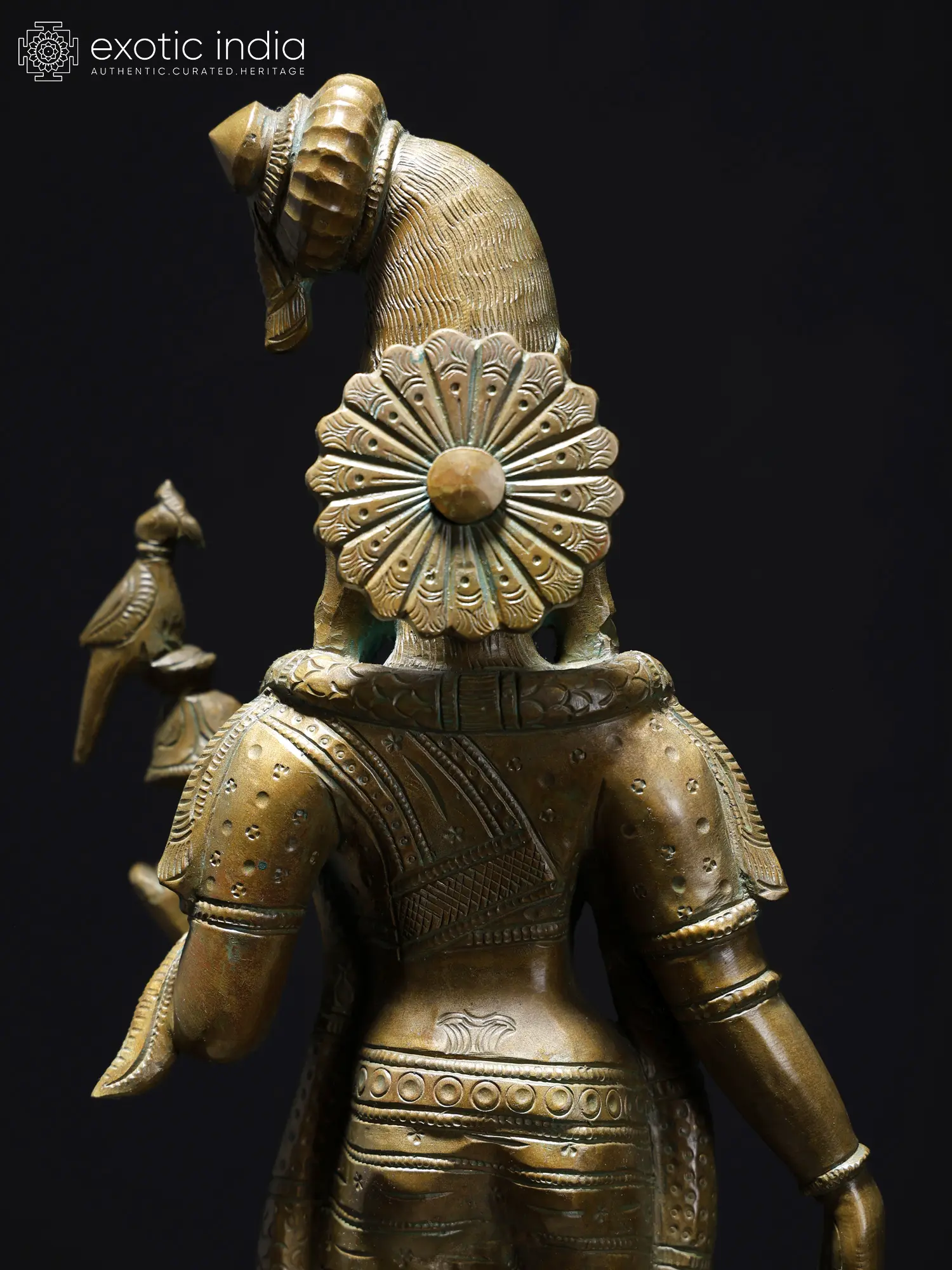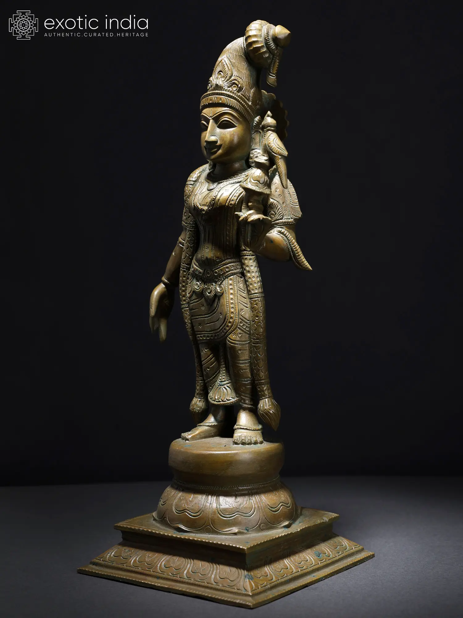 The lovely bride of Sri Ranganatha is depicted in this traditionally crafted Swamimalai bronze with a charming smile, adorned with a Madisar style drape, Andal kondai hairdo, jeweled ornament, and the floral garland of Vishnu, holding the flower with parrot, her characteristic attribute.