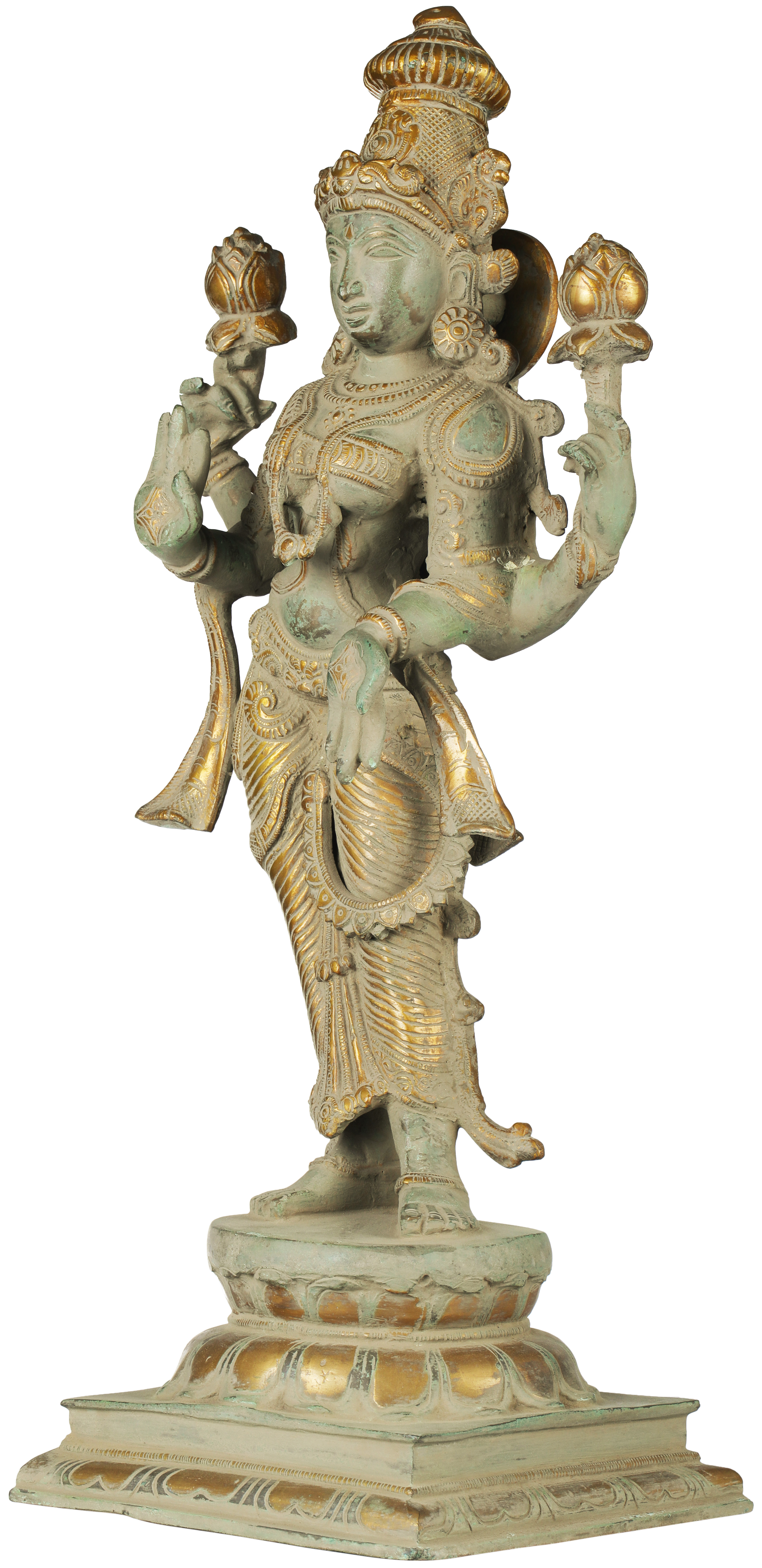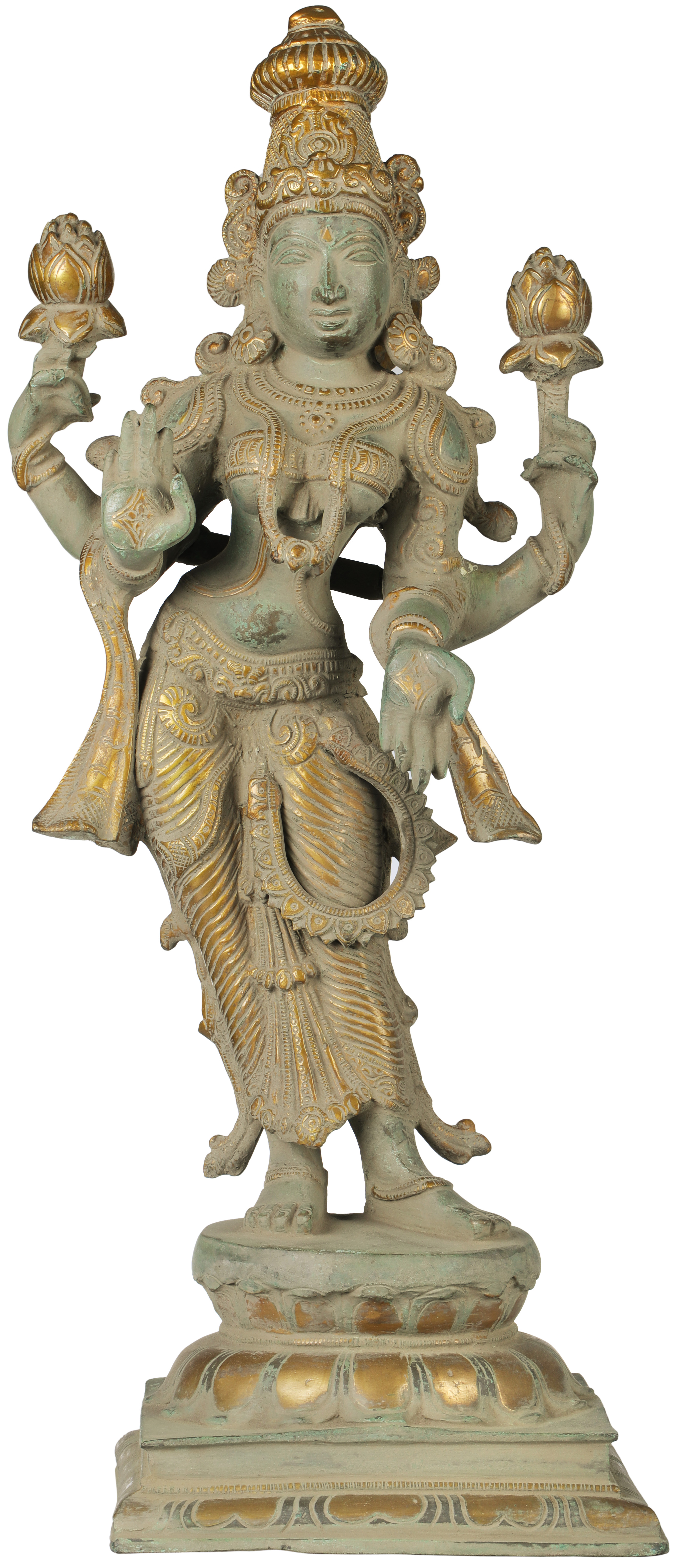 This exquisite 18-inch brass statue of Goddess Lakshmi is a testament to the rich artistic heritage of India. Handcrafted by skilled artisans, it captures the divine essence of Lakshmi, the Hindu goddess of wealth, prosperity, fortune, and abundance. Lakshmi is often depicted with four arms, each holding a symbol of her blessings: lotuses, which represent purity and enlightenment; gold coins, symbolizing material wealth; a conch shell, representing the sacred sound of creation; and a mace, a symbol of power and protection. Our statue beautifully portrays these attributes, showcasing the intricate details and artistry that define traditional Indian craftsmanship. The warm golden hue of the brass enhances the statue's splendor, creating a captivating piece that is both visually stunning and spiritually significant.