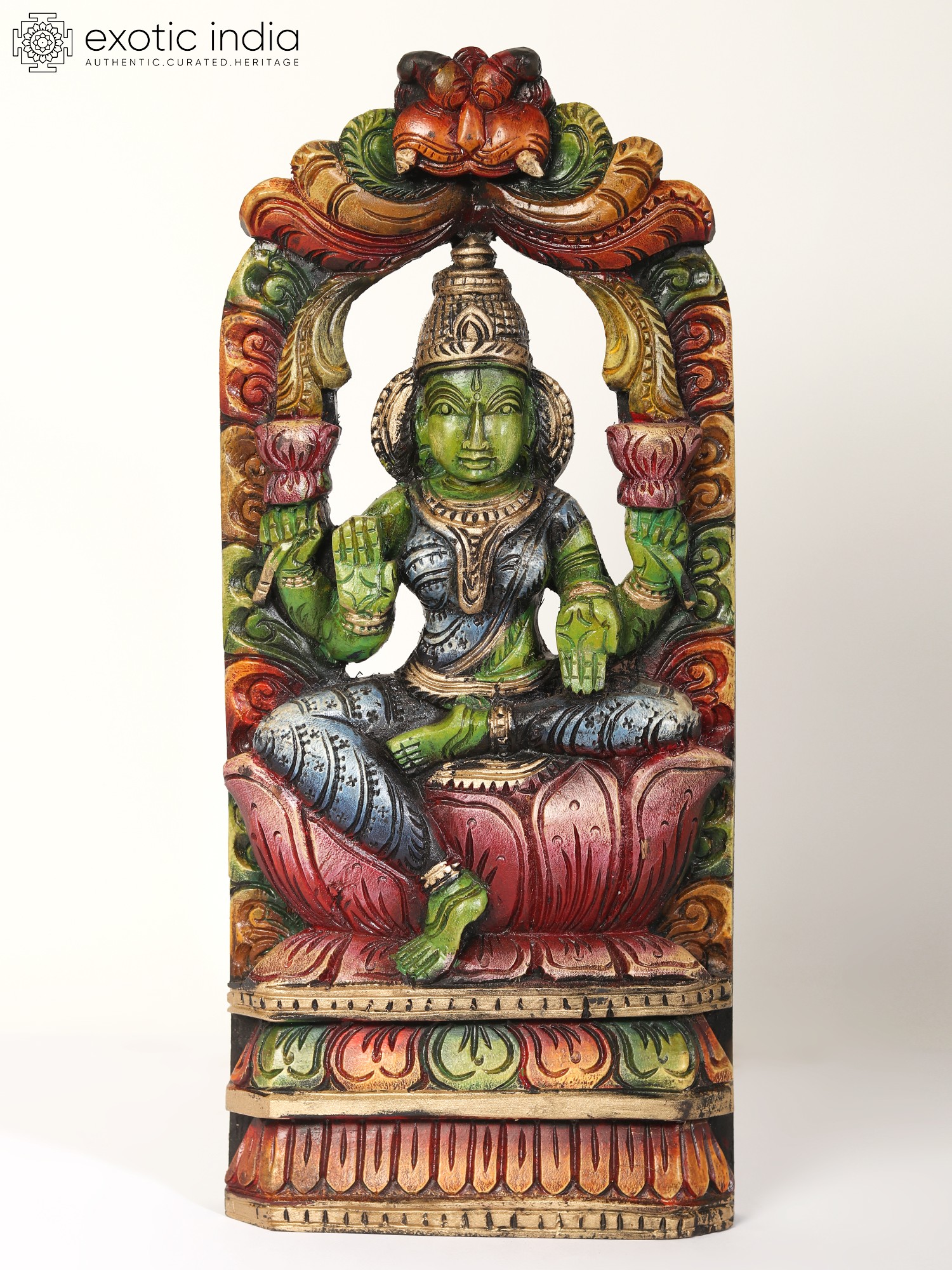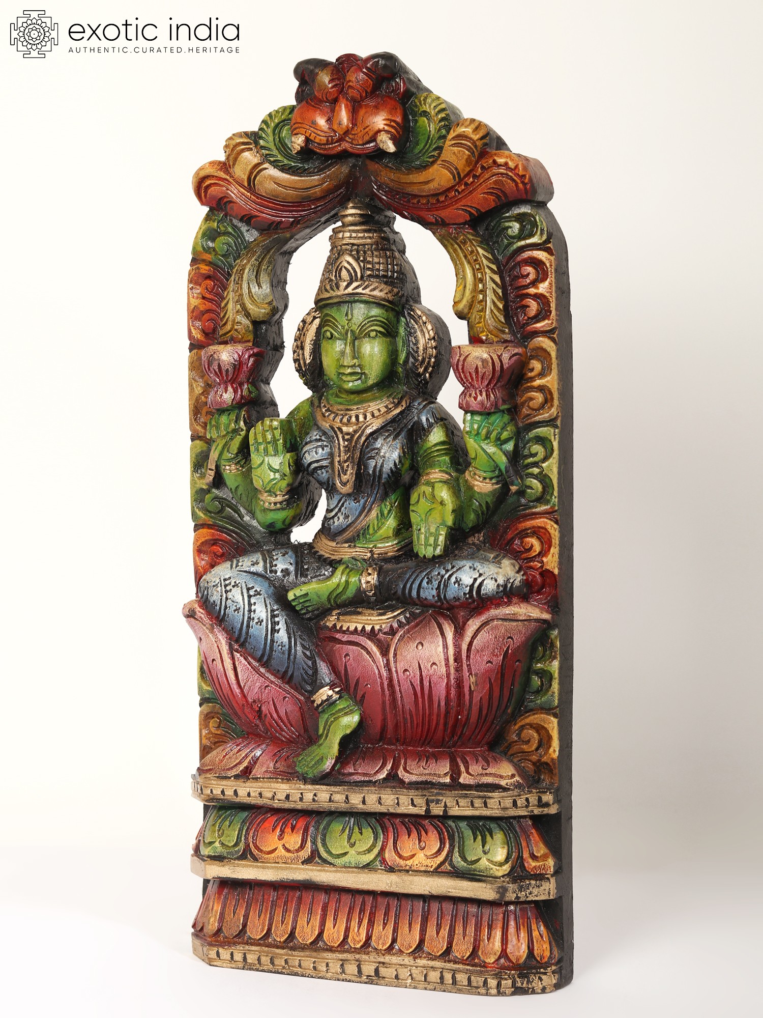 This exquisite 18-inch wooden statue of Goddess Lakshmi, seated gracefully on a lotus blossom, is a testament to the artistry and spiritual depth of Indian culture. Lakshmi, the Hindu goddess of wealth, prosperity, and fortune, is revered as the consort of Lord Vishnu. Her presence is believed to bring abundance not only in material possessions but also in love, health, and spiritual growth. This meticulously hand-carved statue is more than just a decorative piece; it's an invitation to welcome divine blessings into your home or workspace. The vibrant colors and intricate details capture the essence of Lakshmi's radiant beauty and benevolent nature.