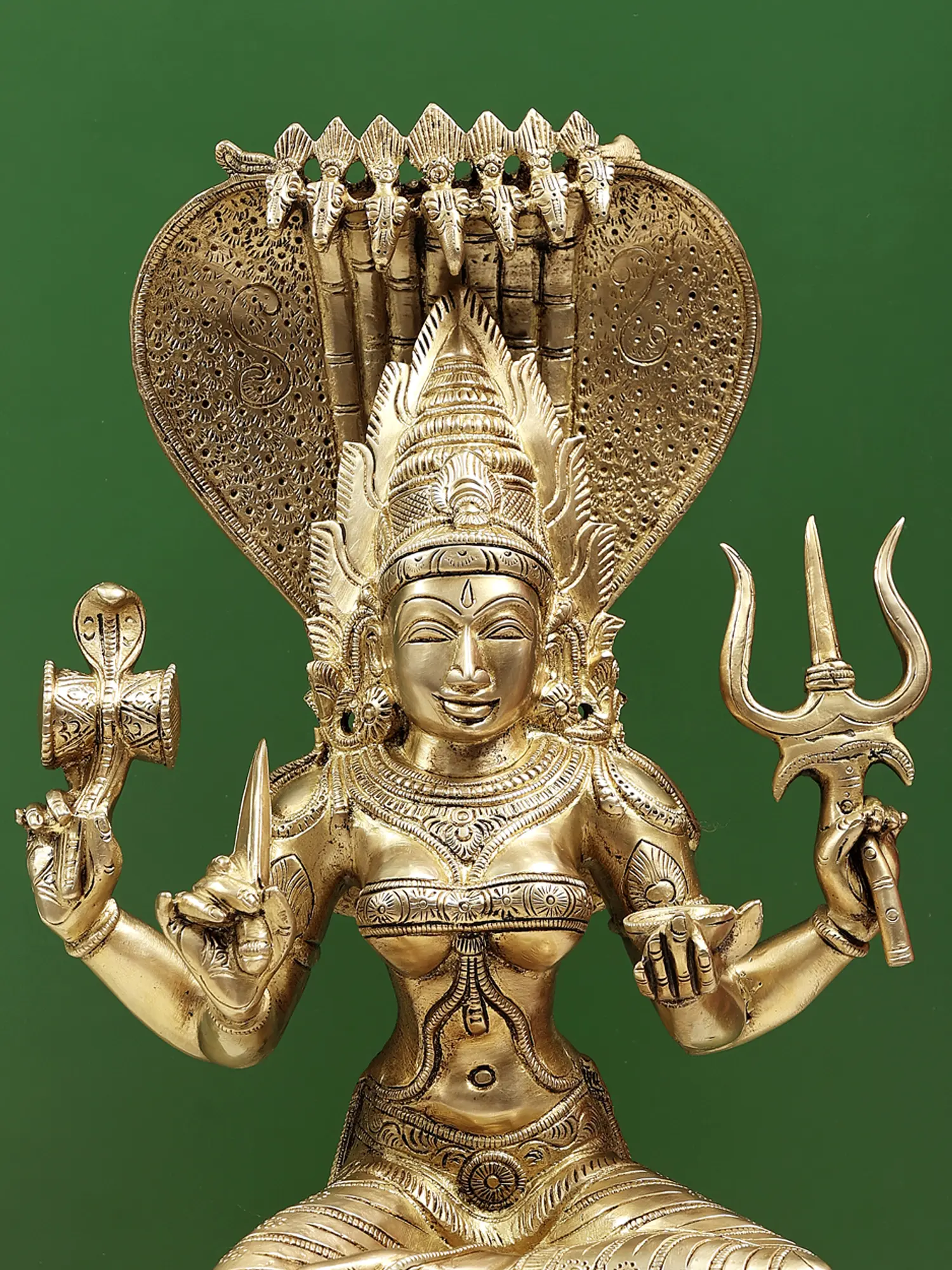 A seven-hooded serpent shades Mariamman, a representation of Kundalini energy, forming an infinity knot on the reverse of the statue, with fine etchings all over, giving a skin-like texture to the serpent.