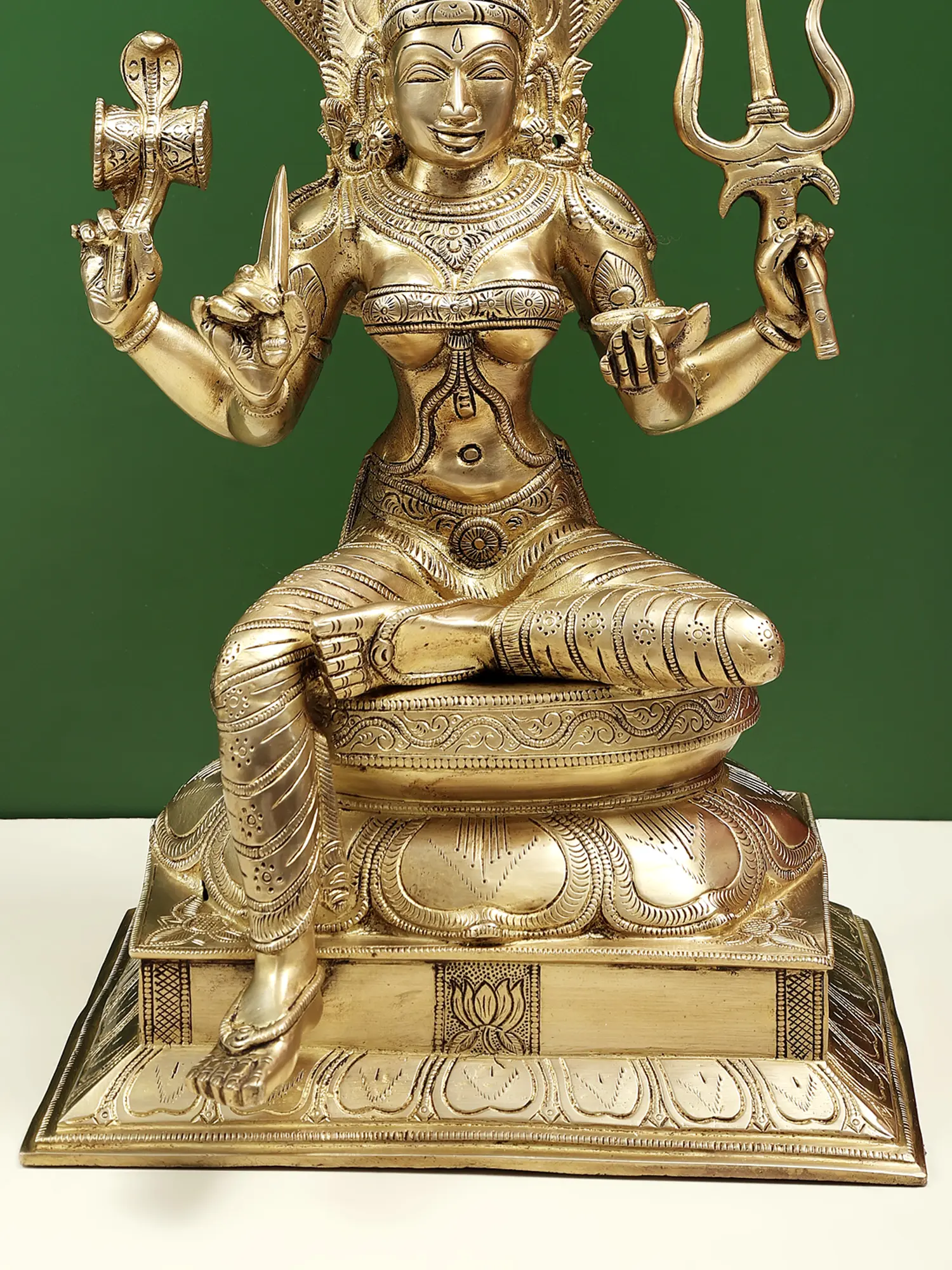 The goddess is enthroned on an inverted lotus, placed on another pedestal, a marker of her regalia as the guardian of the Universe (symbolized often by the lotus flower), with a blooming lotus delineated on the front of the platform.