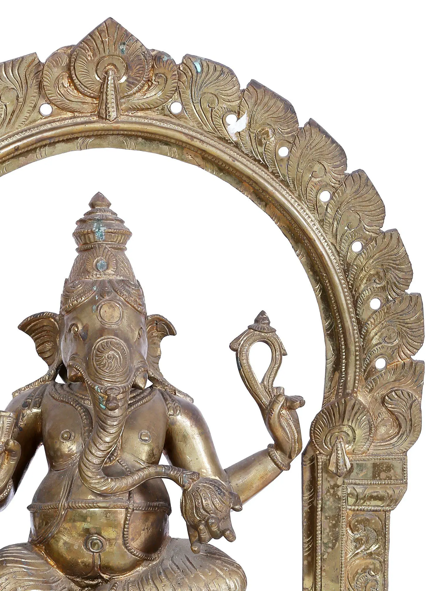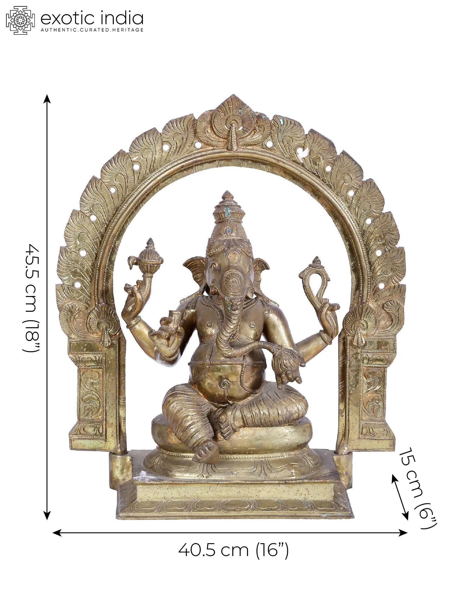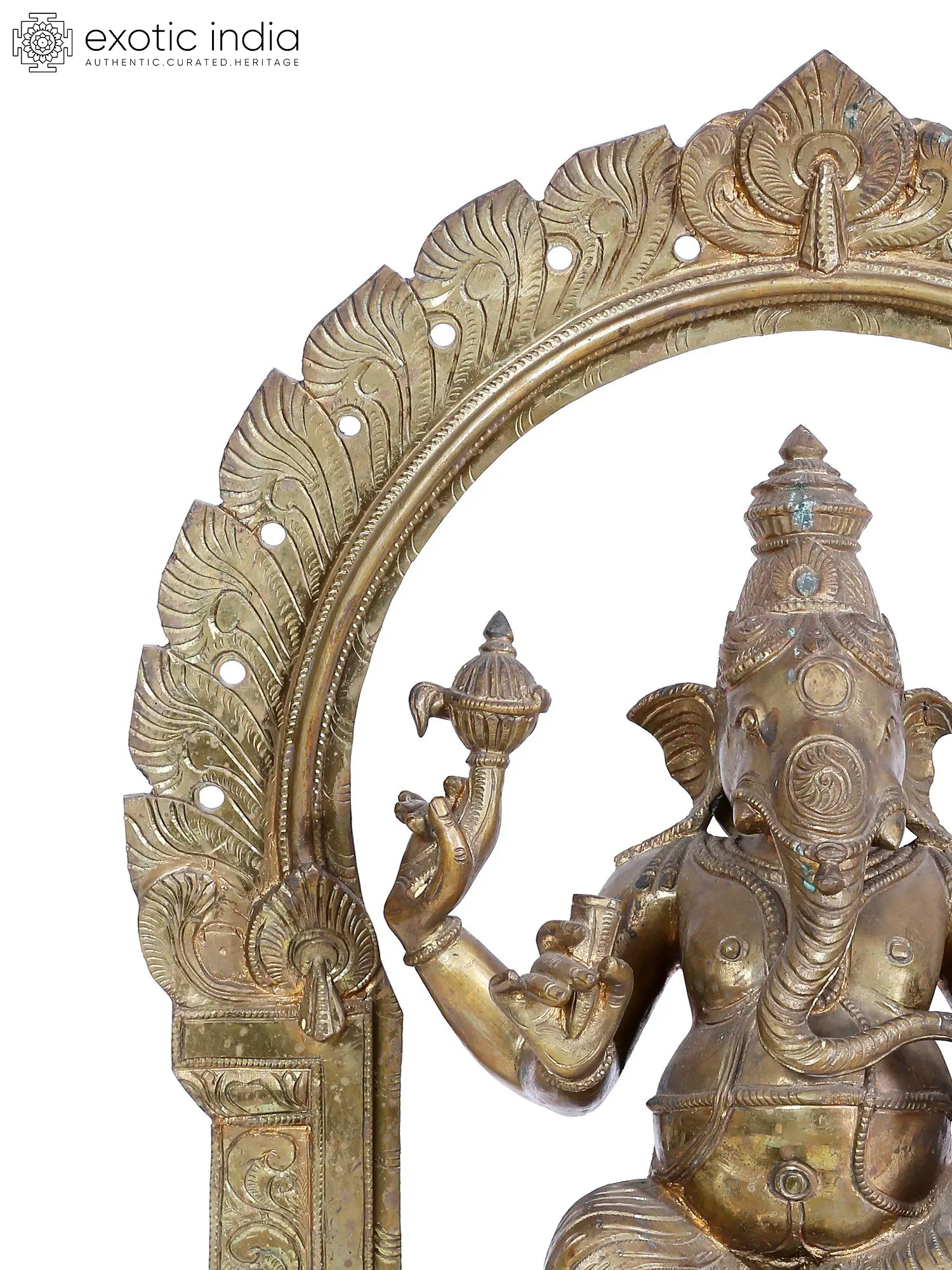 Bask in the tranquil aura of Haridra Ganapati is a serene sculpture meticulously crafted through Madhuchista Vidhana in the sacred Panchaloha Bronze from Swamimalai. This statue is distinct since his picture carries the attributes of Haridra Ganapati. He has four hands, each carrying a broken tusk, an elephant goad, a noose, and his favorite food, a delicious Modak (dumpling). Devotees think that the noose will keep them close to the Lord and help them succeed in life with his goad. Turmeric is a blessed ingredient with tremendous medical benefits. As a result, it is thought that worshiping the turmeric-made idol of Haridra Ganapati at home will bring good health, money, and success. As you immerse yourself in the details of this sculpture, let the peaceful vibrations of Shanti Ganesha permeate your surroundings, bringing a sense of calm and serenity.