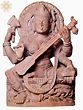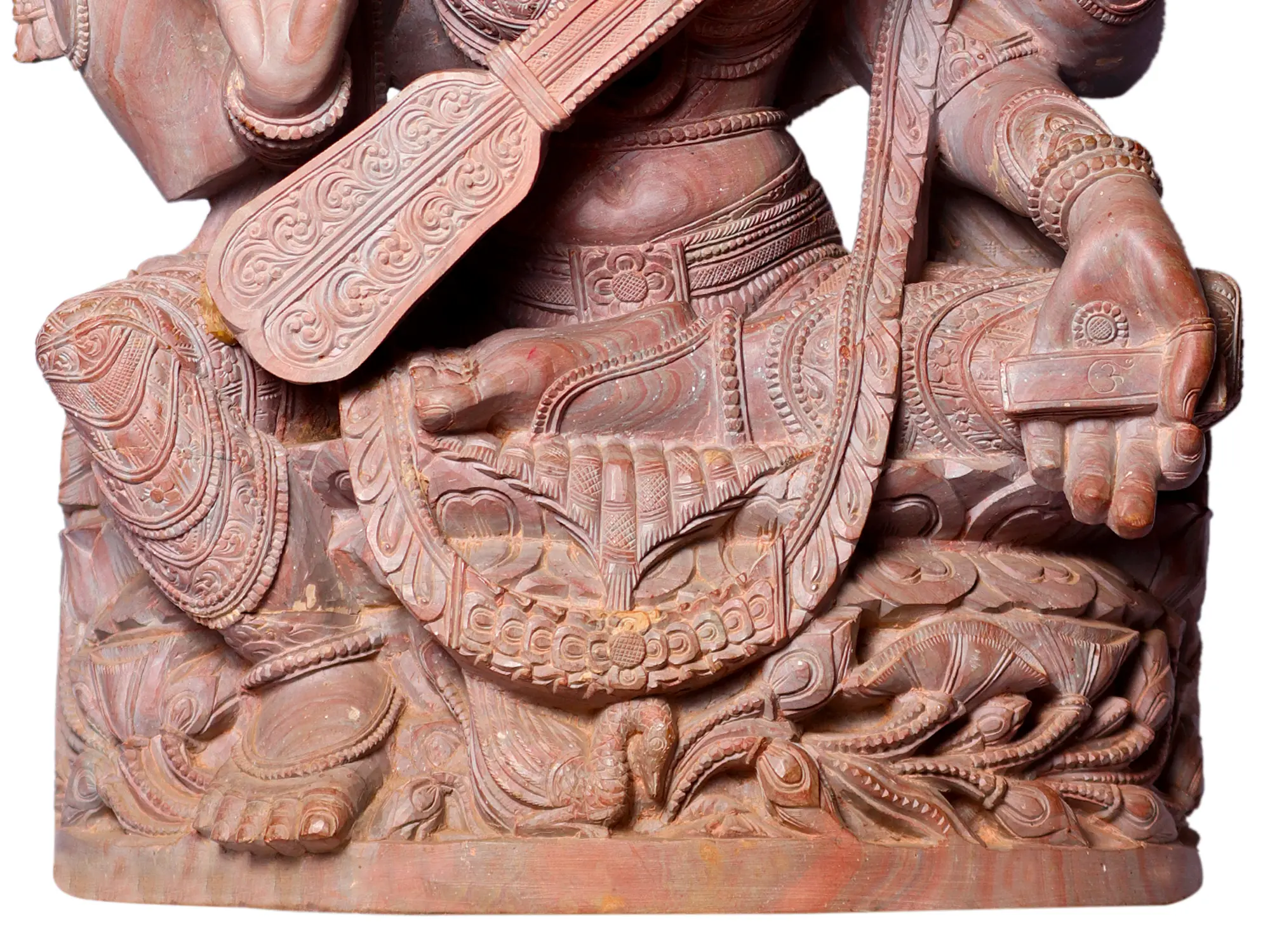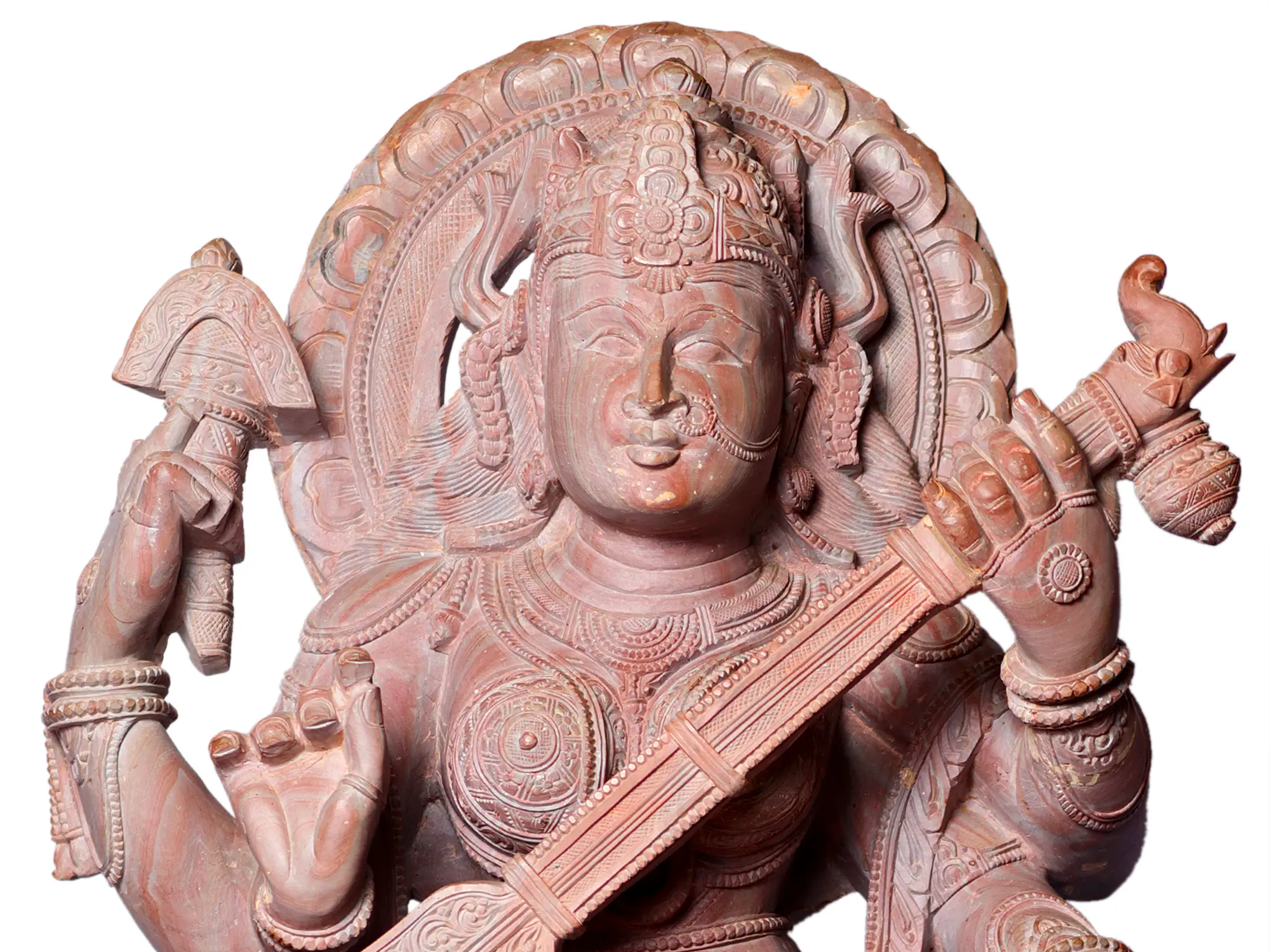 8" Goddess Saraswati Holding Veena | Red Stone Statue | Hand Carved