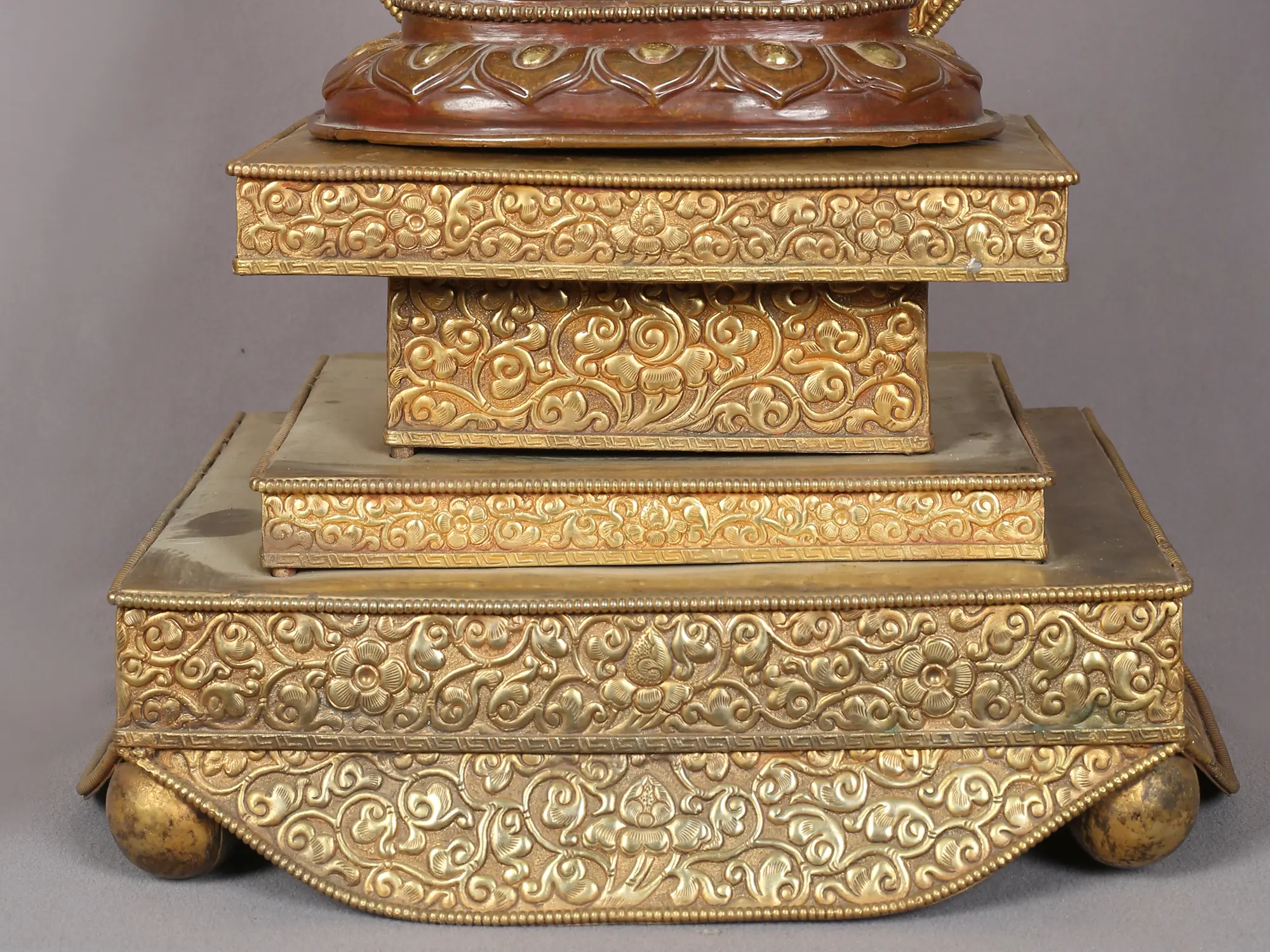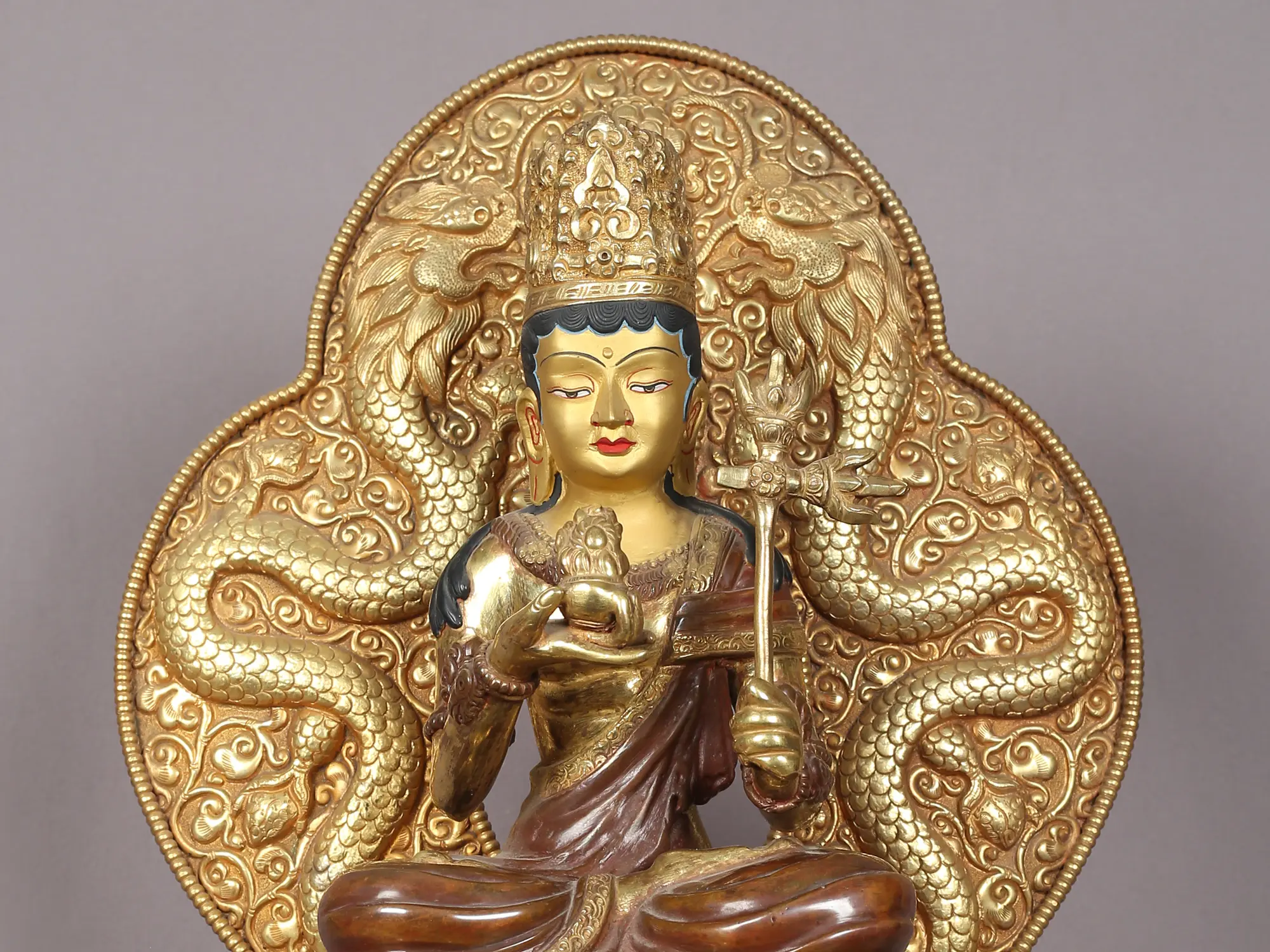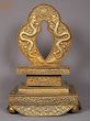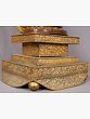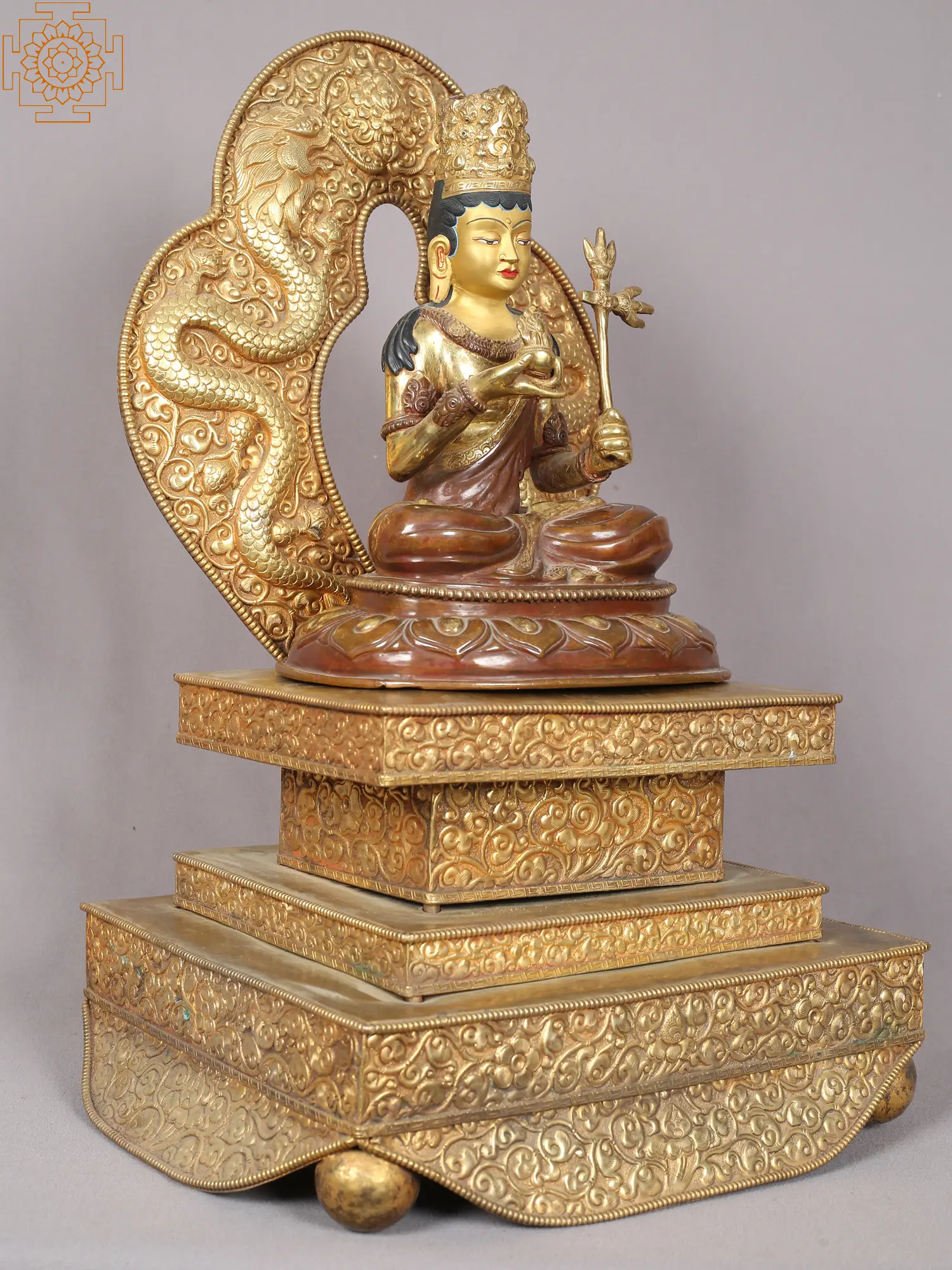 The golden-colored Japanese Lama Guru with Throne sculpture radiates an aura of spiritual illumination and guidance. Expertly fashioned, the lama guru sits regally upon an exquisitely adorned throne, symbolizing the elevated wisdom and authority he embodies. The golden hue evokes the sacred light of enlightenment, while intricate patterns on the throne enhance its regal presence. The lama guru's serene expression reflects deep insight and compassion, resonating with Japanese spiritual teachings. This sculpture reverently honors the wisdom of Japanese spiritual traditions. The amalgamation of the lama guru and the ornate golden throne imbues a sense of revered mentorship and spiritual leadership. Whether displayed in homes or sacred spaces, the Japanese Lama Guru with Throne sculpture serves as a focal point for seeking guidance, connecting with ancient teachings, and embracing the transformative path of spiritual growth.