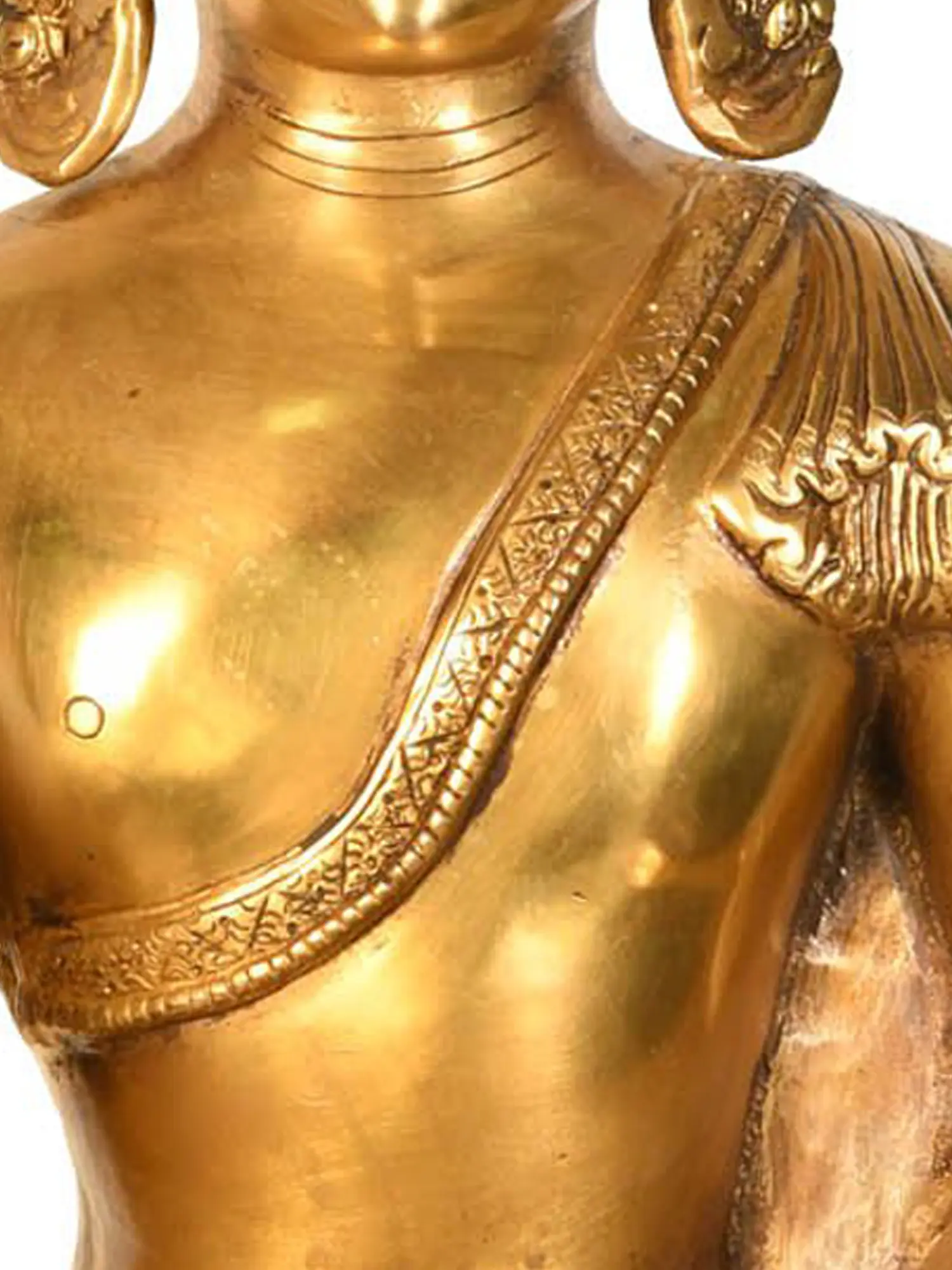 Handcrafted in India, this brass statue is a testament to the enduring legacy of traditional Indian artistry. The skilled artisans have poured their dedication and devotion into every curve and contour, resulting in a piece that is both aesthetically breathtaking and spiritually resonant. The warm, lustrous glow of the brass lends a timeless quality to the sculpture, making it a truly special addition to any sacred space or collector's ensemble. The dedication to detail is evident in the delicate rendering of the urna on his forehead, a symbol of his spiritual insight, and the subtle curls of his hair, all rendered with remarkable precision.