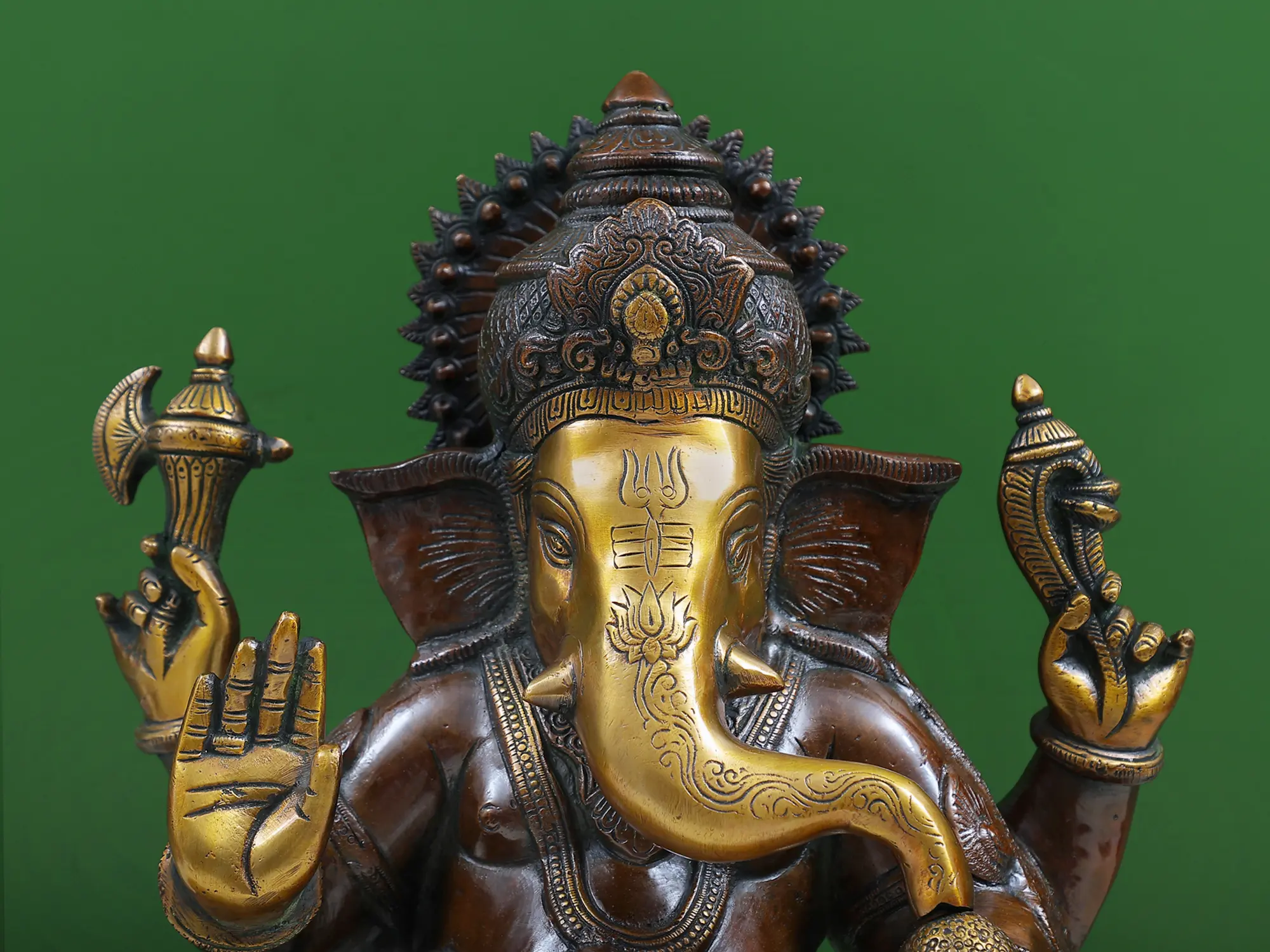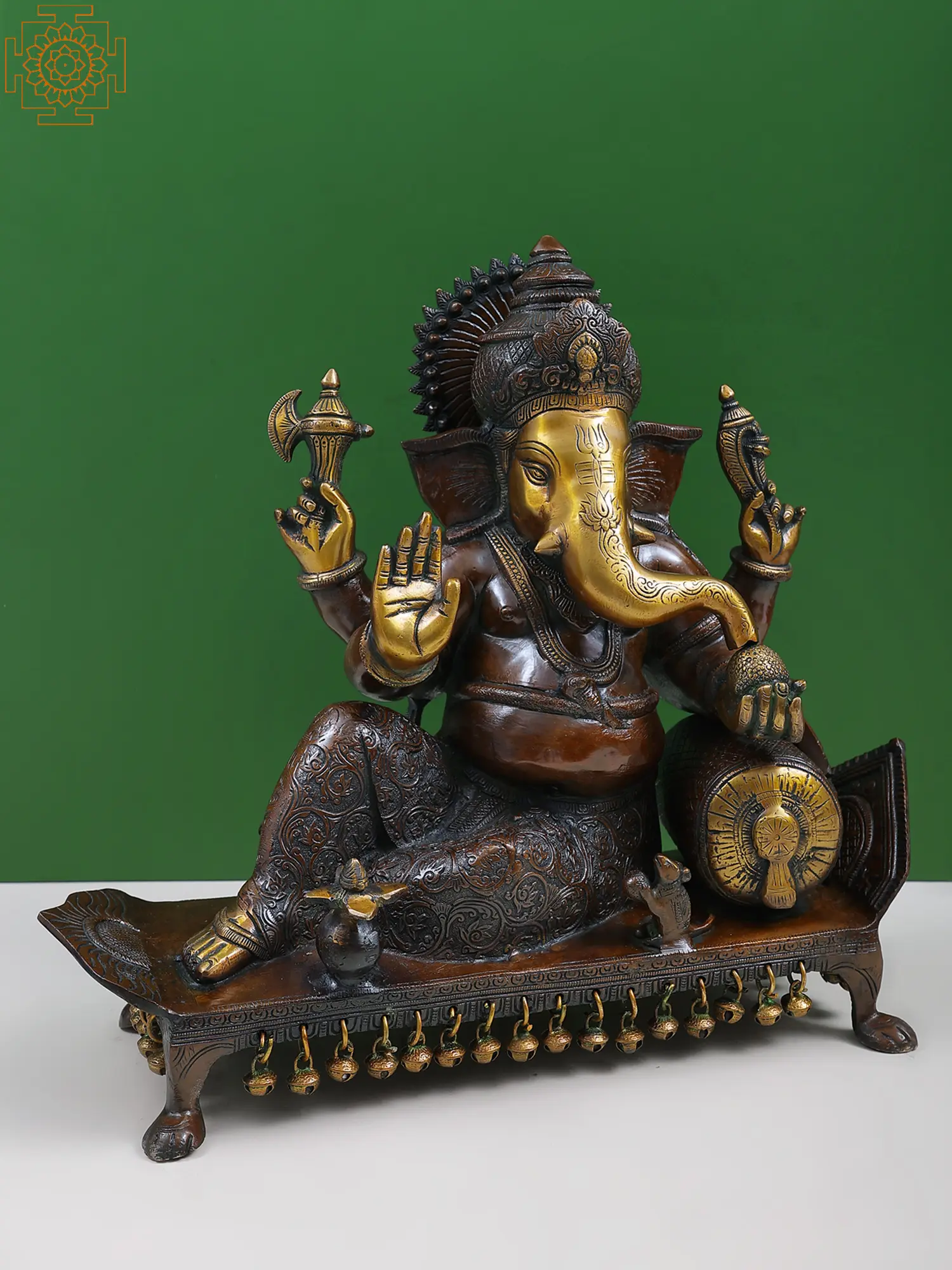 Let's pray to the lord of Gana’s and ask for his blessings. This stunning brass statue of Ganesh, in a regal attitude, exudes both beauty and spiritual power. Ganesh, the famed Hindu god, is seated gracefully in Raja lilasana atop a pedestal, symbolizing his dominion over the Raj Yog or Ruler qualities. It is composed of high-quality brass with a warm glow and a bright brilliance that captures the eye. The statue is made more appealing by the employment of gold painting on the deity's embellishments. The divine presence of Ganesh, along with the beauty of the chola brown hue, creates a peaceful and fortunate environment. This statue is a treasure to have and a source of inspiration for spiritual seekers, and it is appropriately proportioned to adorn any holy room or space.