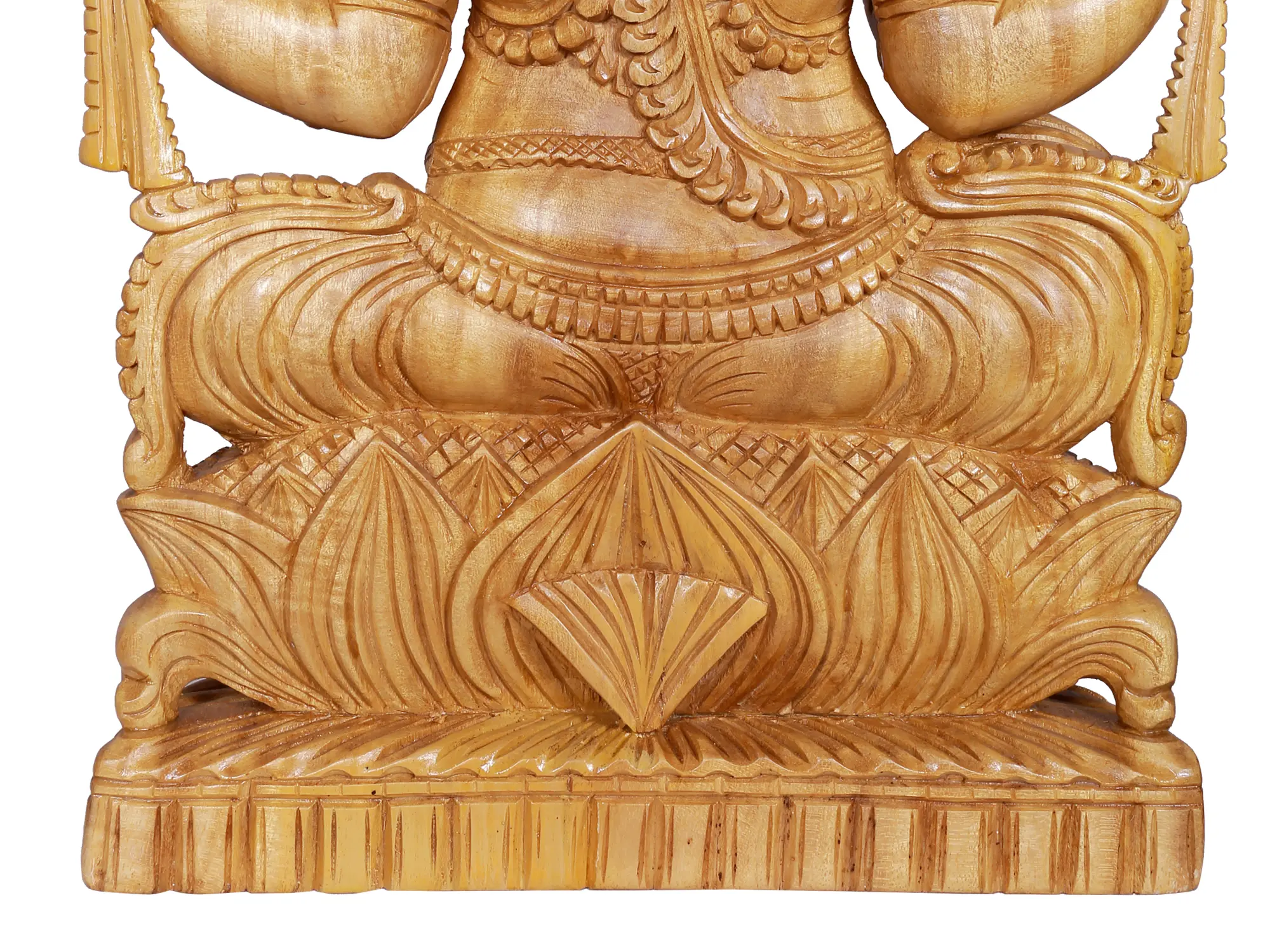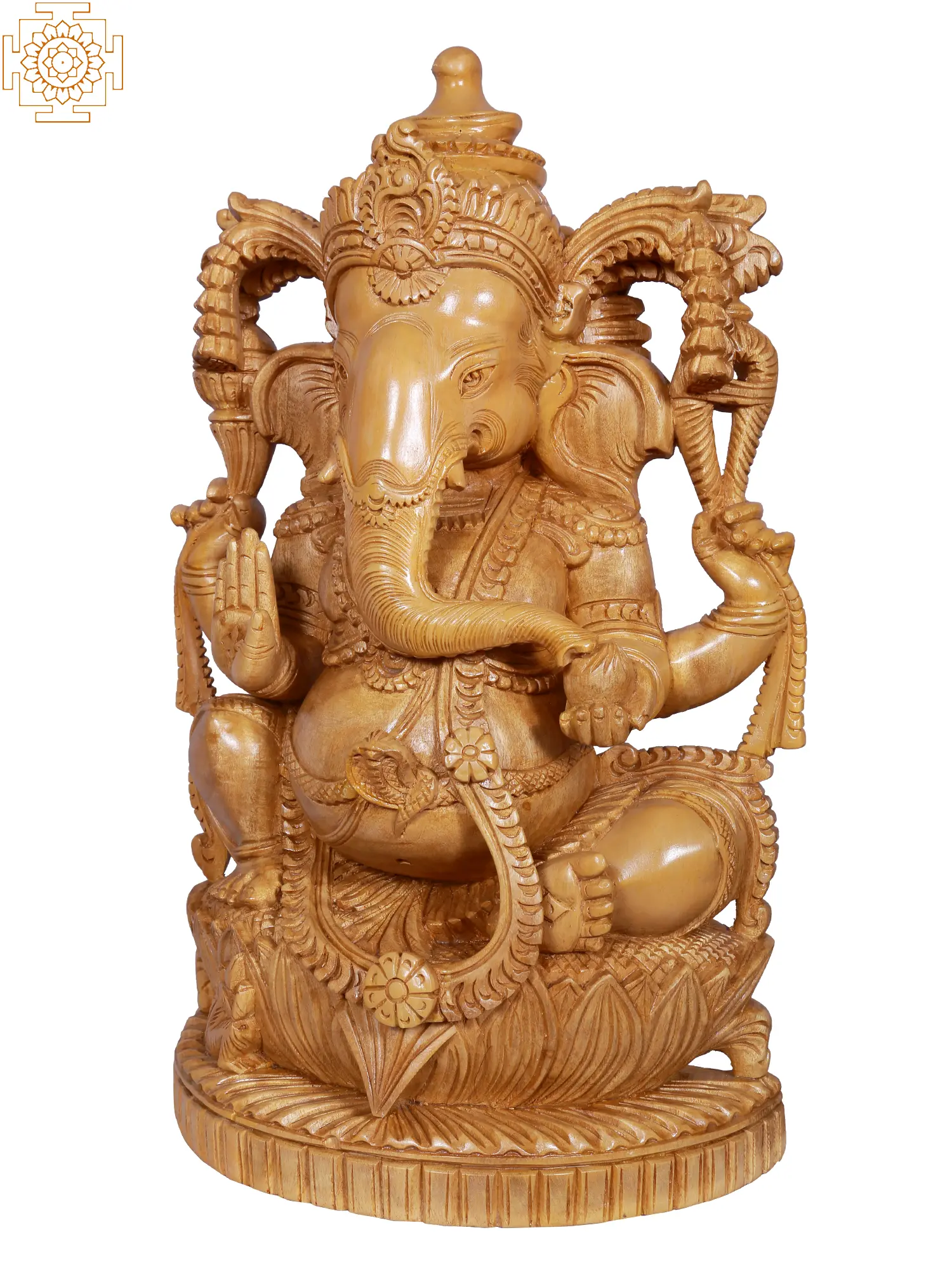 Invite divine blessings and profound peace into your home with this exquisite, hand-carved wooden representation of Lord Ganesha. Known as the remover of obstacles and the bestower of good fortune, Ganesha is one of the most revered deities in the Hindu pantheon. This magnificent statue captures his benevolent presence, seated majestically upon a lotus pedestal, a symbol of purity and spiritual awakening. Crafted from fine Whitewood, the statue exhibits a warm, natural grain that enhances the intricate details of the carving. Each element, from the gentle curve of his trunk to the serene expression on his face, has been meticulously sculpted by skilled artisans, reflecting a deep understanding of sacred iconography. Lord Ganesha is depicted with his characteristic elephantine head, multiple arms, and a subtly rounded form, representing his immense power and nurturing nature. He holds various symbolic objects in his hands, each carrying profound meaning. The modak (sweet dumpling) in one hand signifies the sweetness of spiritual attainment, while the axe in another represents the power to sever attachments and obstacles. The lotus flower upon which he rests symbolizes the unfolding of consciousness and the achievement of spiritual perfection. The story of Ganesha's creation is as unique as his form. He is said to have been brought to life by Goddess Parvati from her own divine essence, a protective and beloved son. His victory over the gods, who initially blocked his path to his own father, Lord Shiva, cemented his status as the leader of the celestial hosts and the one who must be worshipped first in any sacred undertaking. This rich mythology imbues the statue with a spiritual depth, making it more than just an object of beauty, but a focal point for devotion and contemplation. This substantial 18-inch statue will be a commanding presence in any setting. Whether placed in your puja room for daily worship, on an altar for meditation, or as a striking decorative piece in your living space, it radiates an aura of tranquility and divine grace. The warm tones of the Whitewood will complement any decor, adding a touch of traditional Indian artistry and spiritual significance.