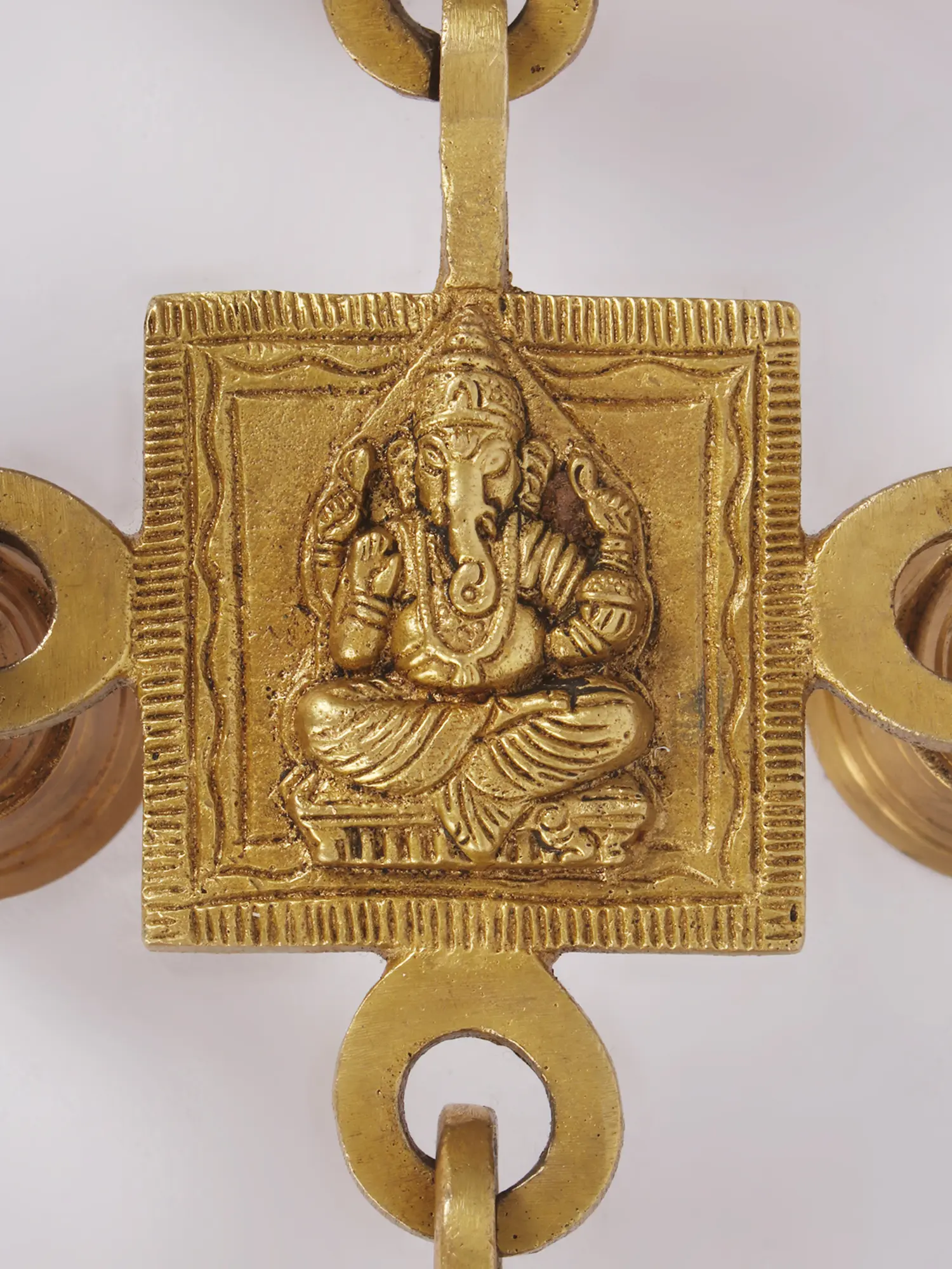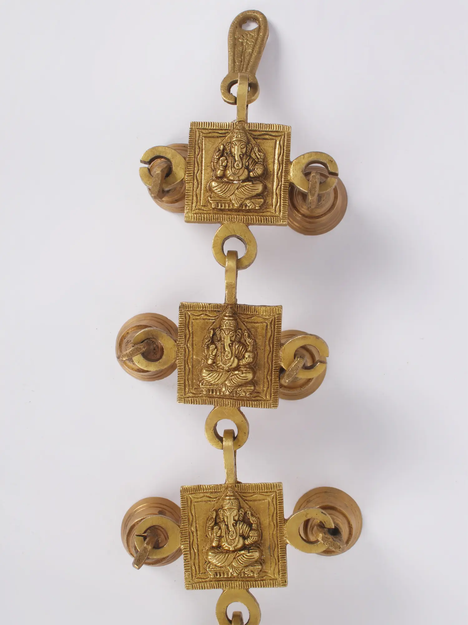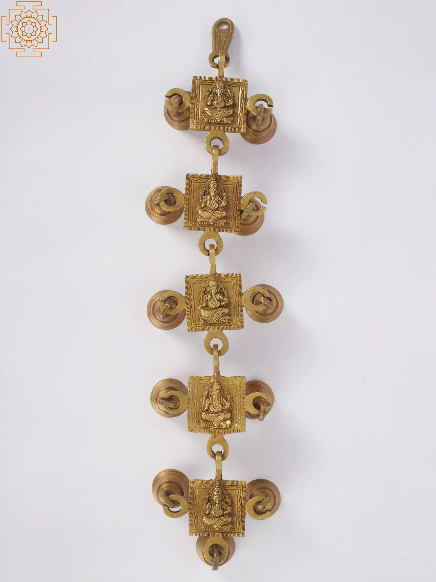 Invite the divine blessings of Lord Ganesha into your home with this exquisite Brass Wall Hanging adorned with bells. This unique piece seamlessly combines the auspicious presence of Ganesha with the delightful sound of tinkling bells -Lord Ganesha is revered as the Remover of Obstacles and the Lord of Beginnings. His image signifies the interconnectedness of divine grace and success. The melodious bells not only add charm to your surroundings but also resonate with cosmic vibrations, filling your space with positive energy.