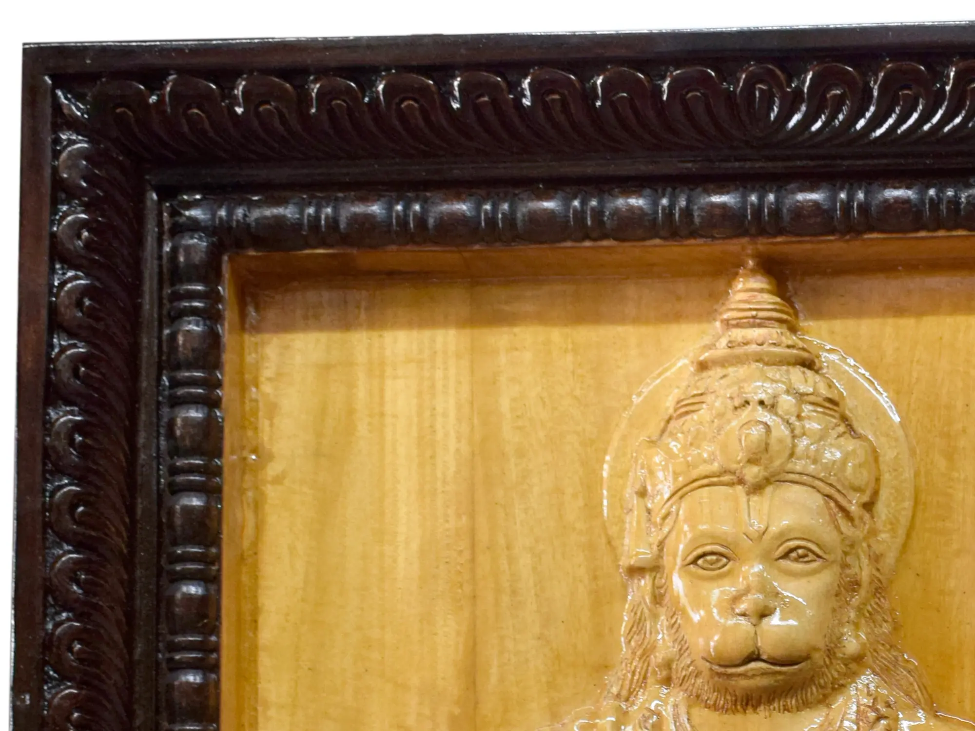 In the tranquil embrace of white cedar wood, “Lord Hanuman”, also known as “Maruti”, the embodiment of unwavering devotion and boundless strength, comes to life in a mesmerising wooden frame. With one knee gently grounded, his divine presence radiates serenity and power. His right hand is gracefully poised in the “Abhaya Mudra”, assuring protection and fearlessness to all who behold him. By his side, rests his mighty “Mace” (Gada), a symbol of his unwavering resolve to obliterate obstacles. Carved with meticulous precision, this sacred art piece captures the essence of Maruti, the epitome of devotion, loyalty, and might, offering connection to his eternal grace and resilience.