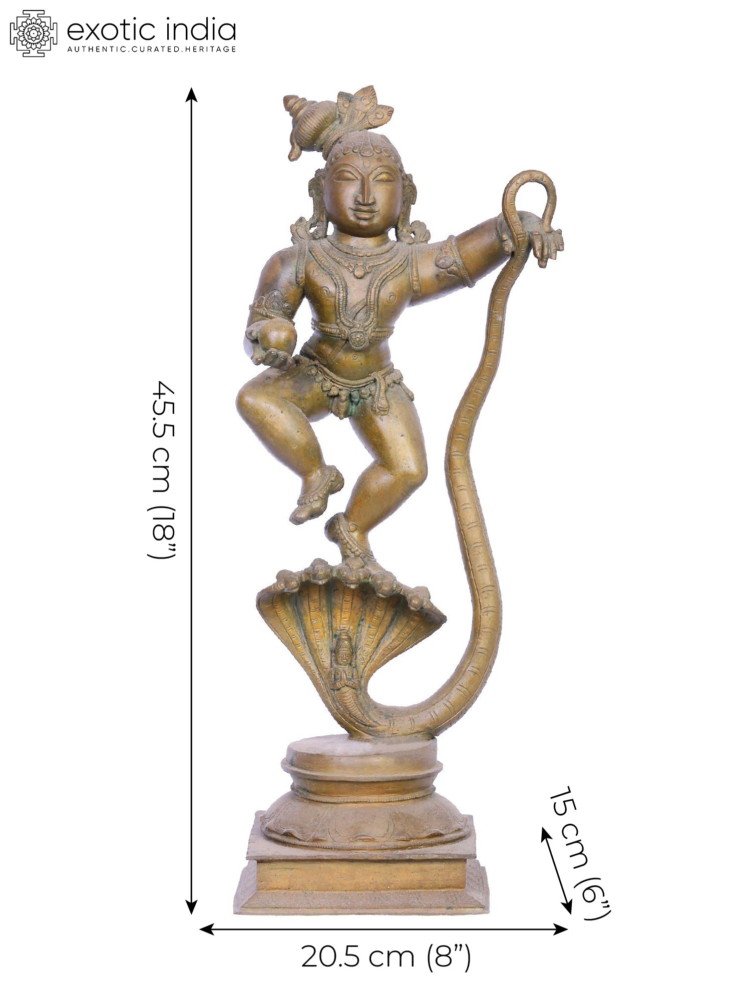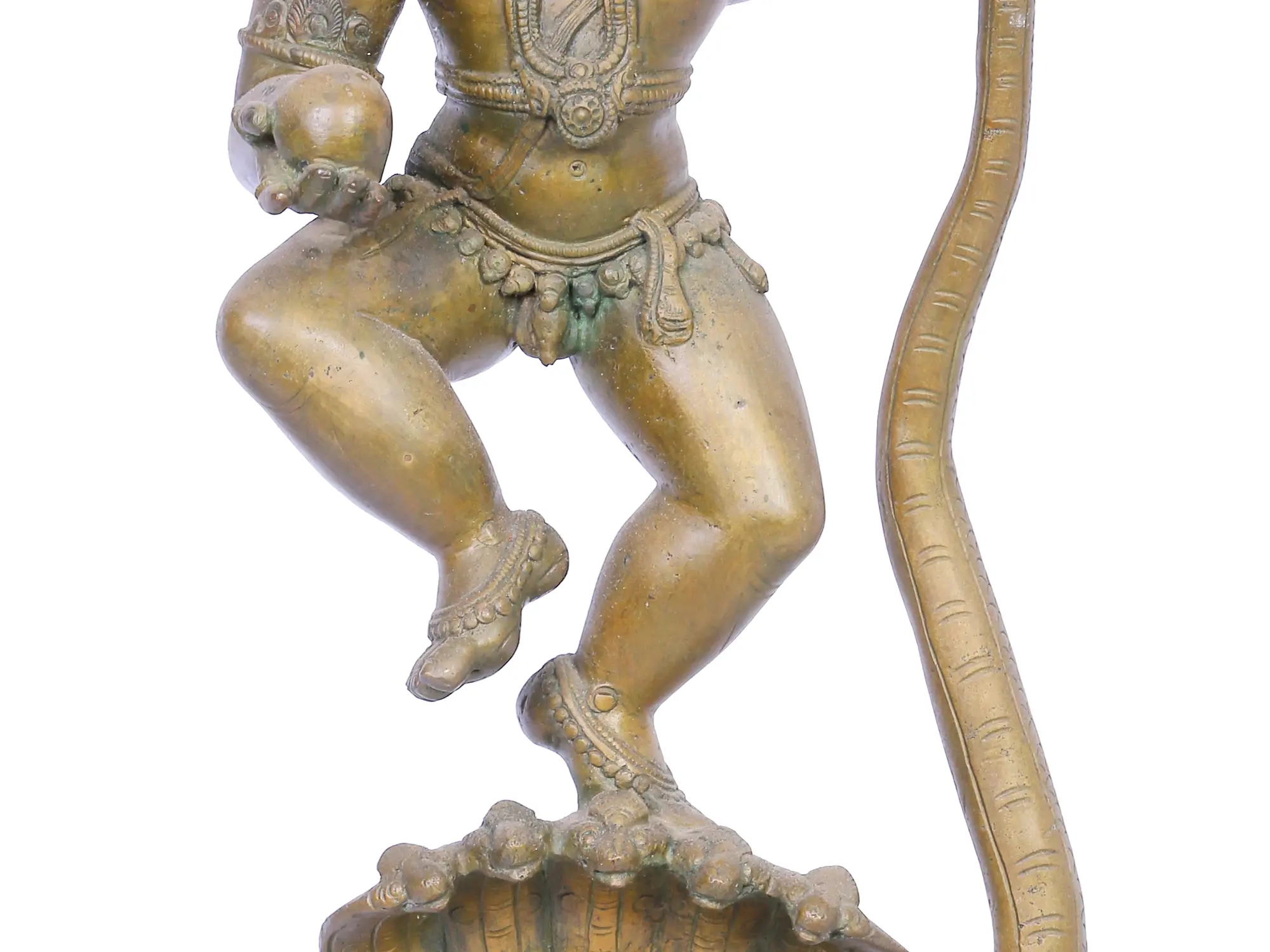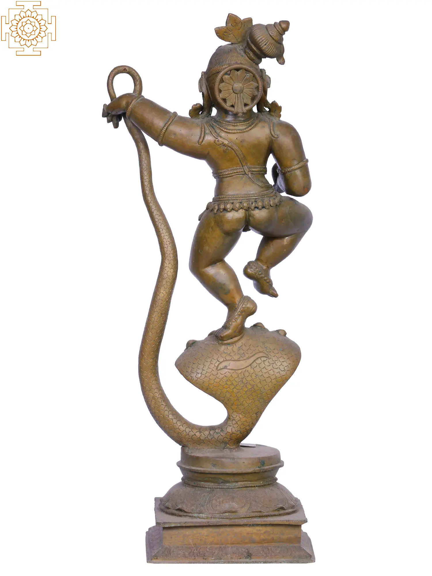 Innocent and powerful, the icon of Kaliya-Krishna is a masterpiece of Swamimalai bronze tradition, where heavenly stillness and dynamic vigor are captured in a single statue. This bronze Kaliya Krishna or Kalinga Krishna statue is a splendid icon, presenting a young Krishna majestically striking a lovely pose on the hood of Kaliya. Adorned in a traditional hairdo, necklaces, earrings, jeweled girdles, and anklets, Krishna in this aspect is “Natawara”- the supreme dancer.