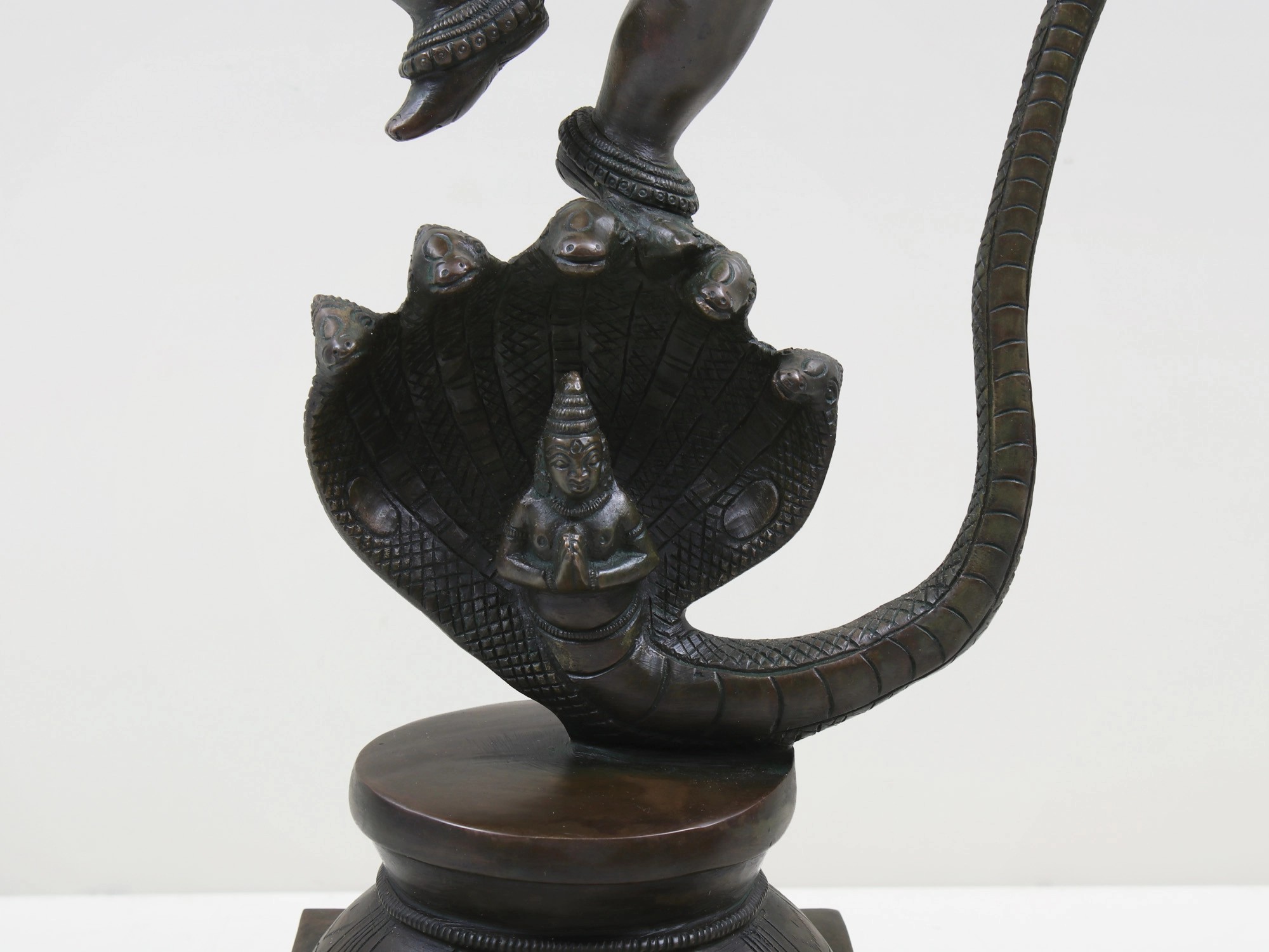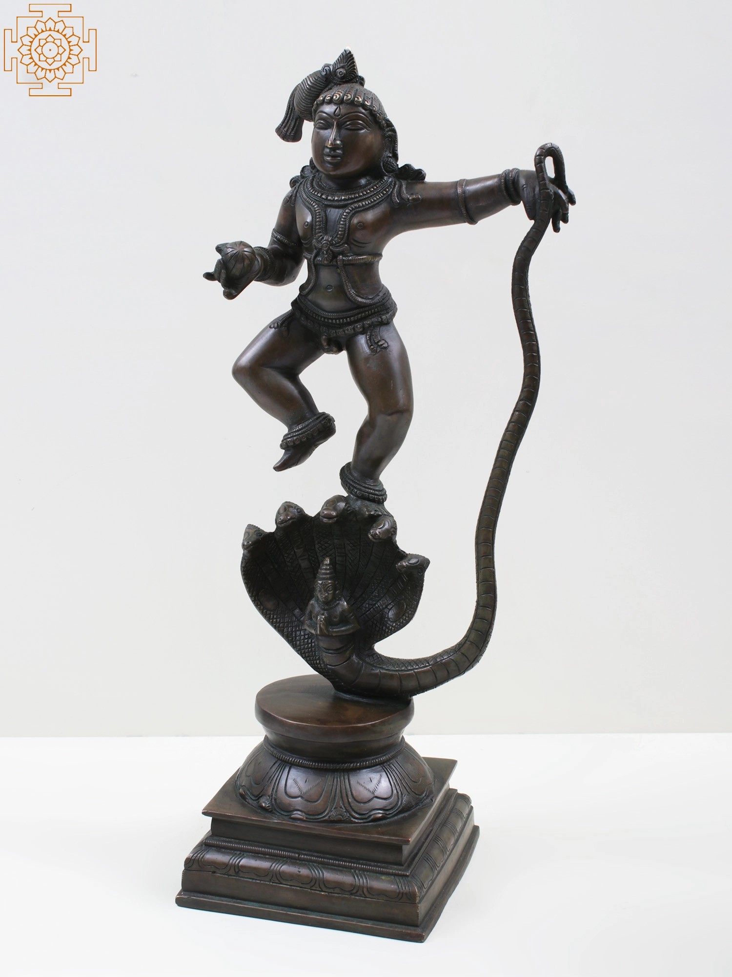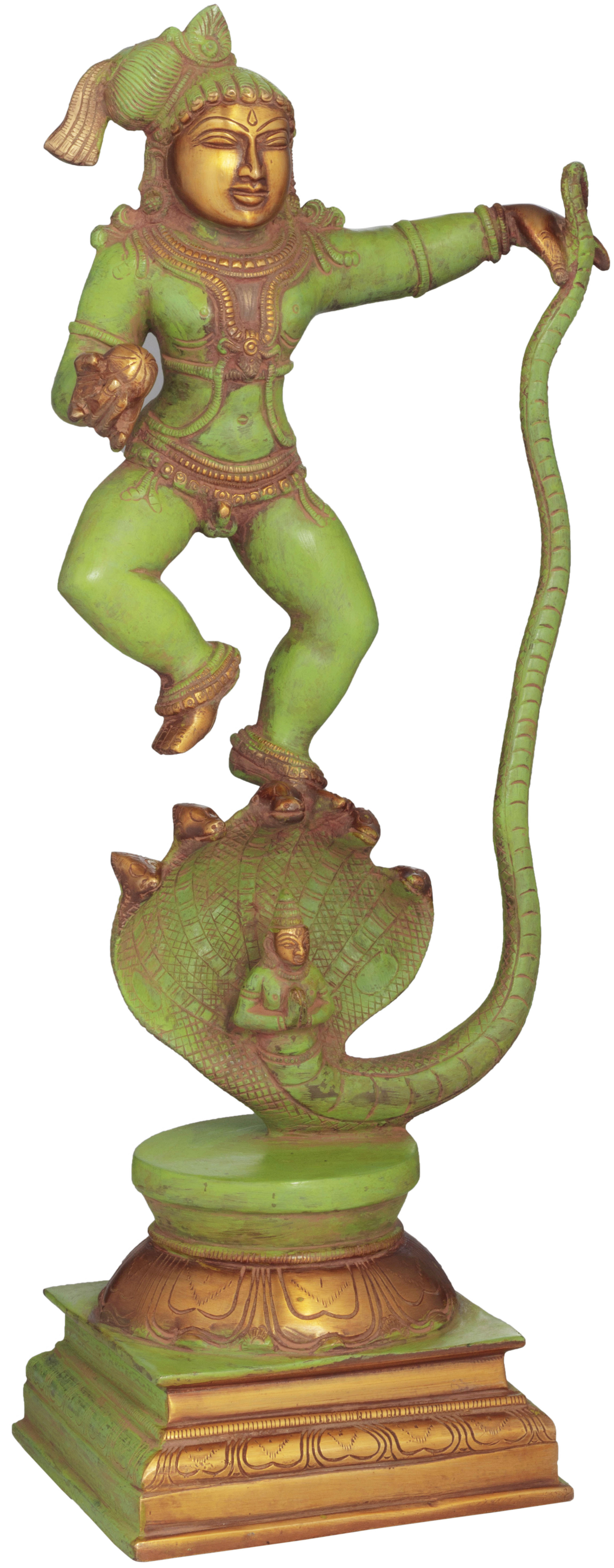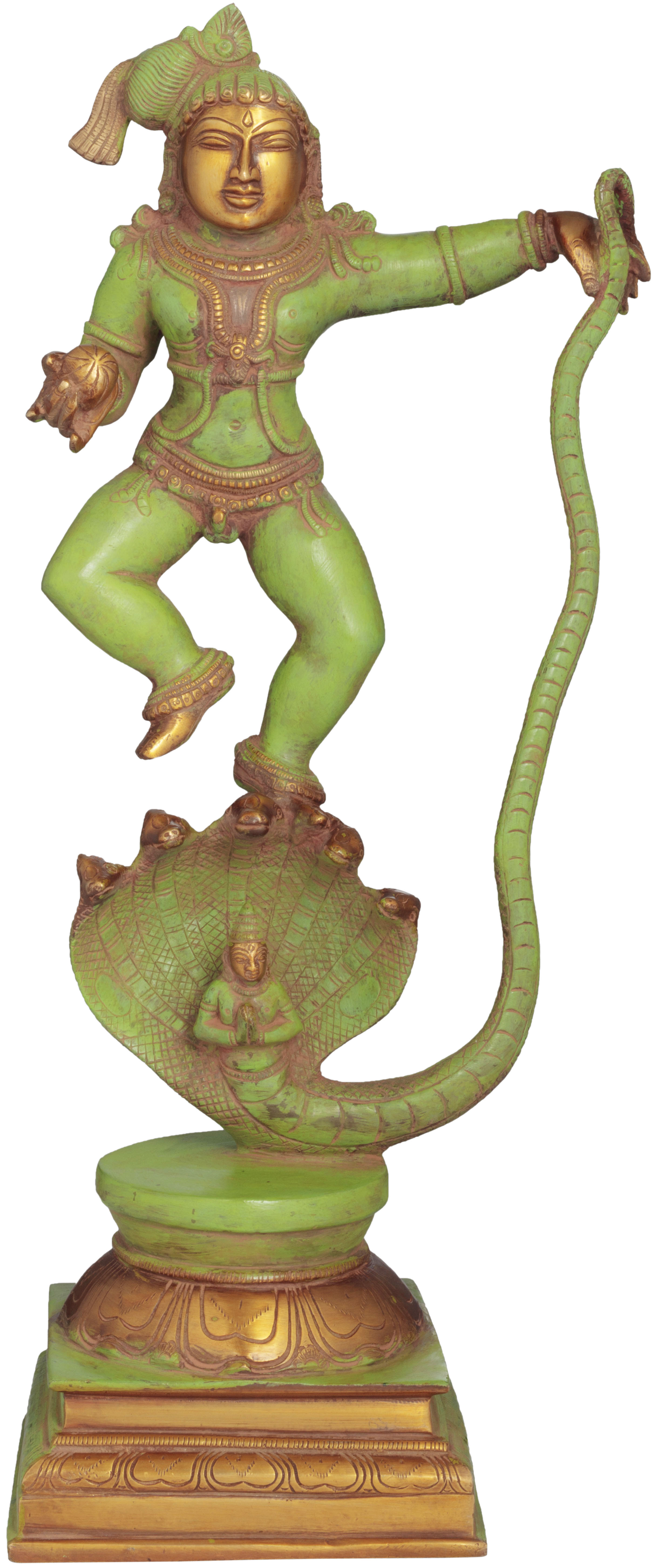 At the bottom of Yamuna, Kaliya had captured Krishna in his large coils. Krishna expanded himself as he forced Kaliya to release him as well as he regained his original form.