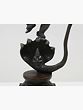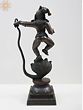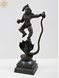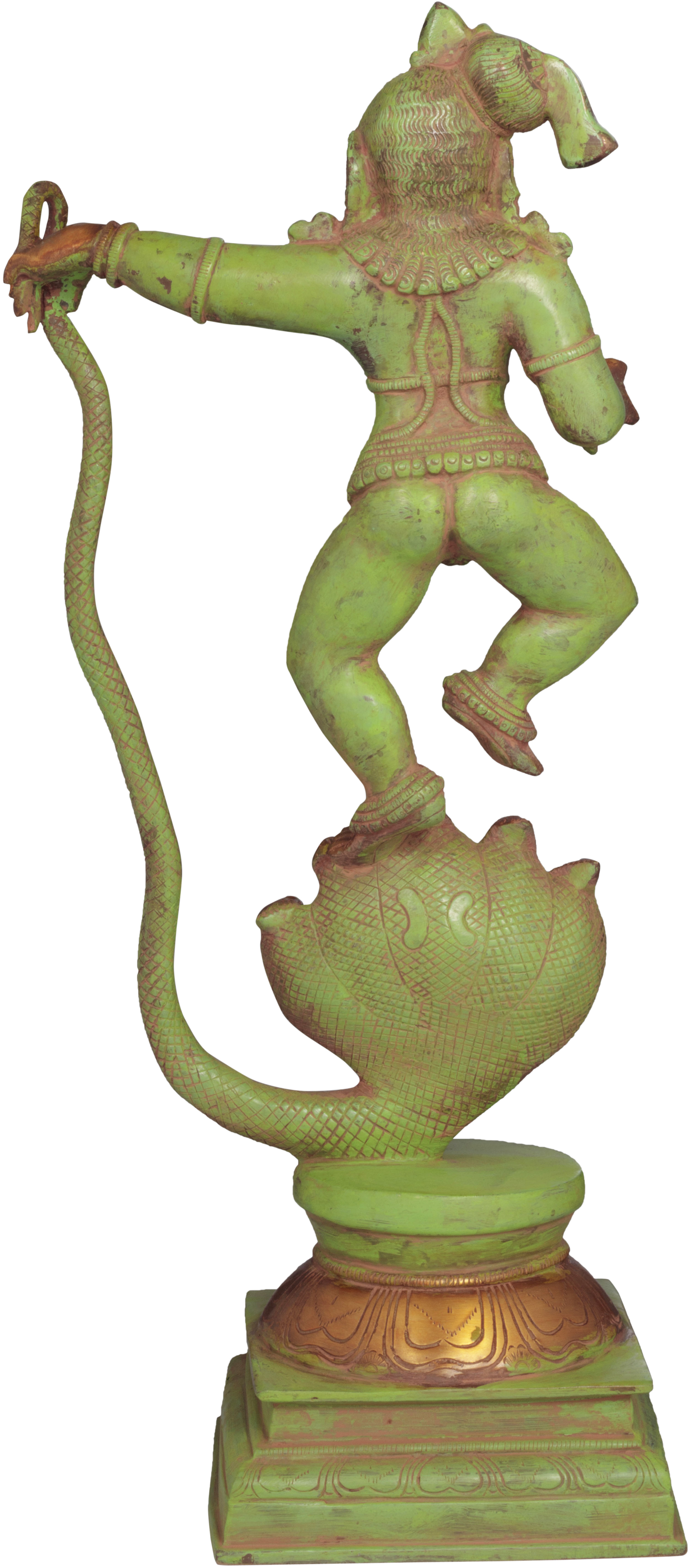 Hence, this posture represents the surrendered Kaliya praying to the supreme Lord and lord is blessing him, as he is also standing above his head holding the rescued ball in his right hand and Kaliya’s tail in his left hand. His right leg is upwards in the the folding position and left feet is placed on the head of Kaliya. The deity is standing on an inverted lotus which is placed on a flat stand, wearing his favourite peacock feather over his head between his jattas.