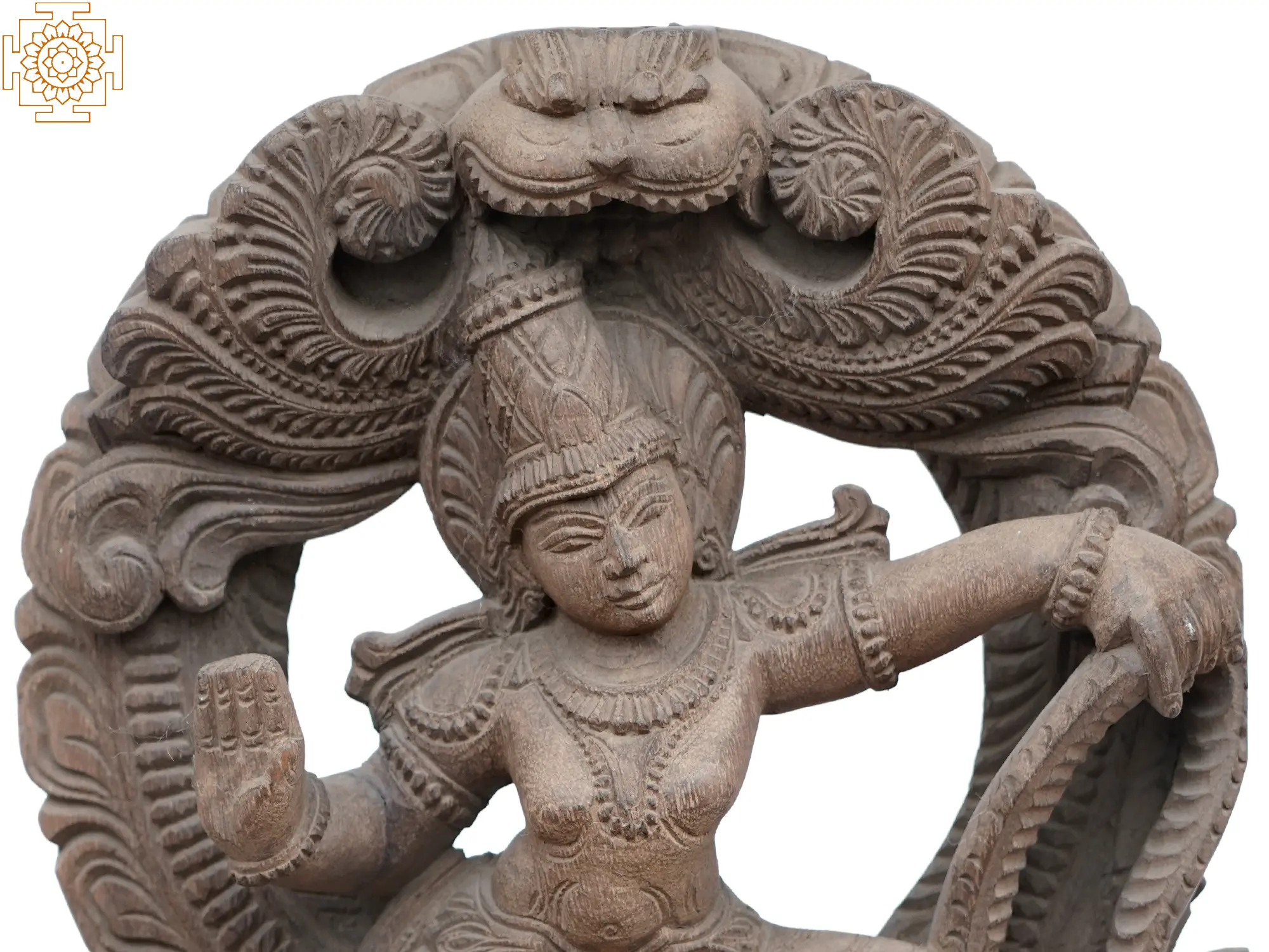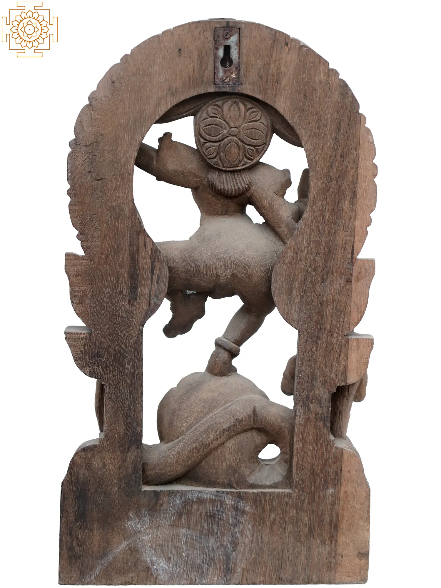 The tilt of Krishna’s head, his hand holding the tail of Kaliya, the positioning of his lower body, and the hand raised in Abhaya mudra, or gesture of fearlessness bring a celestial dynamism to the wooden statute. The grandeur of Kaliya-Krishna is enhanced by the halo with the Kirtimukha motif that surrounds the Lord and the anthropomorphic depiction of Kaliya near His feet, who folds his hands in Anjali mudra, a symbol of self-surrender and devotion.