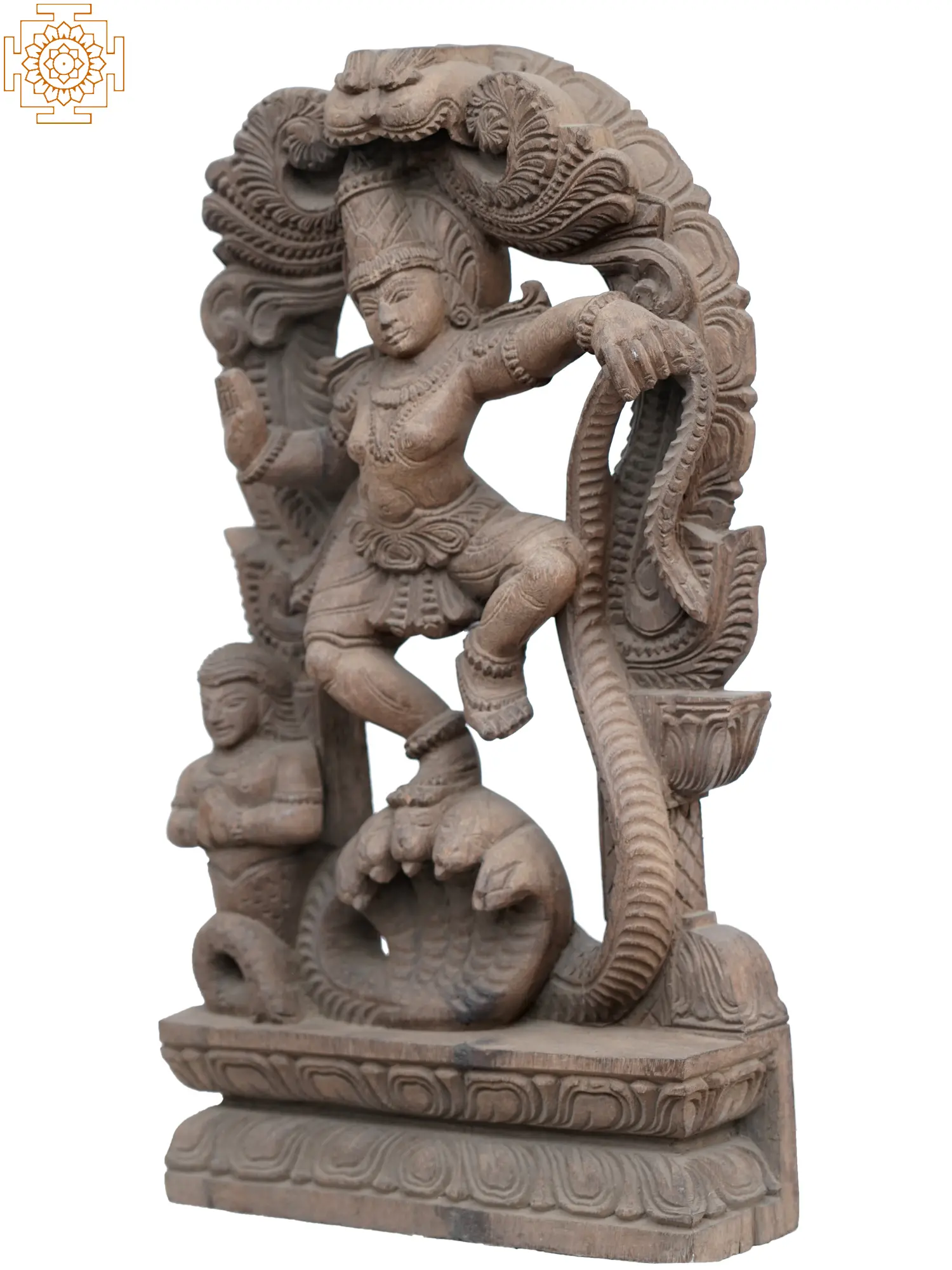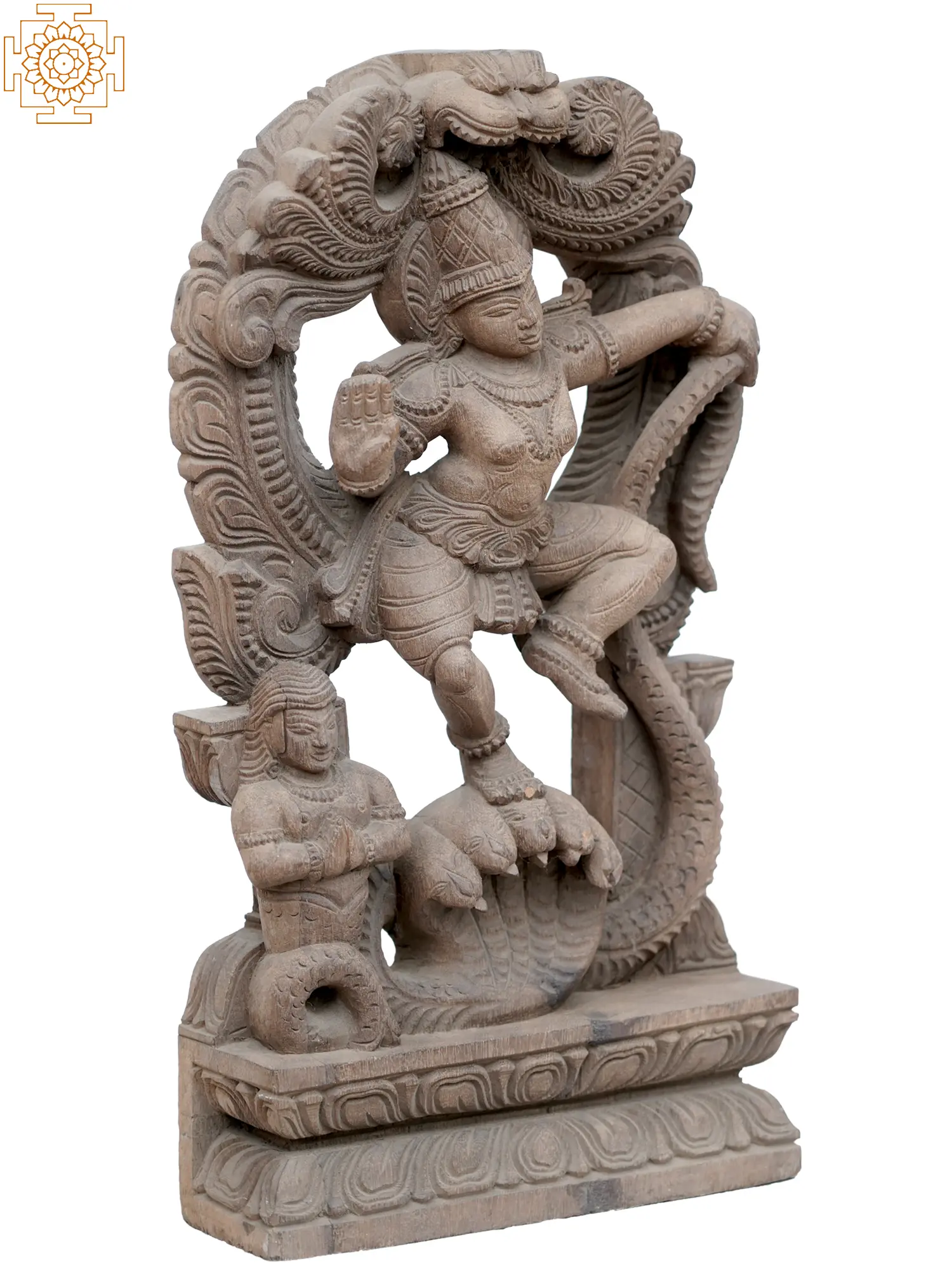 An enchanting union of serenity and stunning movement, Kaliya-Krishna (Krishna dancing of Kaliya serpent) is one of the most beautiful and aesthetically rich artworks in classic Hindu art. This wooden statute of Kaliya-Krishna narrates the legend of Krishna’s victory over the serpent, on whose hoods the child god is majestically dancing, with one leg firmly placed on the hood and the other raised in the air, marking a graceful movement.