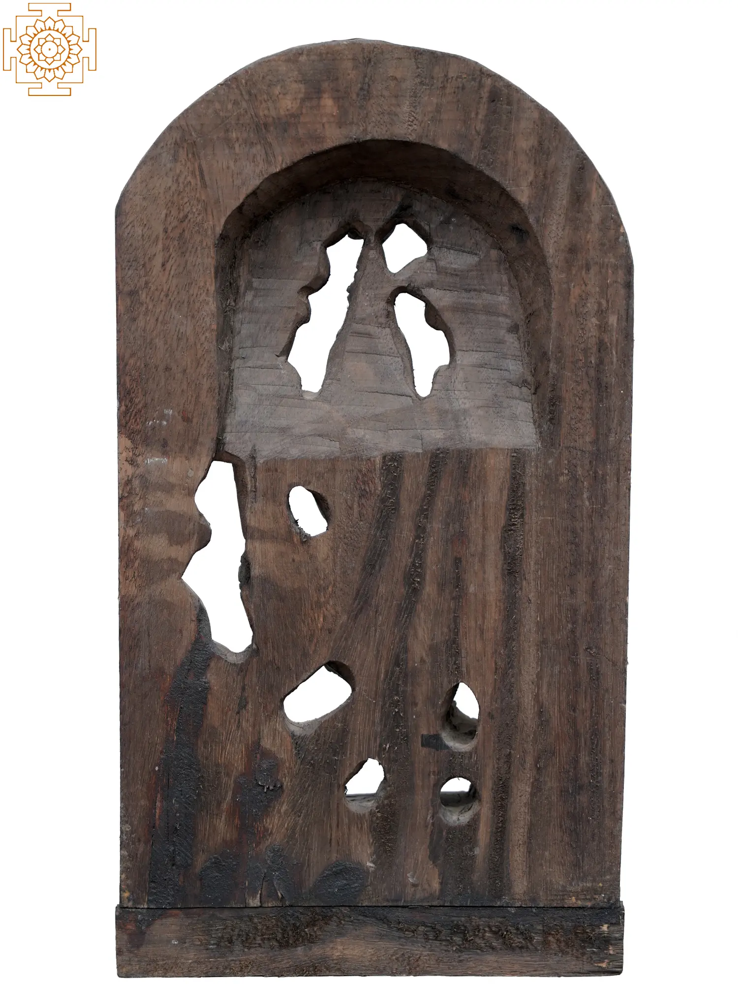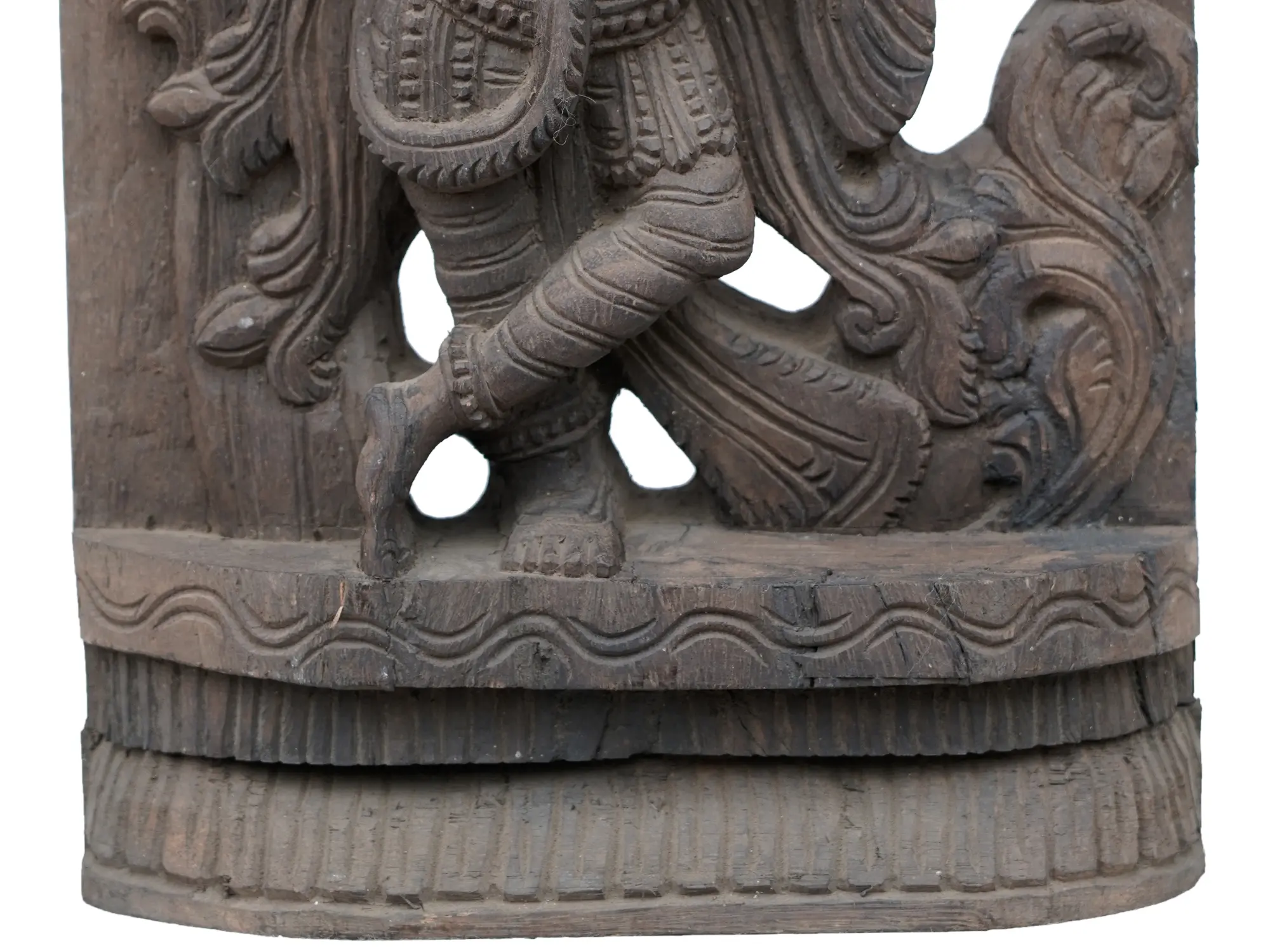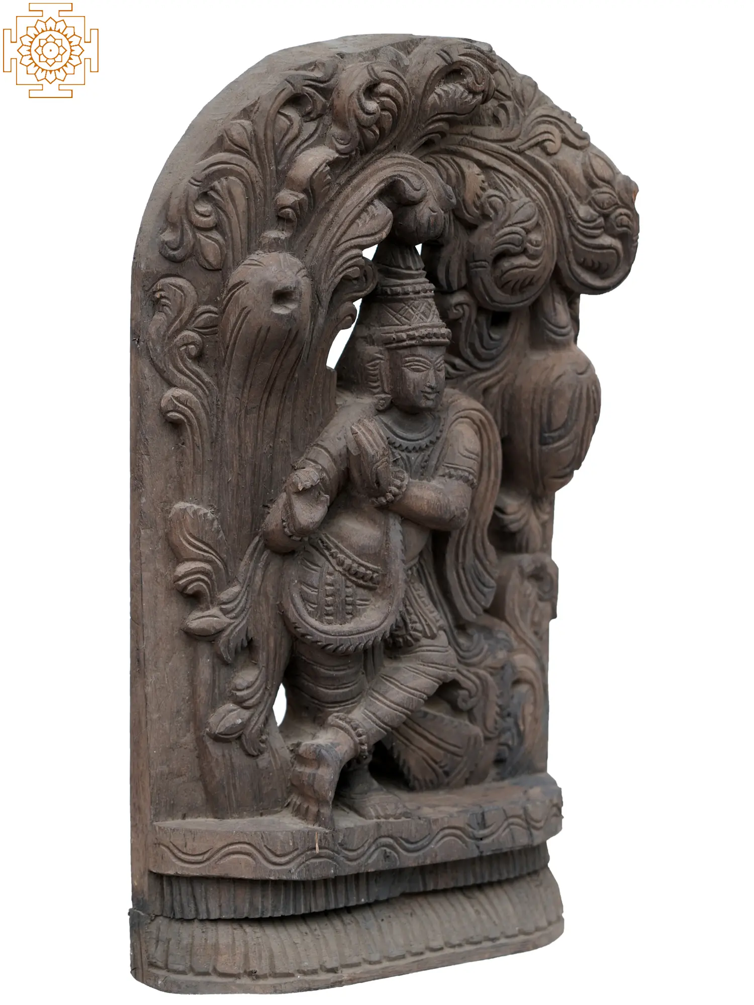 The flow of his garments to his left adds a stunning sense of movement to the wooden statute, which is enhanced by the bustling vines that form the aureole of Krishna. Vegetation in Hindu symbolism is a motif used to express the emergence of life and universe, a perfect addition to the celestial Lila of Krishna, whose sweet flute nurtures the Srishti eternally.