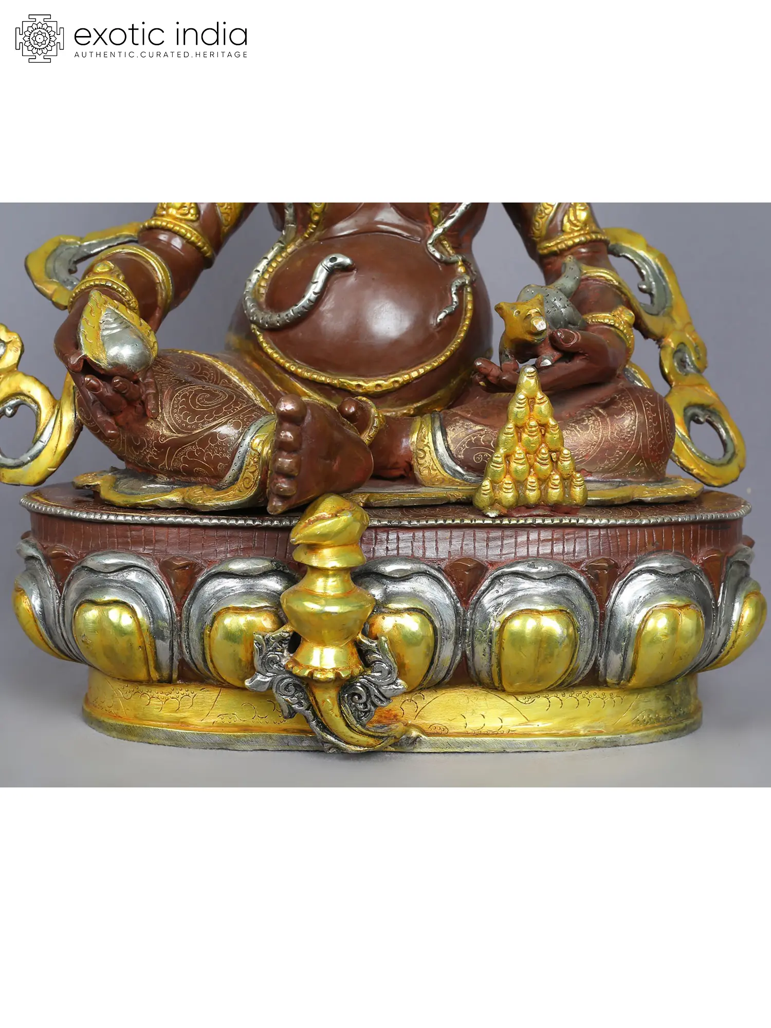 Kubera's striking features include his remarkably large eyes, upturned lips, and a distinctive mustache paired with a beard. A gracefully flowing scarf drapes around his form, while beneath the waist, his body is clad in exquisite, finely woven garments. Notably, he cradles a Mongoose, known as Nakula, in his left hand, symbolizing the benevolent blessings of wealth as it continually emits precious jewels from its mouth.