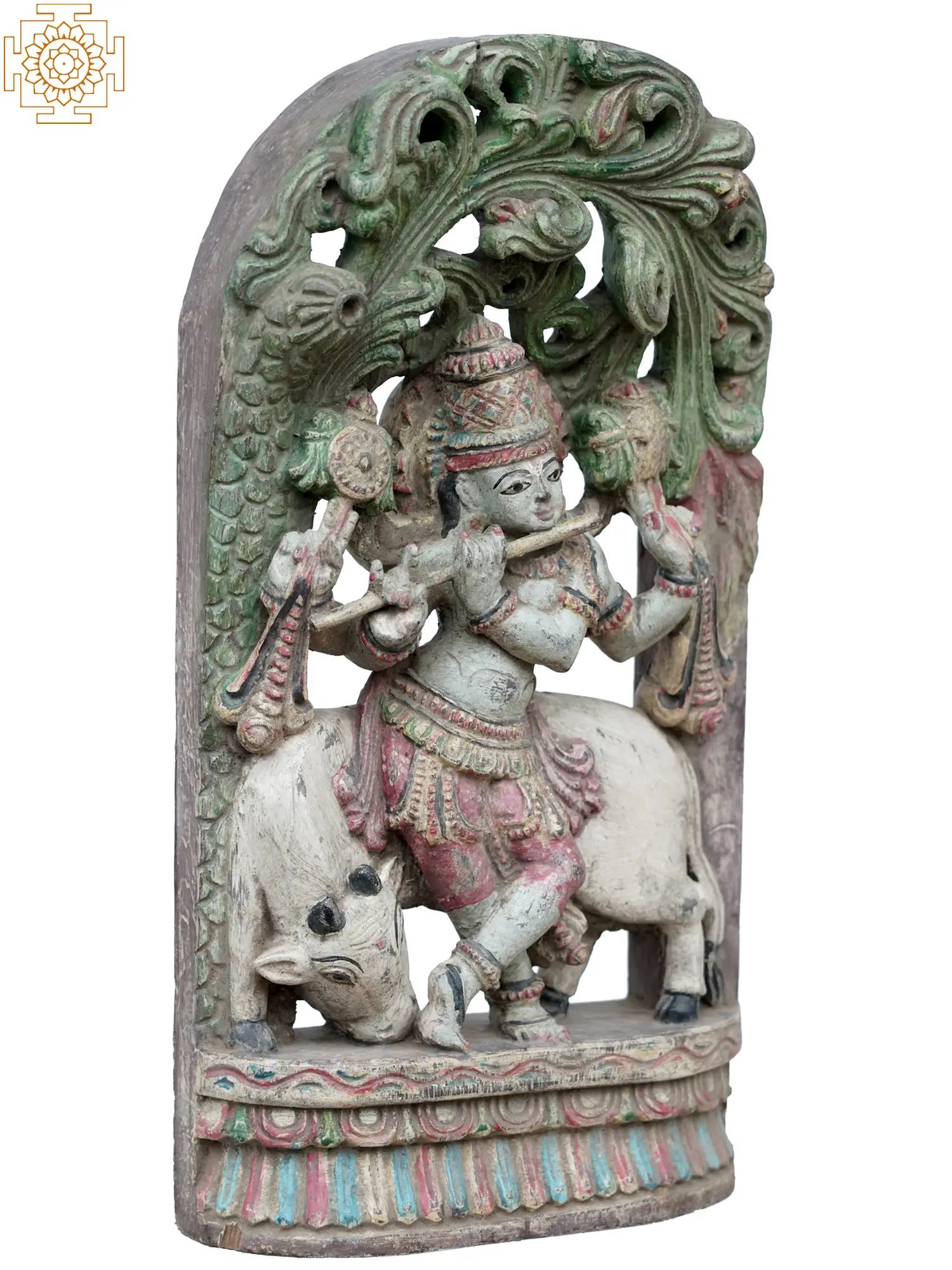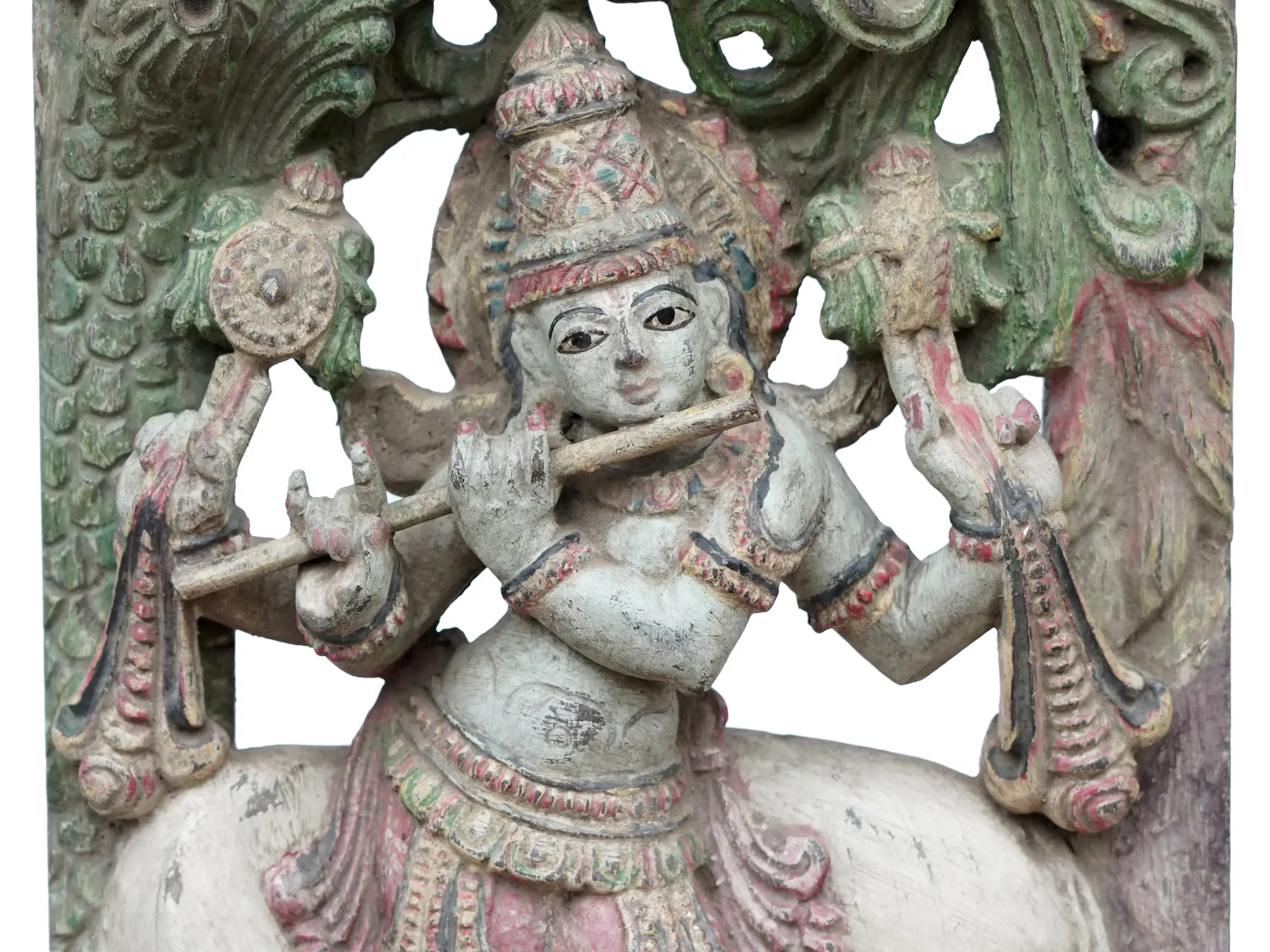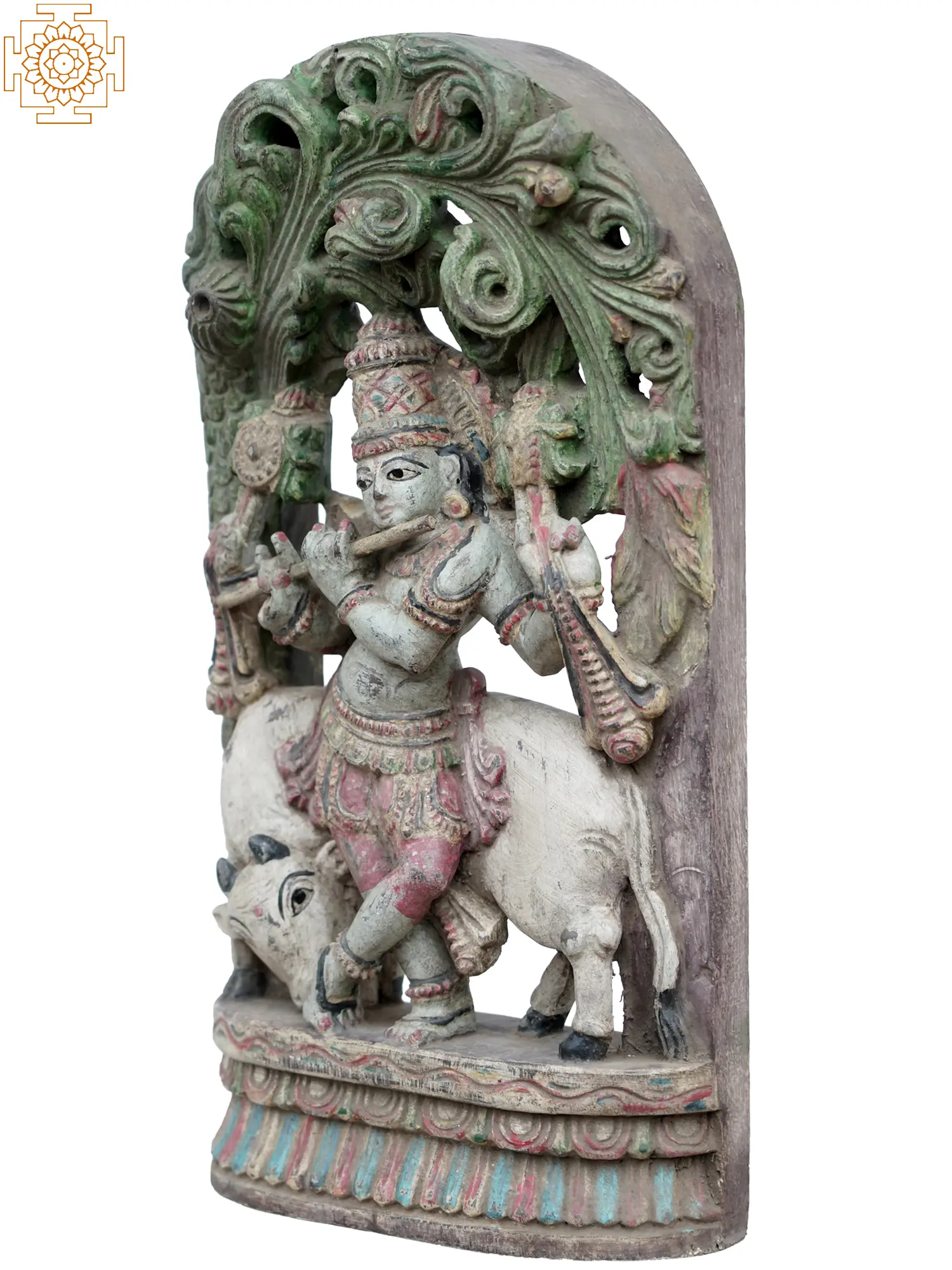Experience the divine melody of lord Venugopal Krishna as he gracefully plays the flute in this exquisite wooden statue. With enchanting beauty and celestial grace, Krishna embodies the essence of love, joy, and divine bliss. His serene countenance and enchanting posture captivate the soul, while the sweet strains of his flute resonate with the rhythms of the universe.