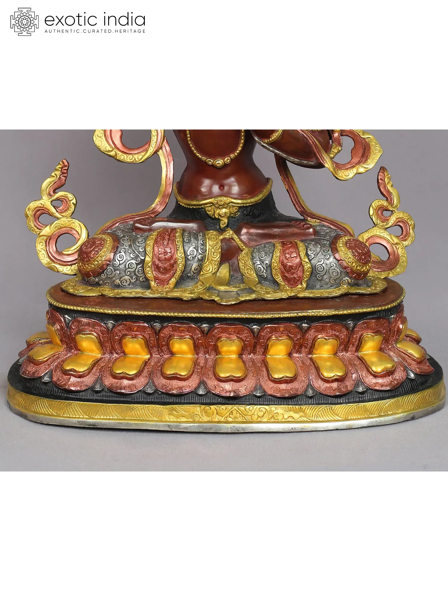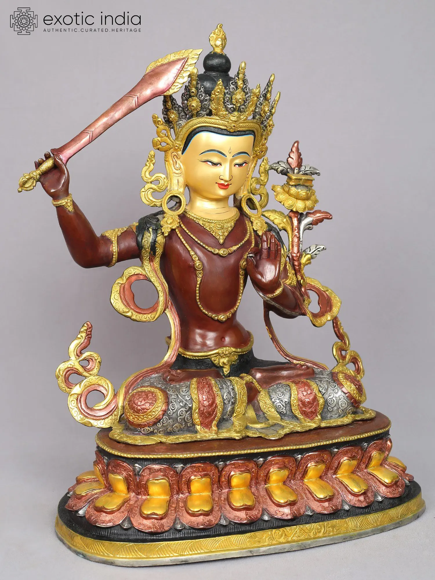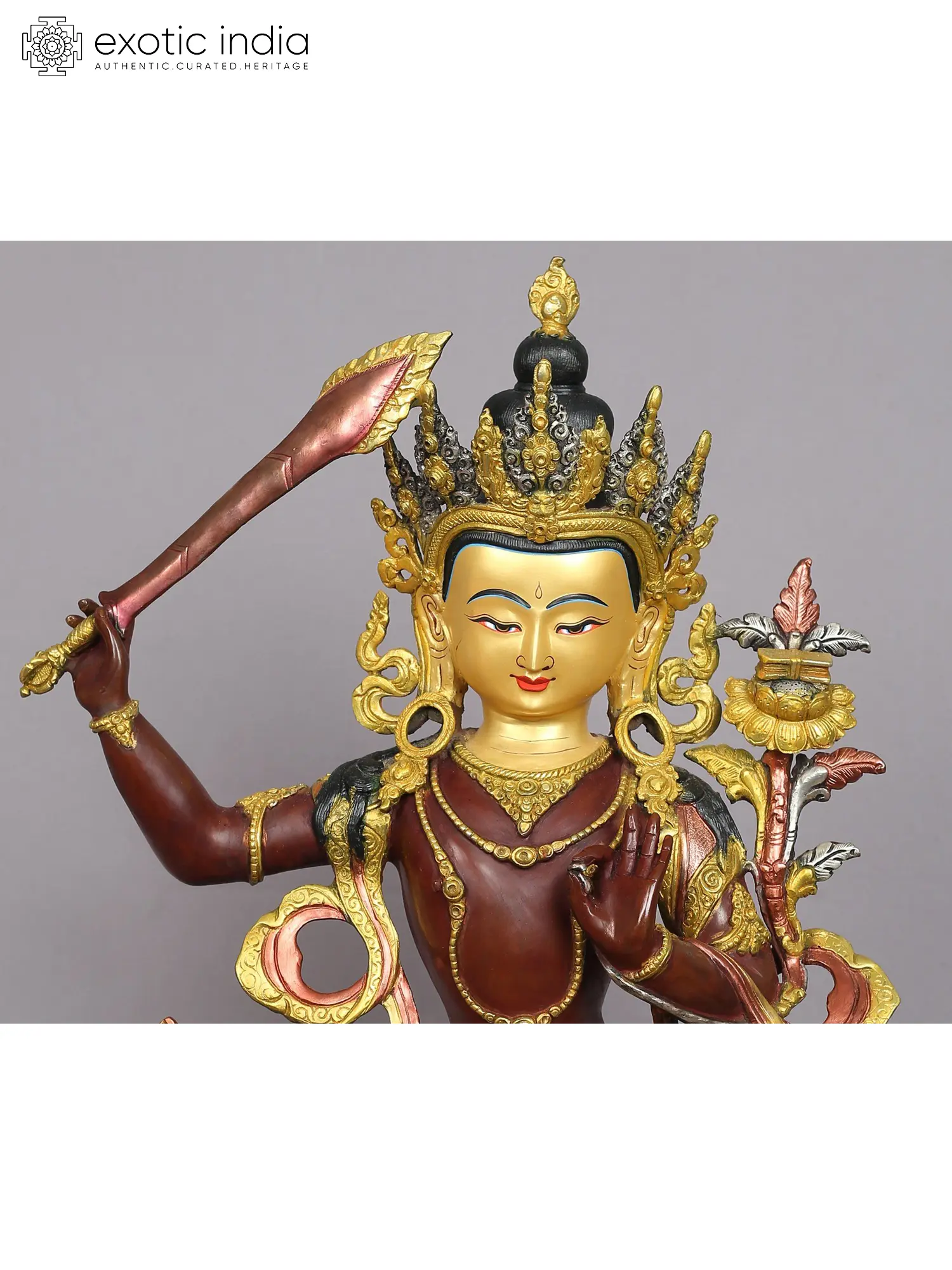 In his right hand, he wields the blazing "Vajra Sword of Discriminating Light," signifying the keenness of wisdom. In his left hand, he gracefully grasps a fully blossomed blue lotus flower. He is believed to serve as a means to sever the bonds of ignorance and untangle the web of conceptual perspectives. The sword, particularly when aflame, symbolizes the illuminating power of transformation.
