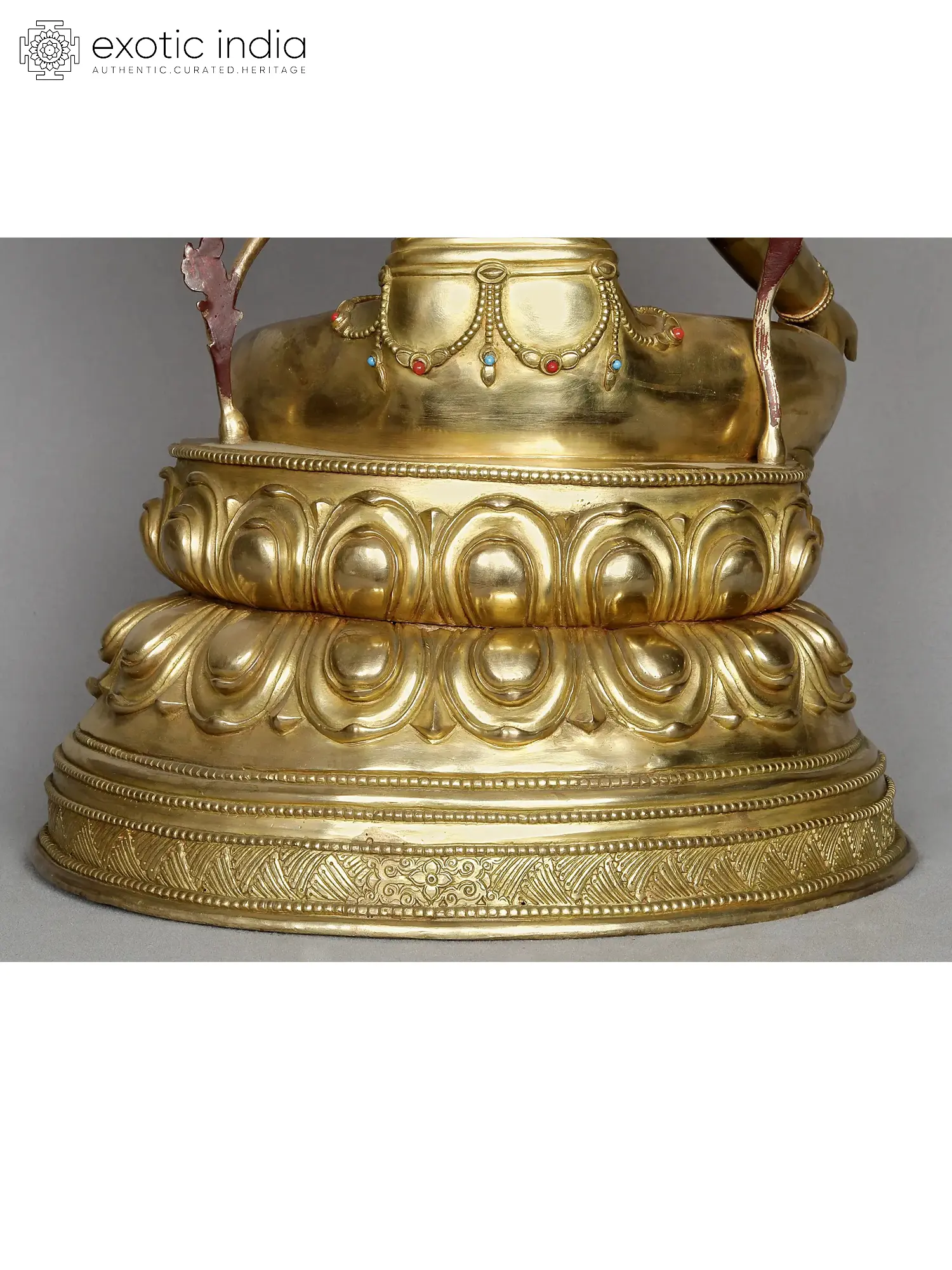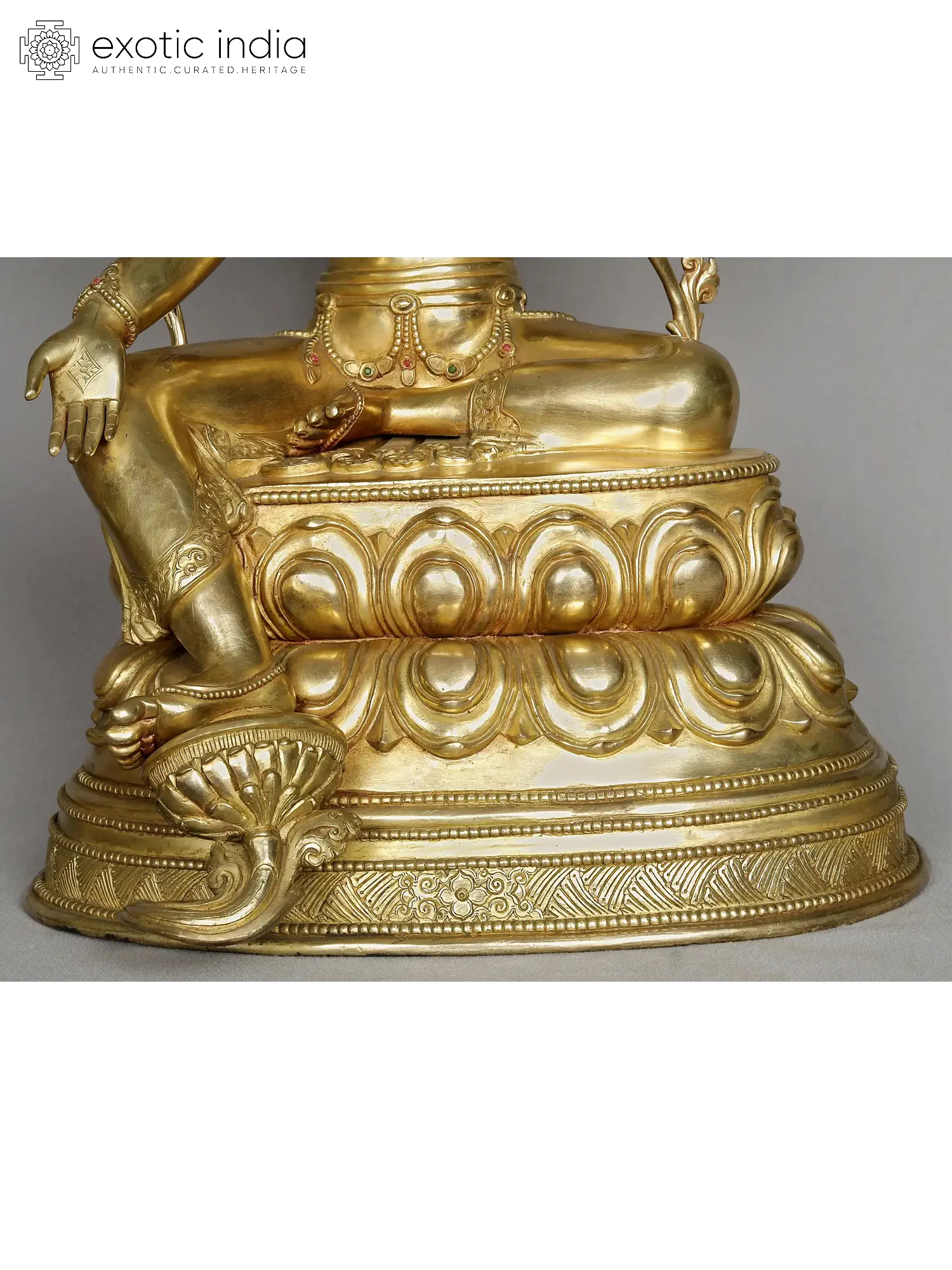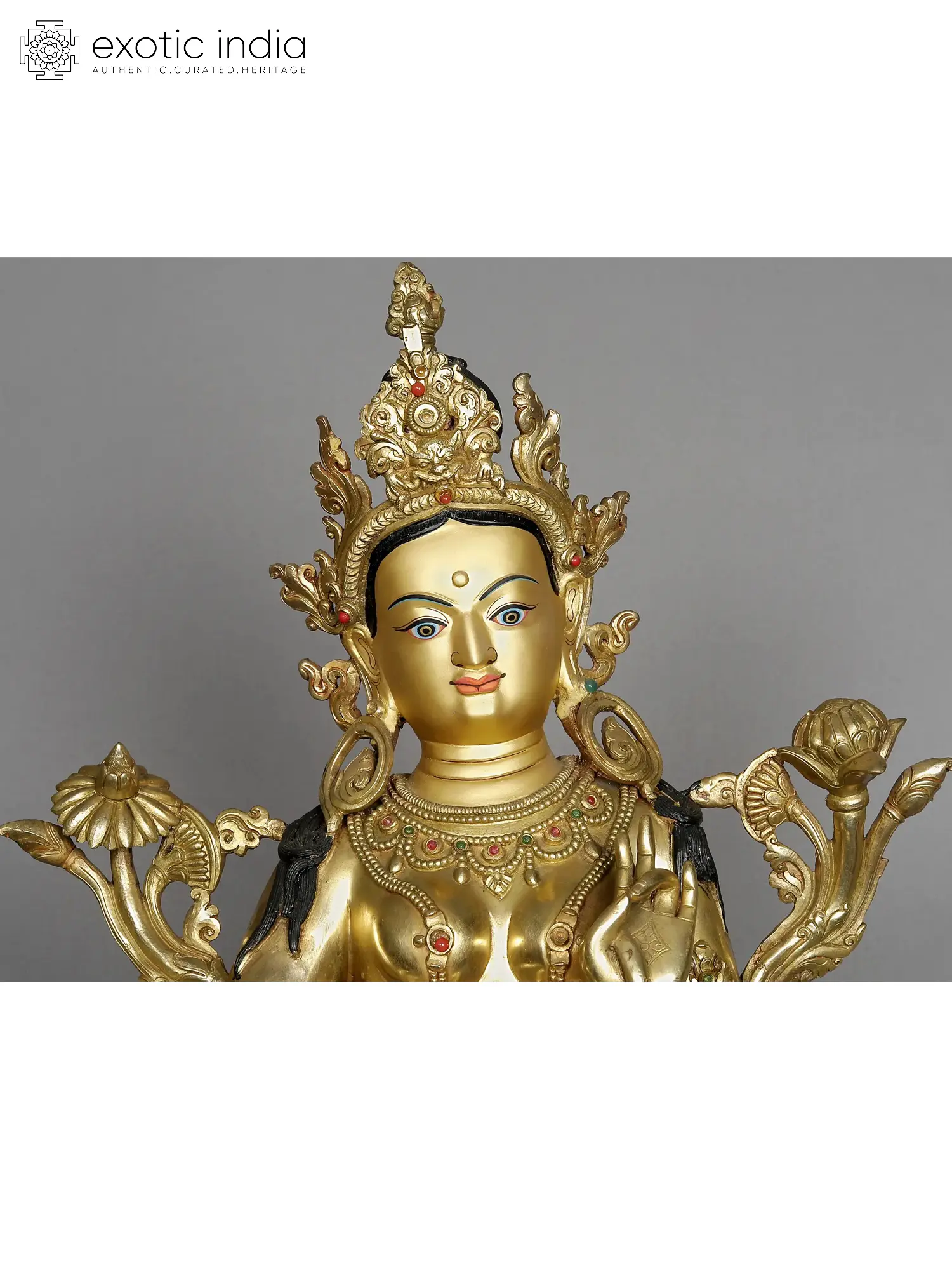 Infused with the balance of voluptuousness and suppleness of Mongolian artworks, this gilded copper Mongolian Tara from Nepal is an example of Buddhism’s journey across the Asian continent. Mongolian Tara is depicted seated on a lotus throne with her right leg hanging down, wearing the ornaments of a bodhisattva. Her face is slightly fierce and her furrowed brow above the eyes of Tara found in Nepalese sculptures, is more active and open in this Mongolian version, giving the icon an energetic appearance. Mongolian Tara is made with copper and gold and her diaphanous attire is more well-defined.